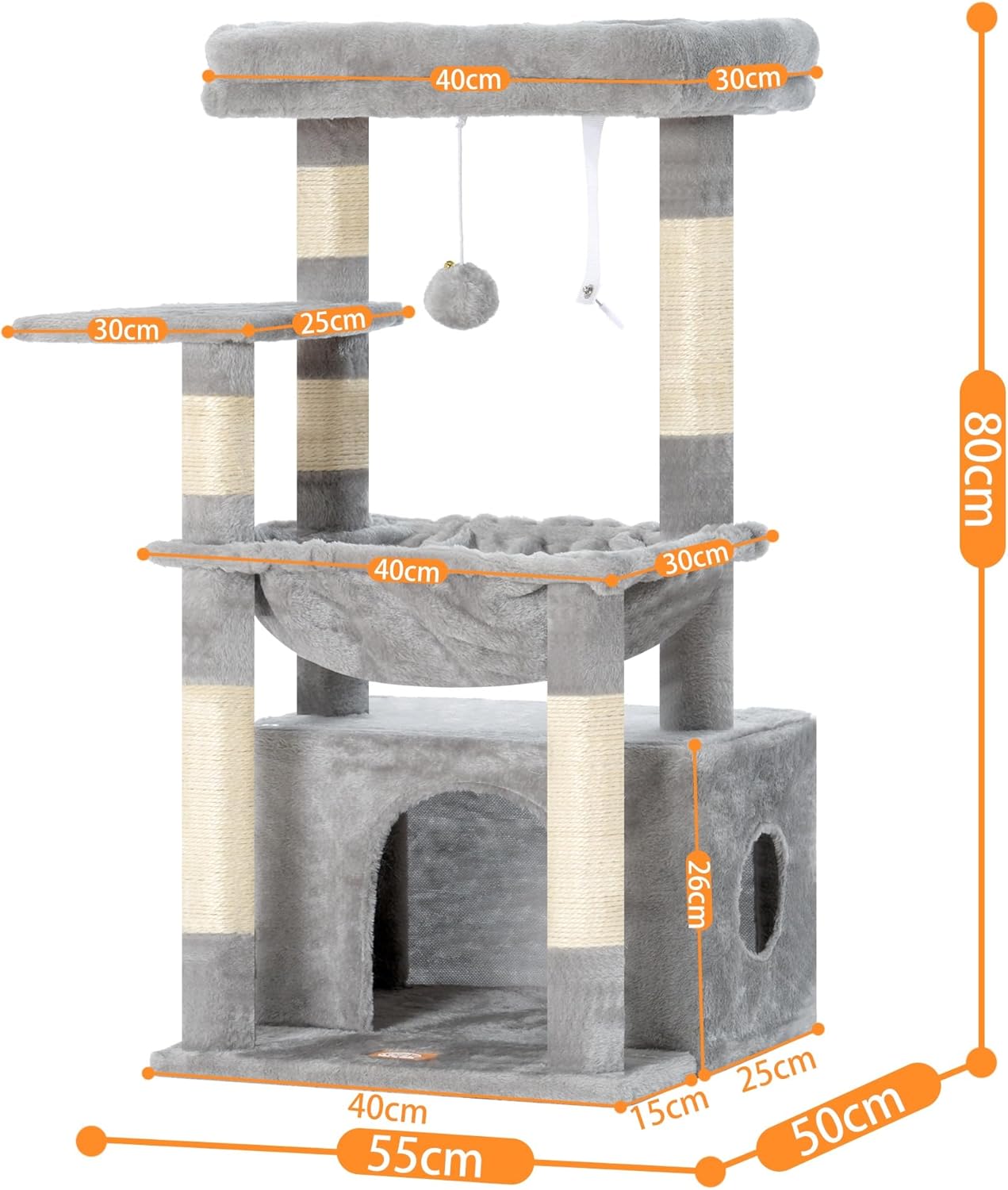 • Изискана структура на продукта: майсторски изработено с обмислен дизайн, това дърво за катерене има гениална многостепенна концепция. Здравата основа позволява на котките лесен достъп до първата платформа.