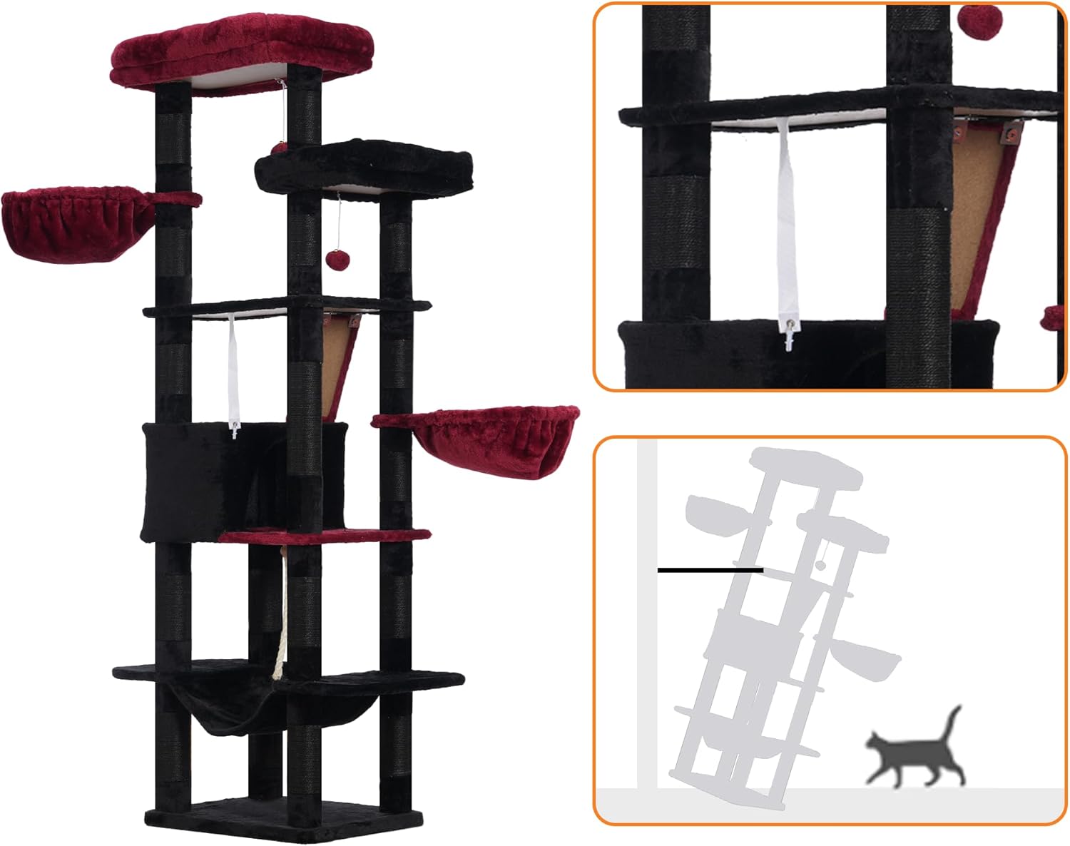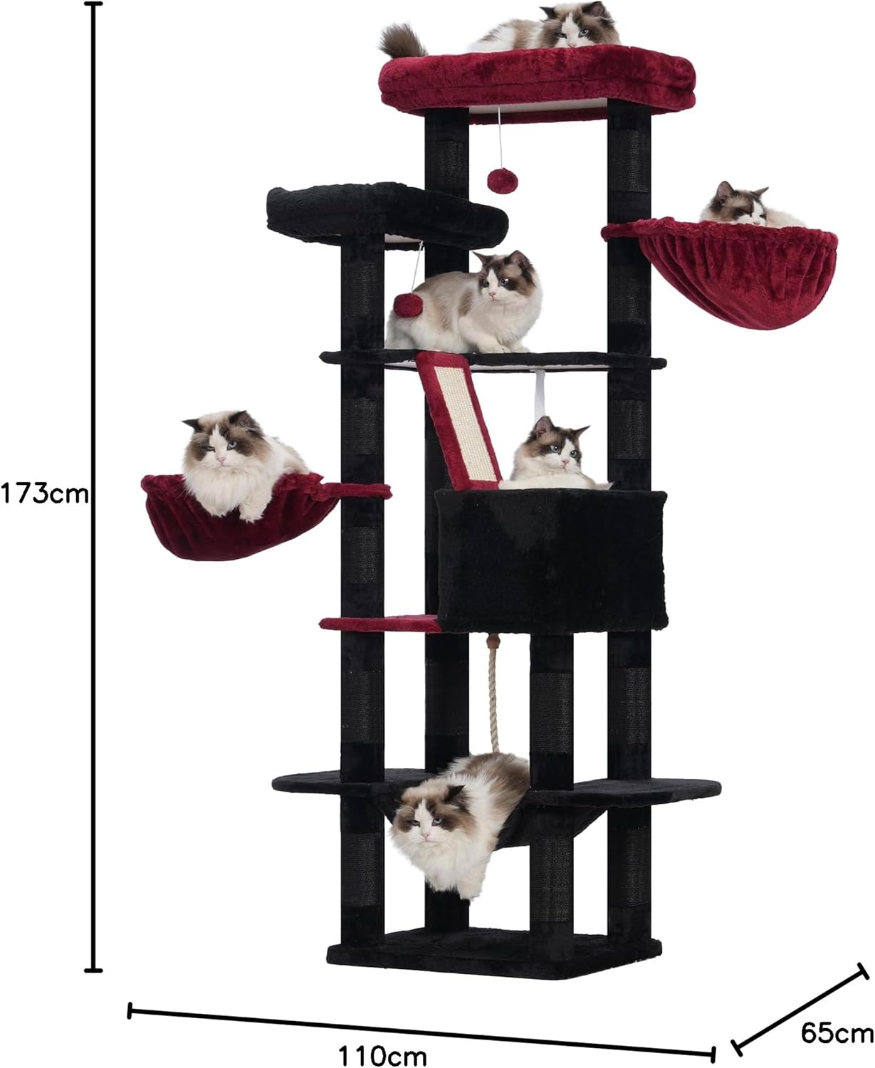 Heybly HCT025BR Дърво за котки с височина 173 см, 16 драскалки, 2 големи платформи, 2 кошници, хамак, пещера, плюшени топки, многоетажна драскалка за котки, черно + червено