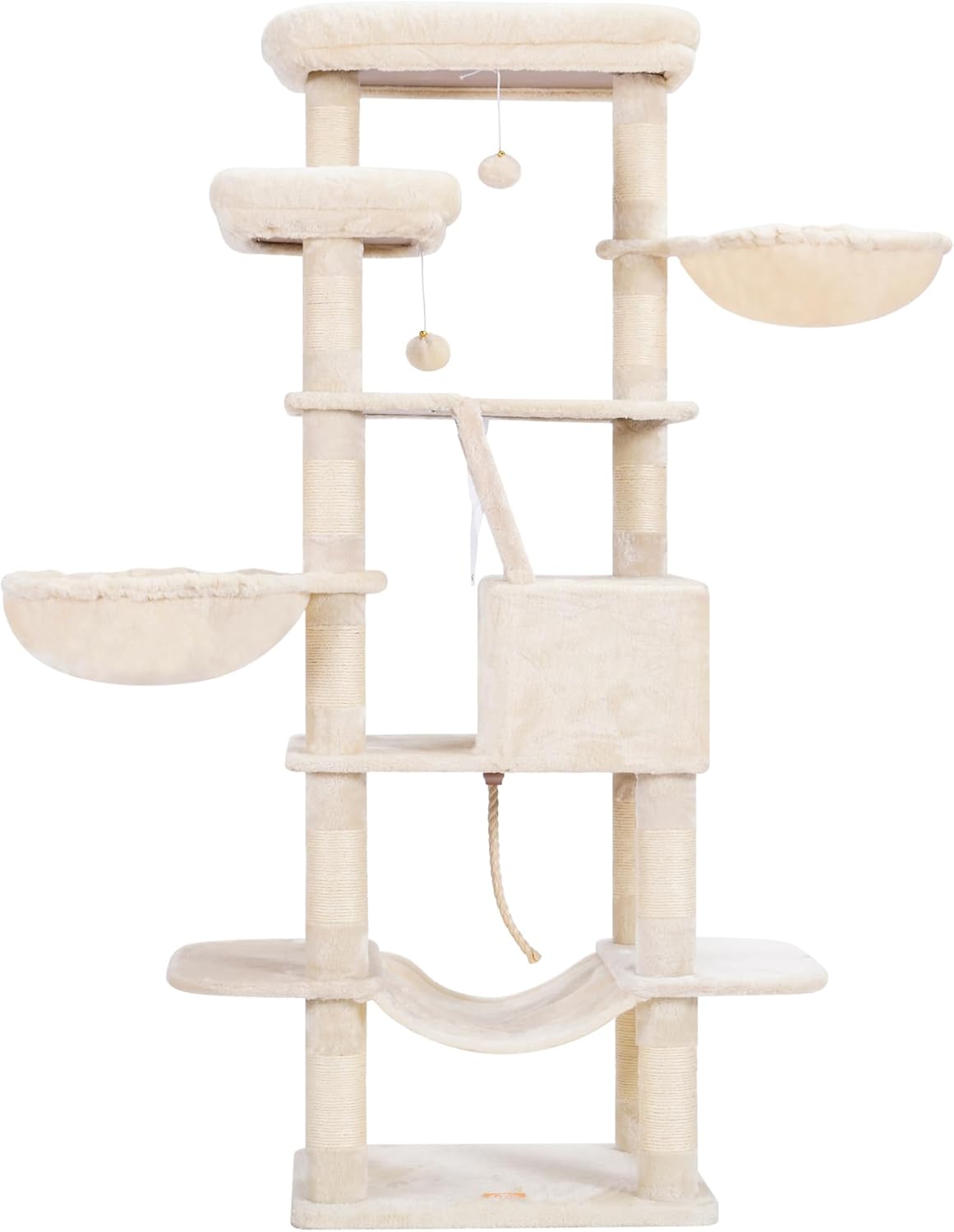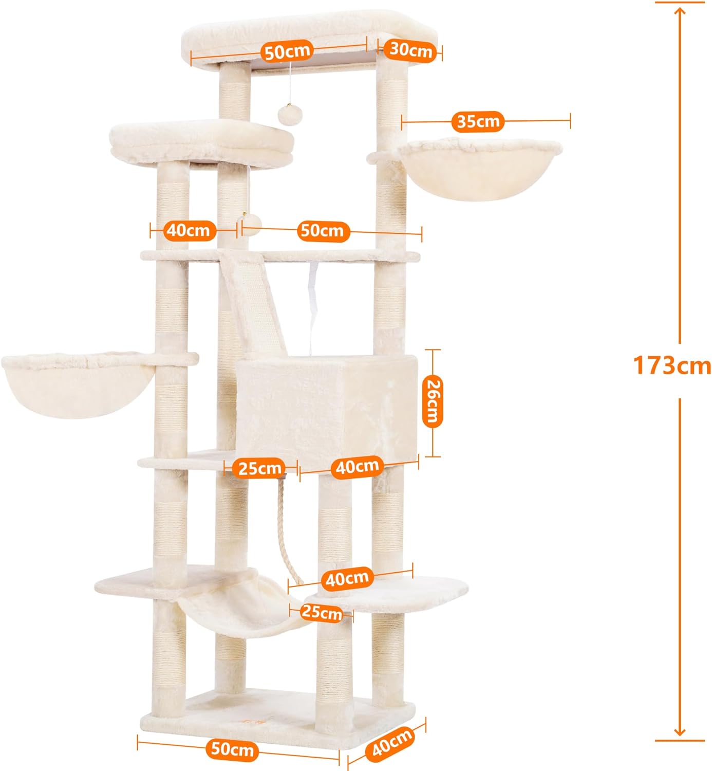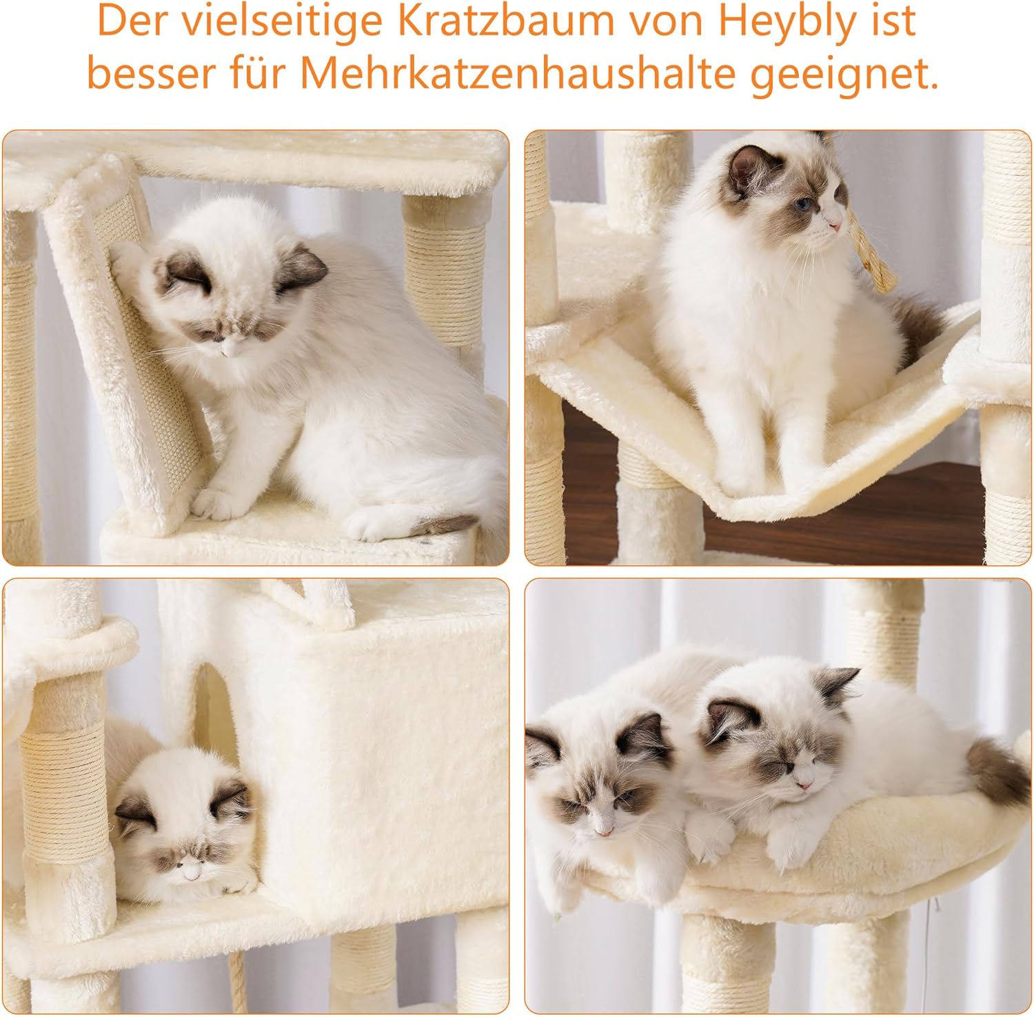 Heybly HCT025M Дърво за котки с височина 173 см, 16 драскалки, 2 големи платформи, 2 кошници, хамак, пещера, плюшени топки, многоетажна драскалка за котки, бежова