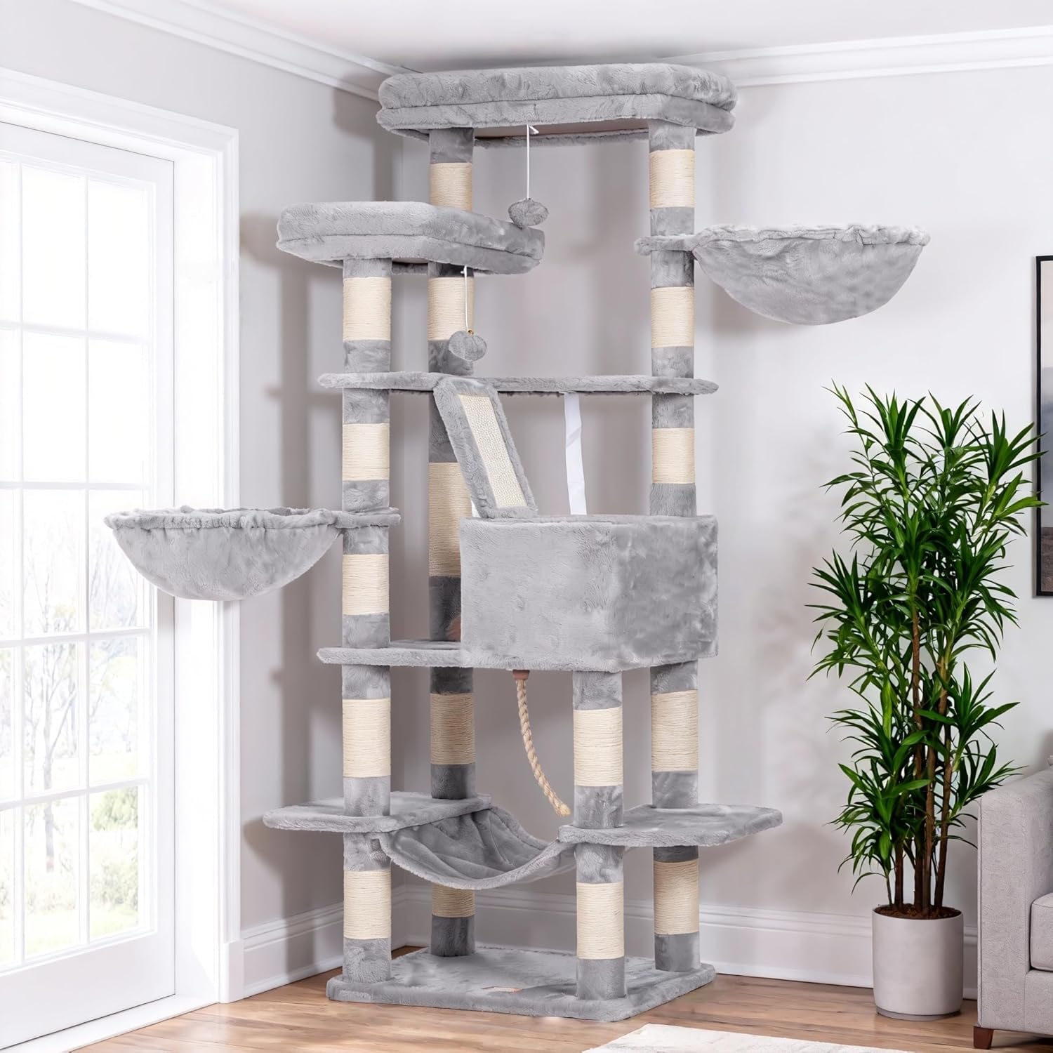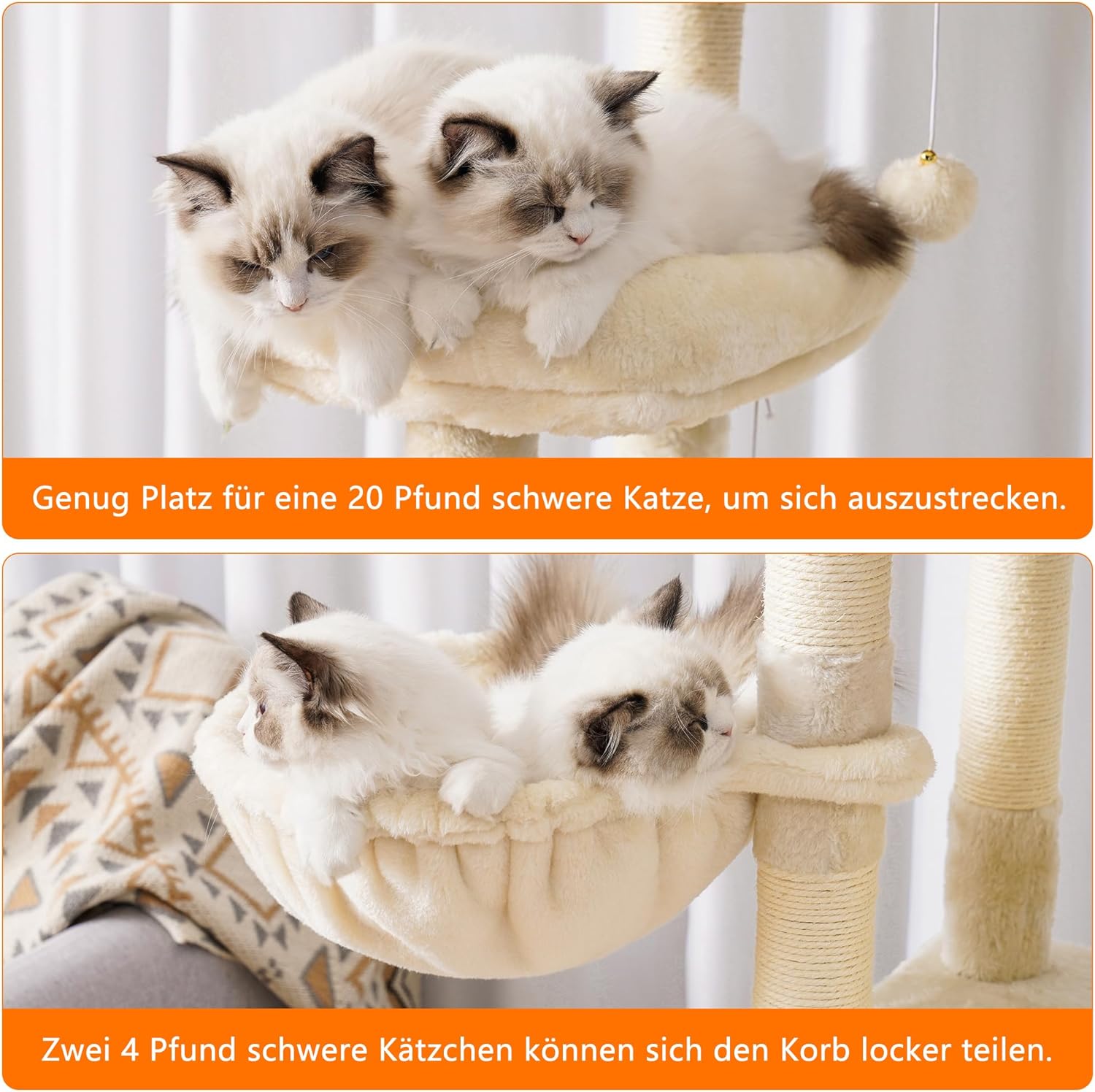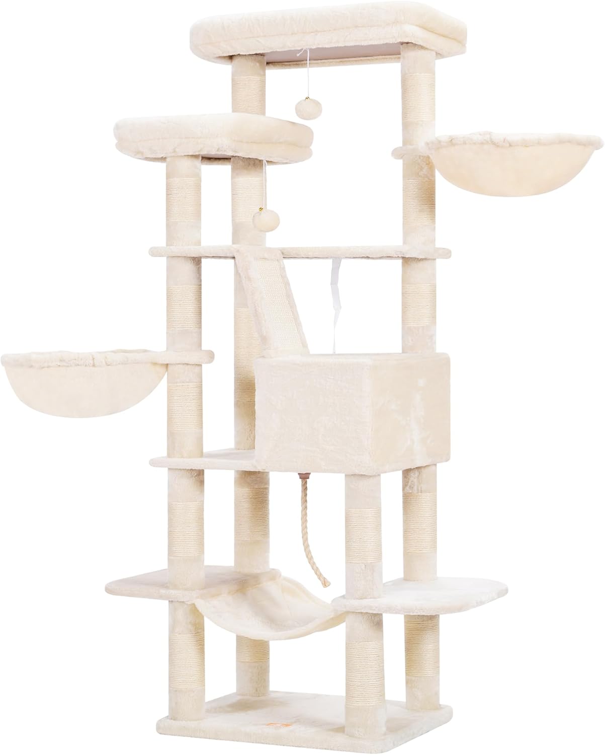 Heybly HCT025M Дърво за котки с височина 173 см, 16 драскалки, 2 големи платформи, 2 кошници, хамак, пещера, плюшени топки, многоетажна драскалка за котки, бежова