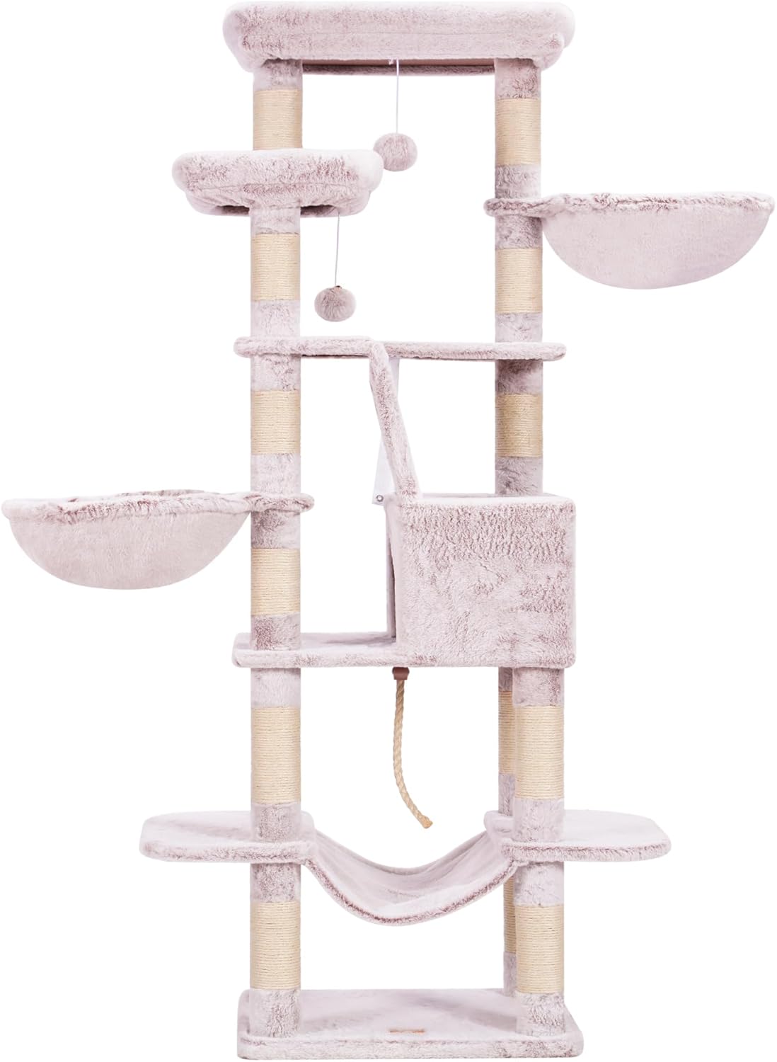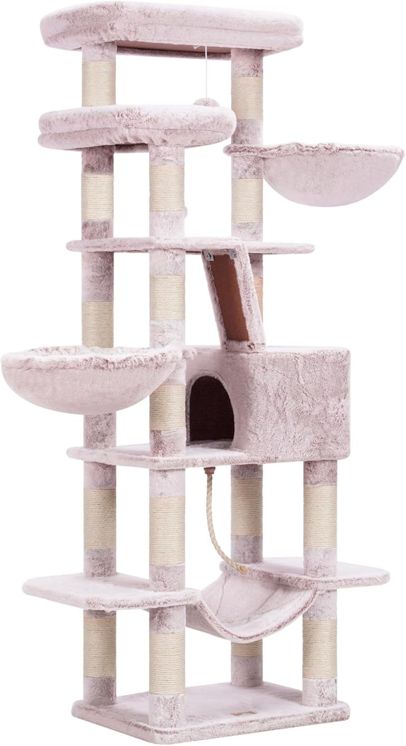 Heybly HCT025MU Драскалка за котки, височина 173 см, с 16 драскалки, 2 големи платформи, 2 кошници, хамак, пещера, плюшени топки, многоетажна драскалка за котки, кафява/бежова