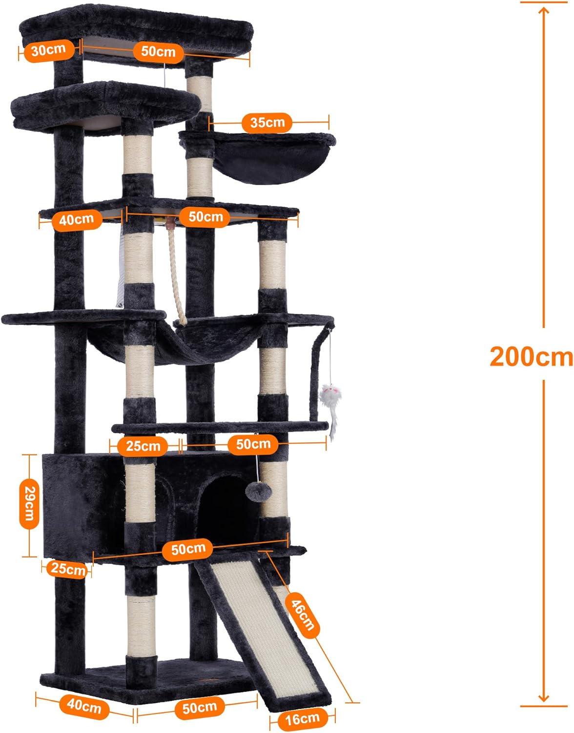 Heybly HCT033G Драскалка за котки, висока 200 см, дърво за котки с 11 драскалки, големи платформи, 2 кошници, хамак, пещера, плюшени топки, многоетажна драскалка за котки, опушено сива