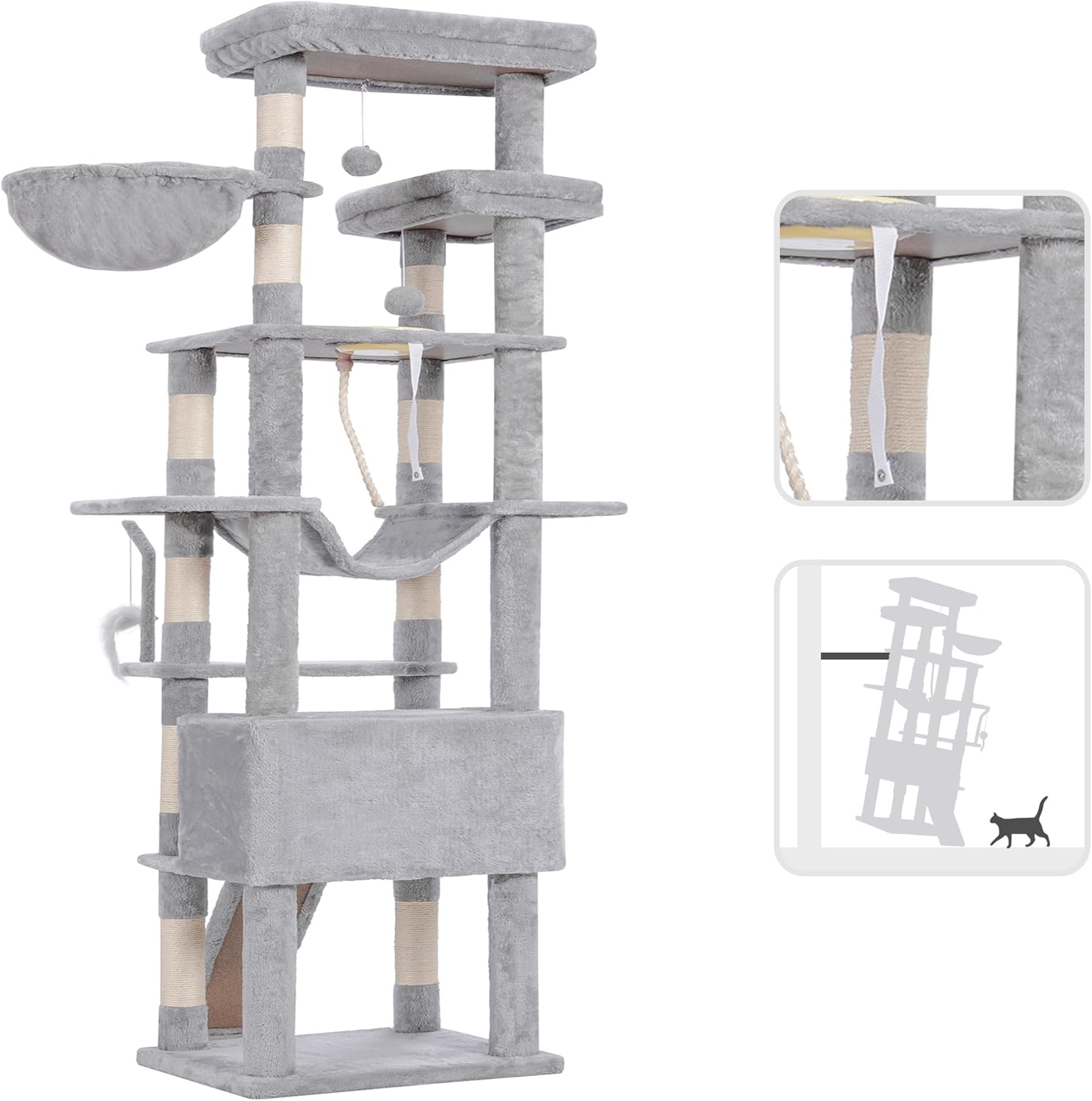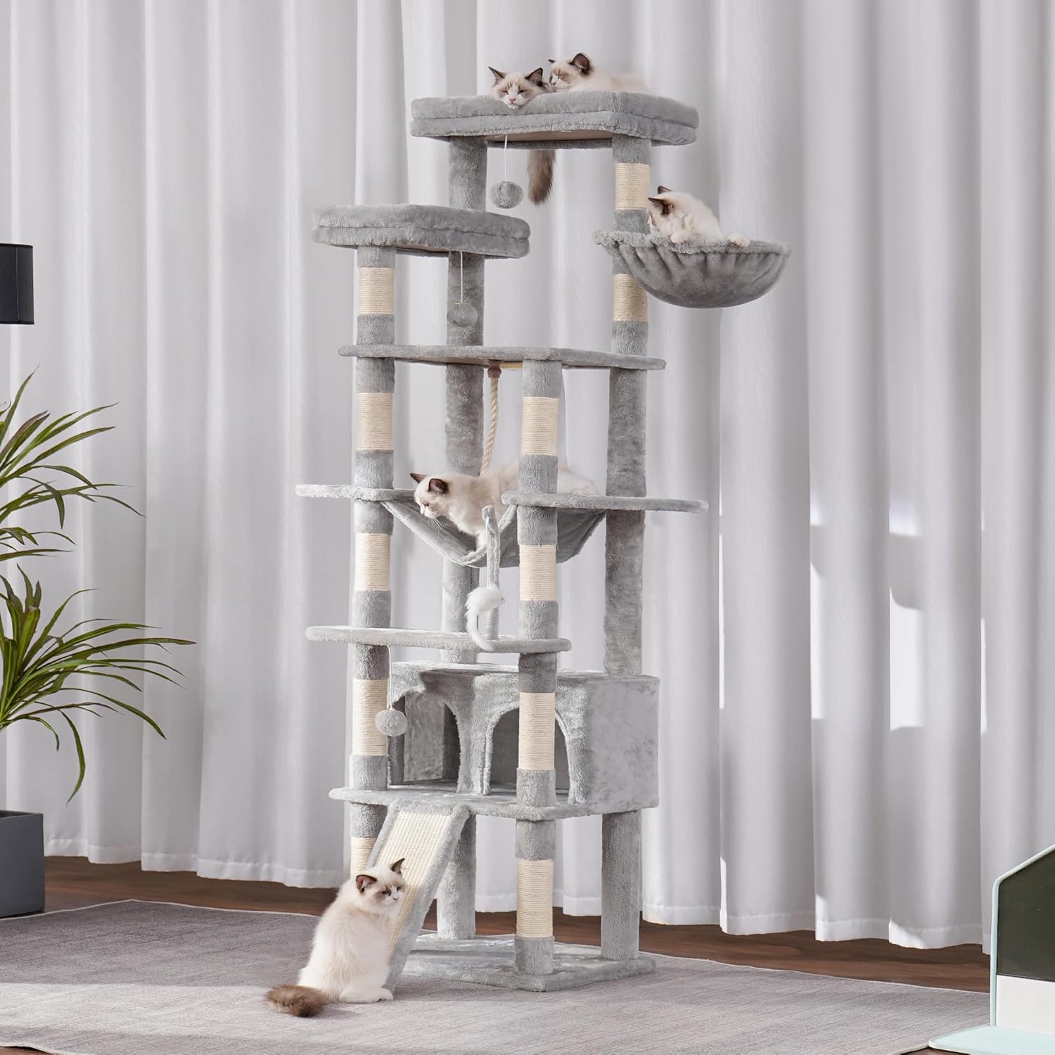 Heybly HCT033W Драскалка за котки с височина 200 см и 11 драскалки, големи платформи, 2 кошници, хамак, пещера, плюшени топки, многоетажна, светло сива