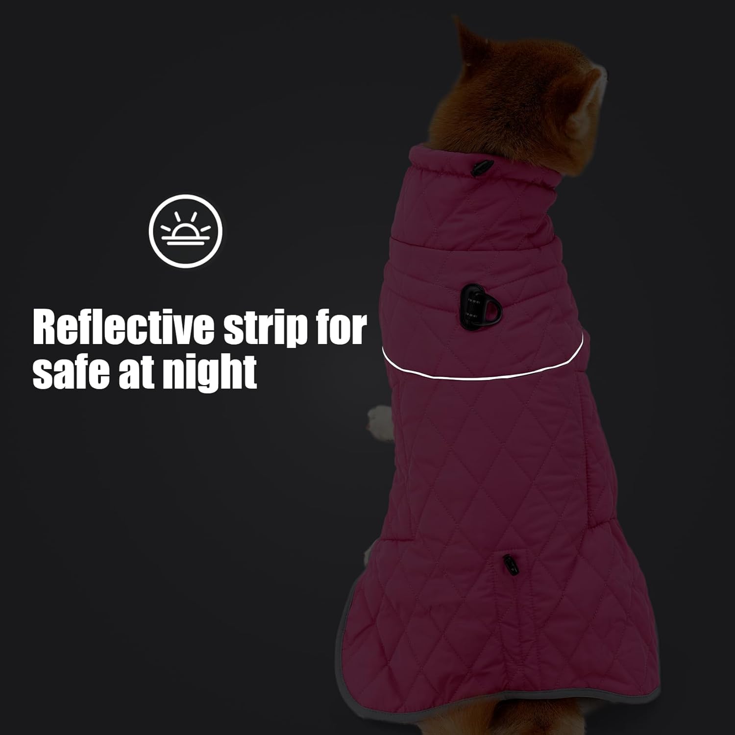 • **СВЕТЛООТРАЖИТЕЛНИ ЛЕНТИ ЗА БЕЗОПАСНОСТ ПРЕЗ НОЩТА**: Оборудвано със светлоотразителни ленти, това водоустойчиво яке за кучета подобрява видимостта по време на нощни разходки и гарантира, че вашият пухкав приятел е в безопасност при слабо осветени условия. Палтото за кучета е оборудвано с еластични задни бримки за краката, които държат якето близо до тялото, докато тича и играе.