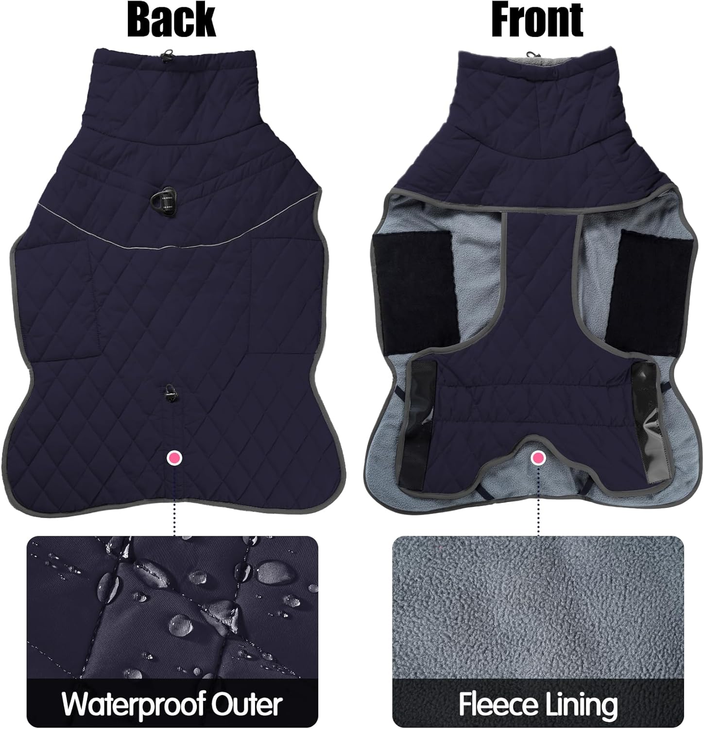 • **СВЕТЛООТРАЖИТЕЛНИ ЛЕНТИ ЗА БЕЗОПАСНОСТ ПРЕЗ НОЩТА**: Оборудвано със светлоотразителни ленти, това водоустойчиво яке за кучета подобрява видимостта по време на нощни разходки и гарантира, че вашият пухкав приятел е в безопасност при слабо осветени условия. Палтото за кучета е оборудвано с еластични задни бримки за краката, които държат якето близо до тялото, докато тича и играе.