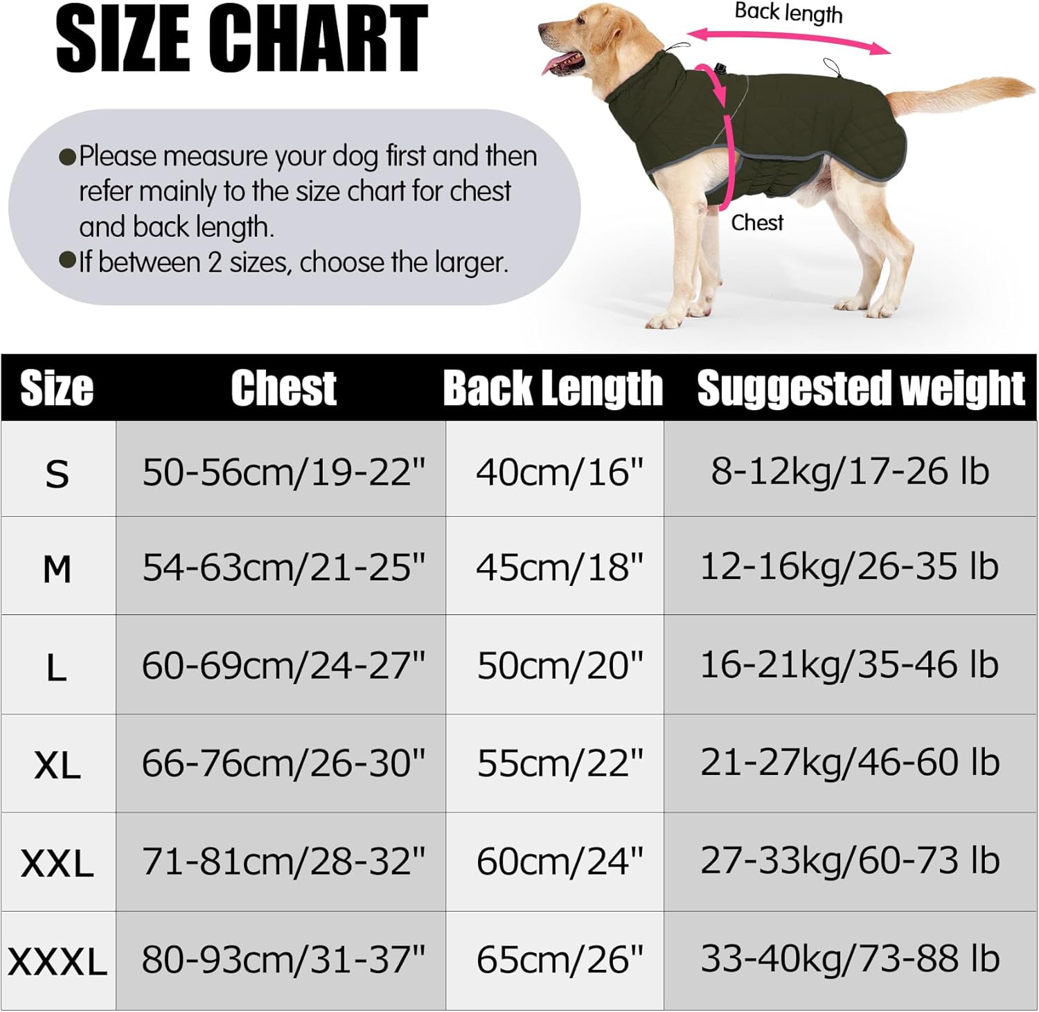 • **НАЛИЧНИ РАЗМЕРИ**: Водоустойчивото и топло палто за кучета се предлага в 6 размера от S до XXXL, така че е подходящо за малки, средни и големи кучета. Моля, първо измерете кучето си и вижте таблицата с размери за дължина на гърдите и гърба. Ако не сте съгласни с различните размери, изберете по-големия.