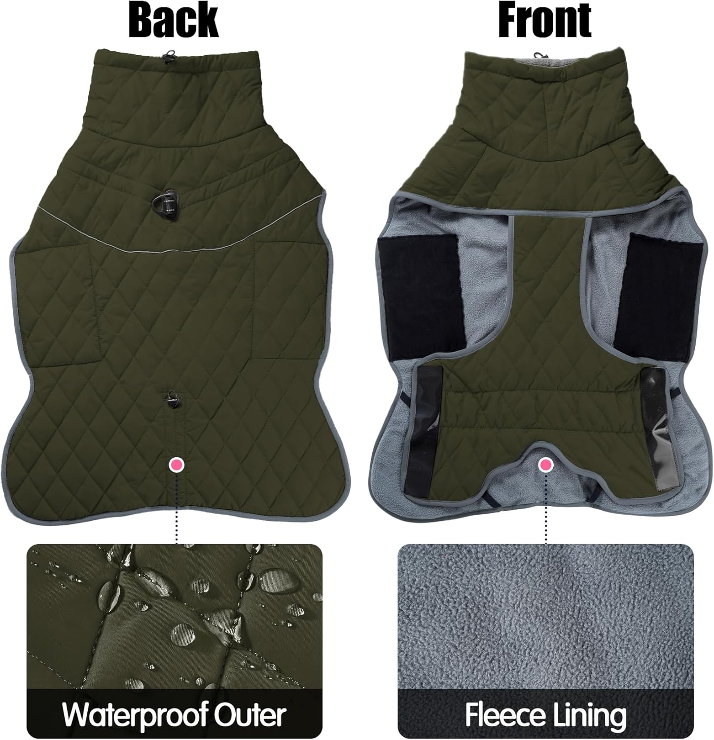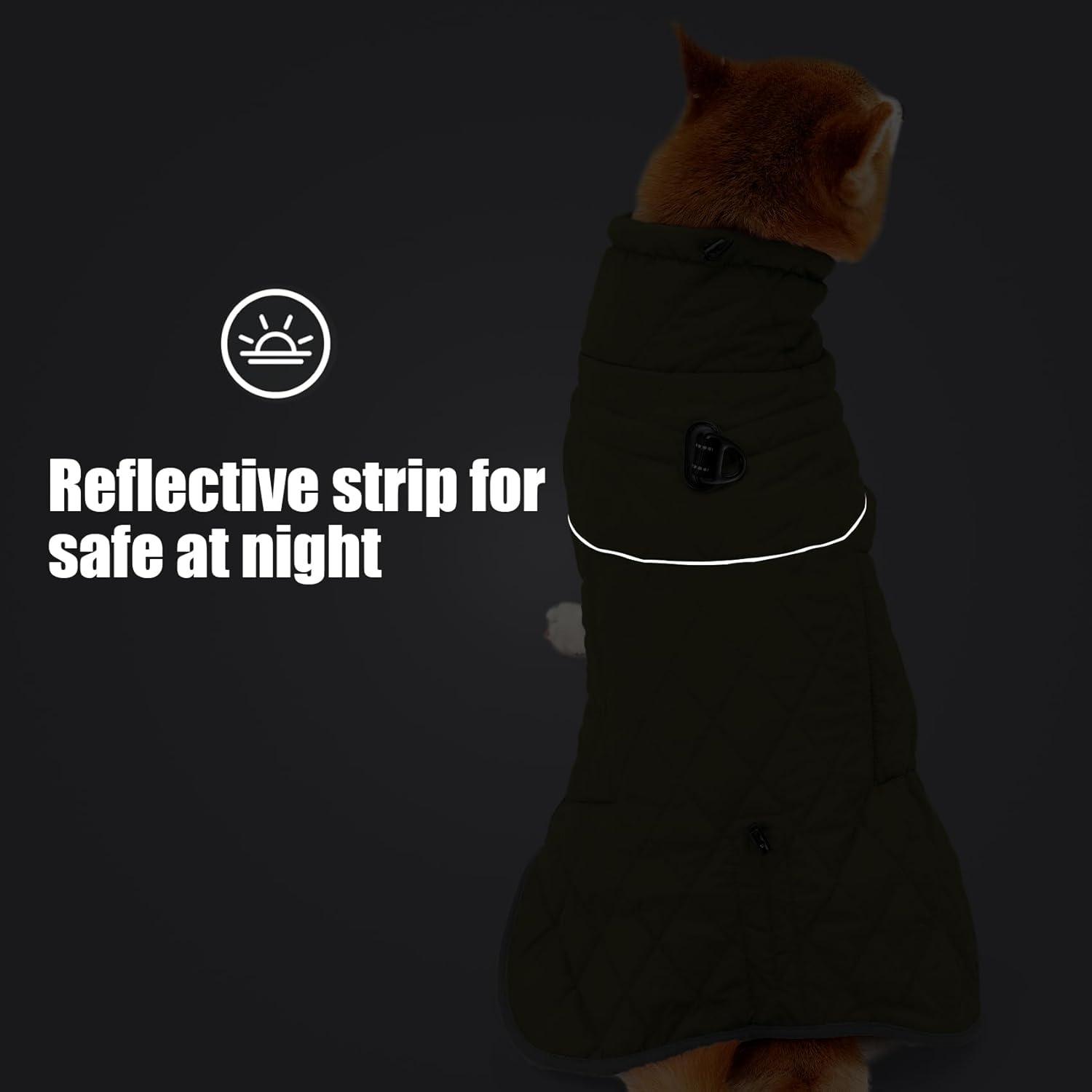 • **СВЕТЛООТРАЖИТЕЛНИ ЛЕНТИ ЗА БЕЗОПАСНОСТ ПРЕЗ НОЩТА**: Оборудвано със светлоотразителни ленти, това водоустойчиво яке за кучета подобрява видимостта по време на нощни разходки и гарантира, че вашият пухкав приятел е в безопасност при слабо осветени условия. Палтото за кучета е оборудвано с еластични задни бримки за краката, които държат якето близо до тялото, докато тича и играе.