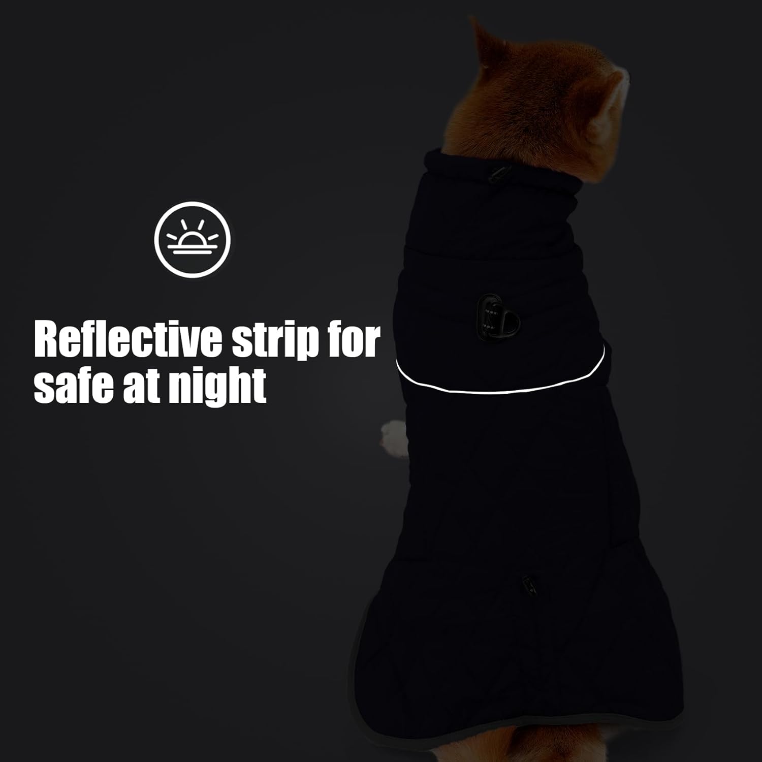 • **СВЕТЛООТРАЖИТЕЛНИ ЛЕНТИ ЗА БЕЗОПАСНОСТ ПРЕЗ НОЩТА**: Оборудвано със светлоотразителни ленти, това водоустойчиво яке за кучета подобрява видимостта по време на нощни разходки и гарантира, че вашият пухкав приятел е в безопасност при слабо осветени условия. Палтото за кучета е оборудвано с еластични задни бримки за краката, които държат якето близо до тялото, докато тича и играе.