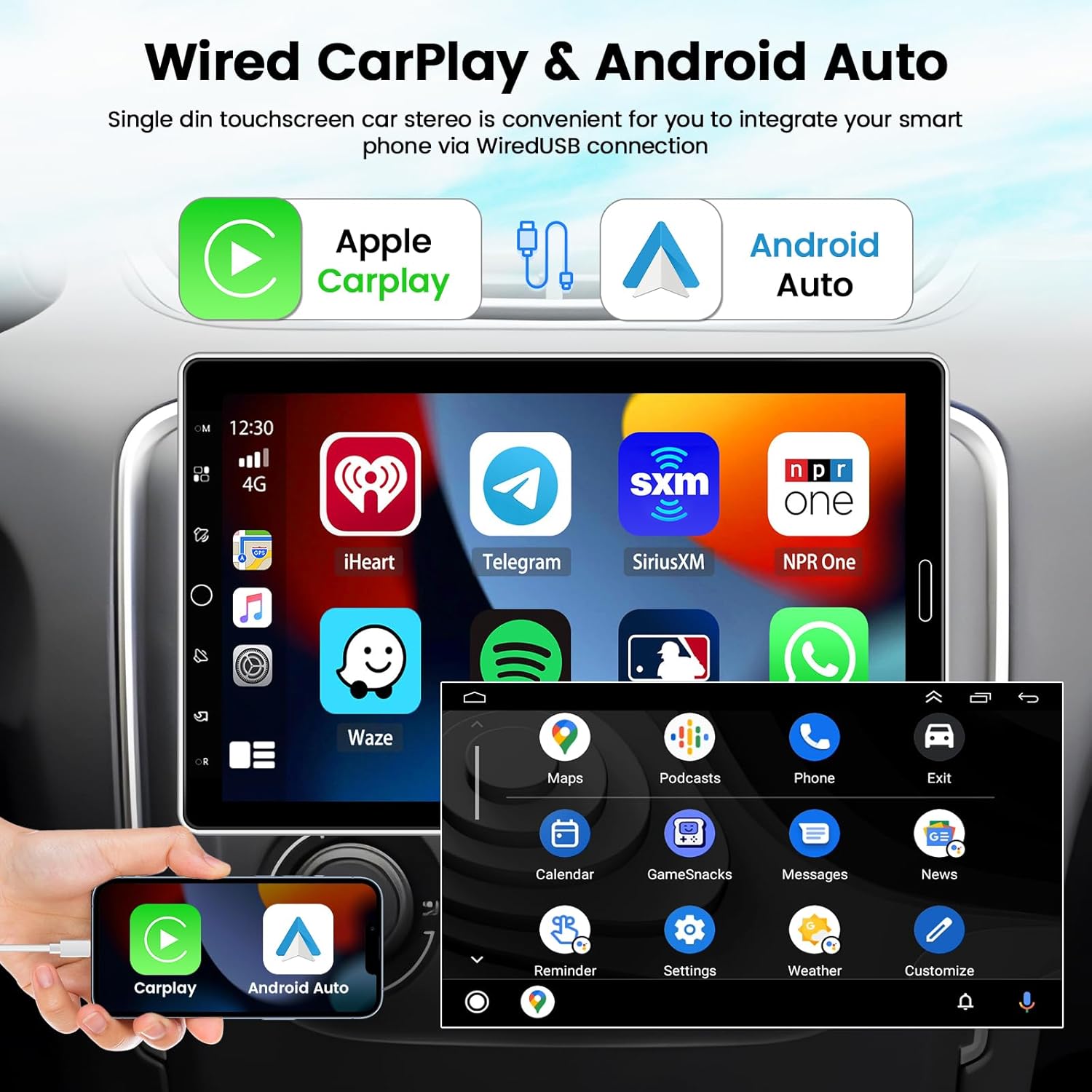 Hikity 10.1-инчово 1 DIN автомобилно радио с Carplay Android, кабелно Bluetooth, комплект за свободни ръце, подвижен екран, сензорен дисплей, Mirror Link, FM, USB, SD, AUX + камера за заден ход