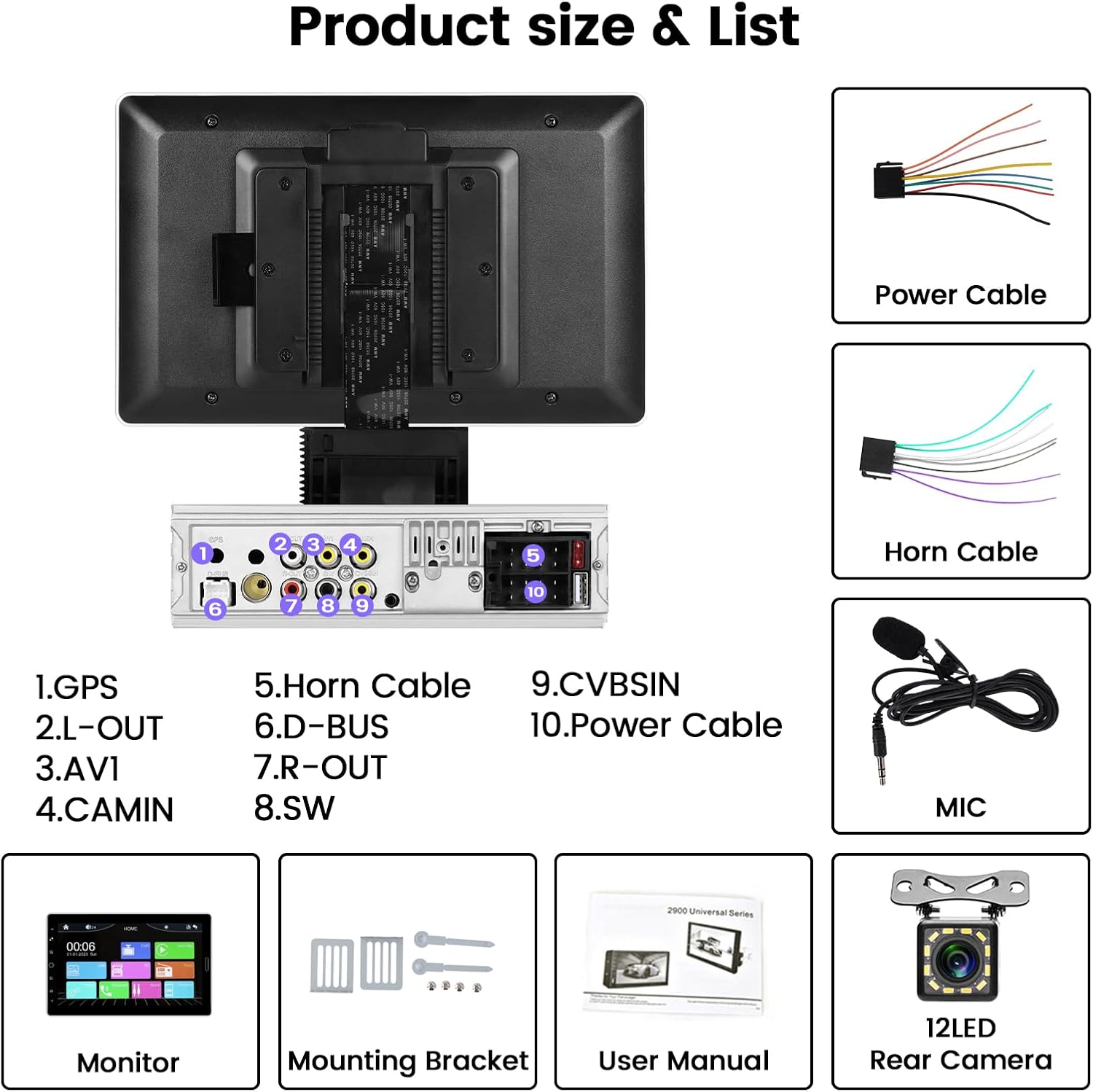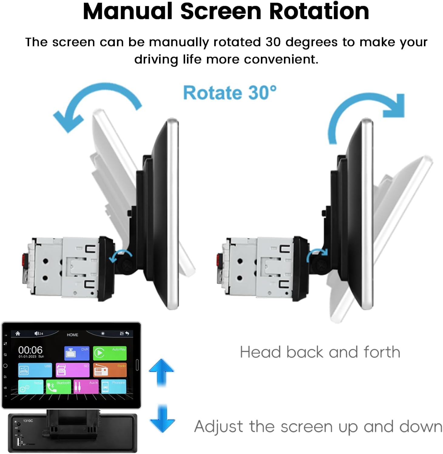 • 10,1-инчов HD подвижен сензорен екран: 1DIN автомобилно радио с 10,1-инчов 1080P сензорен екран с подвижен екран за намаляване на риска от кражба. Поддържа 30-градусово регулиране на ъгъла отпред и отзад, големият размер и отличното цветопредаване осигуряват комфортно изживяване при гледане. Поддържа USB зареждане/USB четене/USB/AUX-in/SD карта