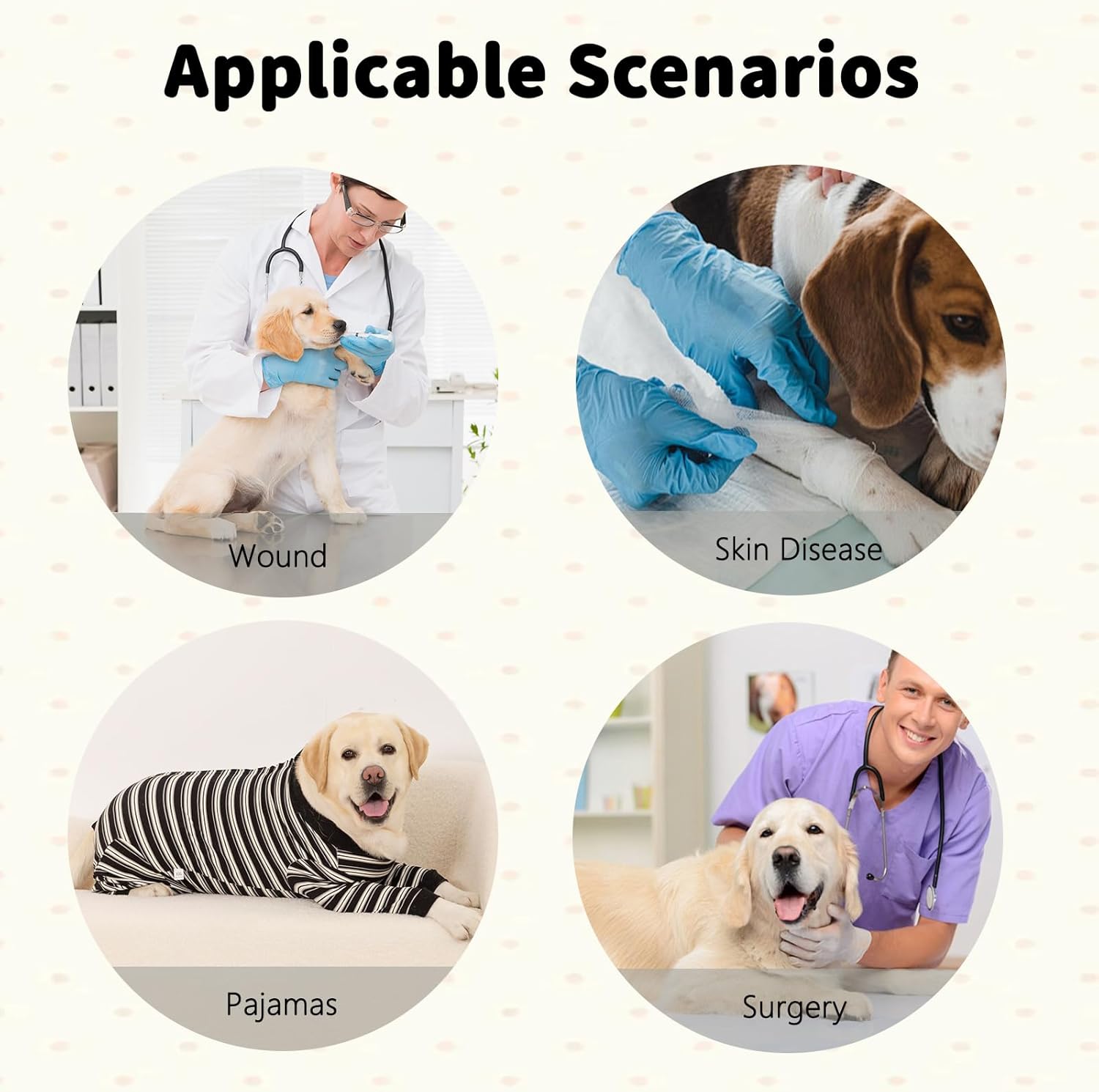 • Многофункционална употреба - Като възстановителен костюм и отлична алтернатива на електронните нашийници, той решава проблемите с одраскването и облизването на кучетата, като същевременно предотвратява повторното отваряне на раните. Като пижама може да помогне за облекчаване на следоперативната тревожност и да поддържа кучетата спокойни по време на възстановяване. Като дреха за отбиване, тя може напълно да обгърне отбитото куче, осигурявайки защита. Освен това е стилна и достатъчно привлекателна, за да се носи ежедневно.