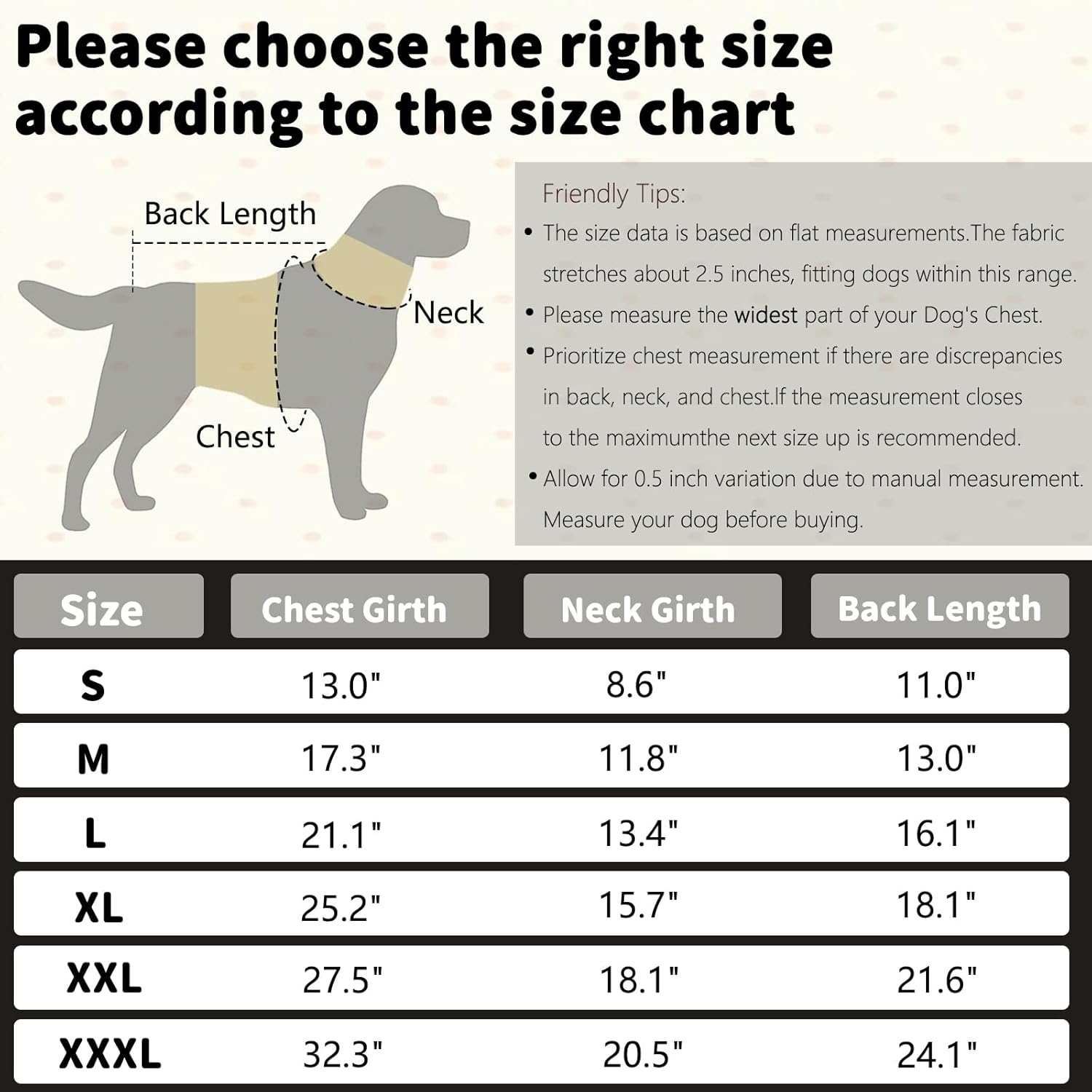 • Разнообразие от размери за перфектно прилягане – Размерите варират от S до XXXL. За да осигурите оптимално прилягане, моля, вижте таблицата с размери и измерете кучето си преди да поръчате. Ако кучето ви е в по-големия край на скалата за размери, препоръчваме да изберете по-големия размер за максимален комфорт.