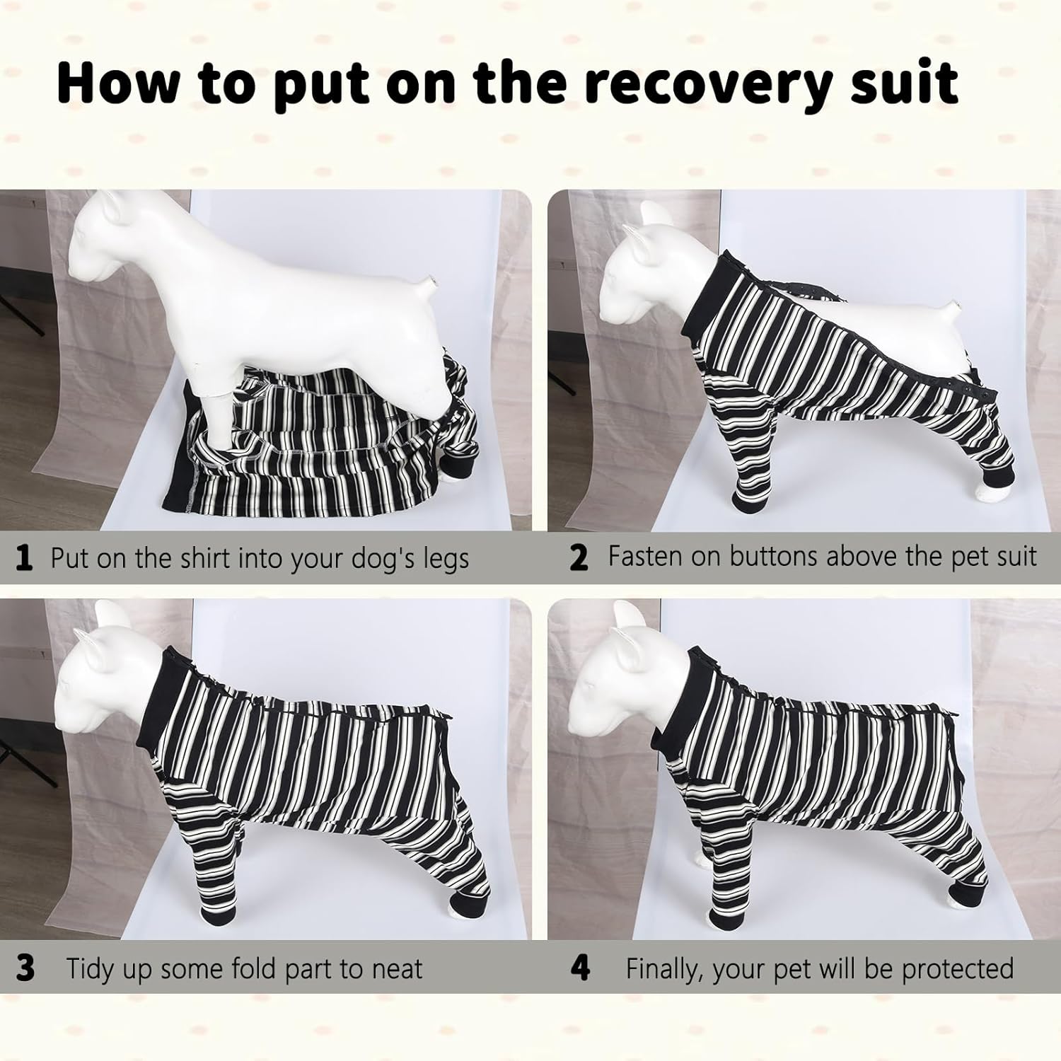 • Лесно за носене – Благодарение на закопчаването с копче, този възстановяващ костюм за кучета е лесен за обличане и събличане, спестявайки време и неудобство. Еластичната материя осигурява удобно и сигурно прилягане за кучета с различни размери по време на тяхното възстановяване.