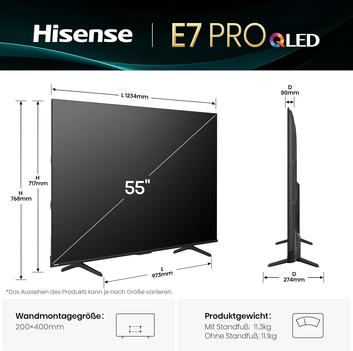 Hisense 55E7Q PRO телевизор 139 см (55 инча) 4K UHD QLED, Smart TV, 144Hz Game Mode PRO, Filmaker Mode, AMD FreeSync Premium, AI HDR Upscaler, Dolby Vision IQ, Dolby Atmos, Гласово управление [2025]