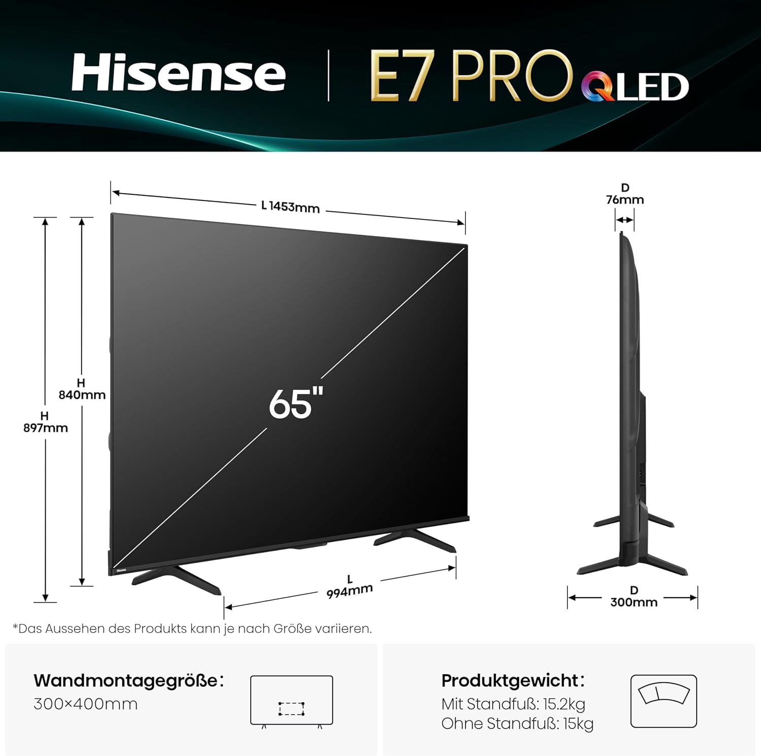 Hisense 65E7Q PRO телевизор, 65 инча, 4K UHD QLED, Smart TV, 144Hz Game Mode PRO, Filmaker Mode, AMD FreeSync Premium, AI HDR Upscaler, Dolby Vision IQ, Dolby Atmos, Гласово управление [2025]