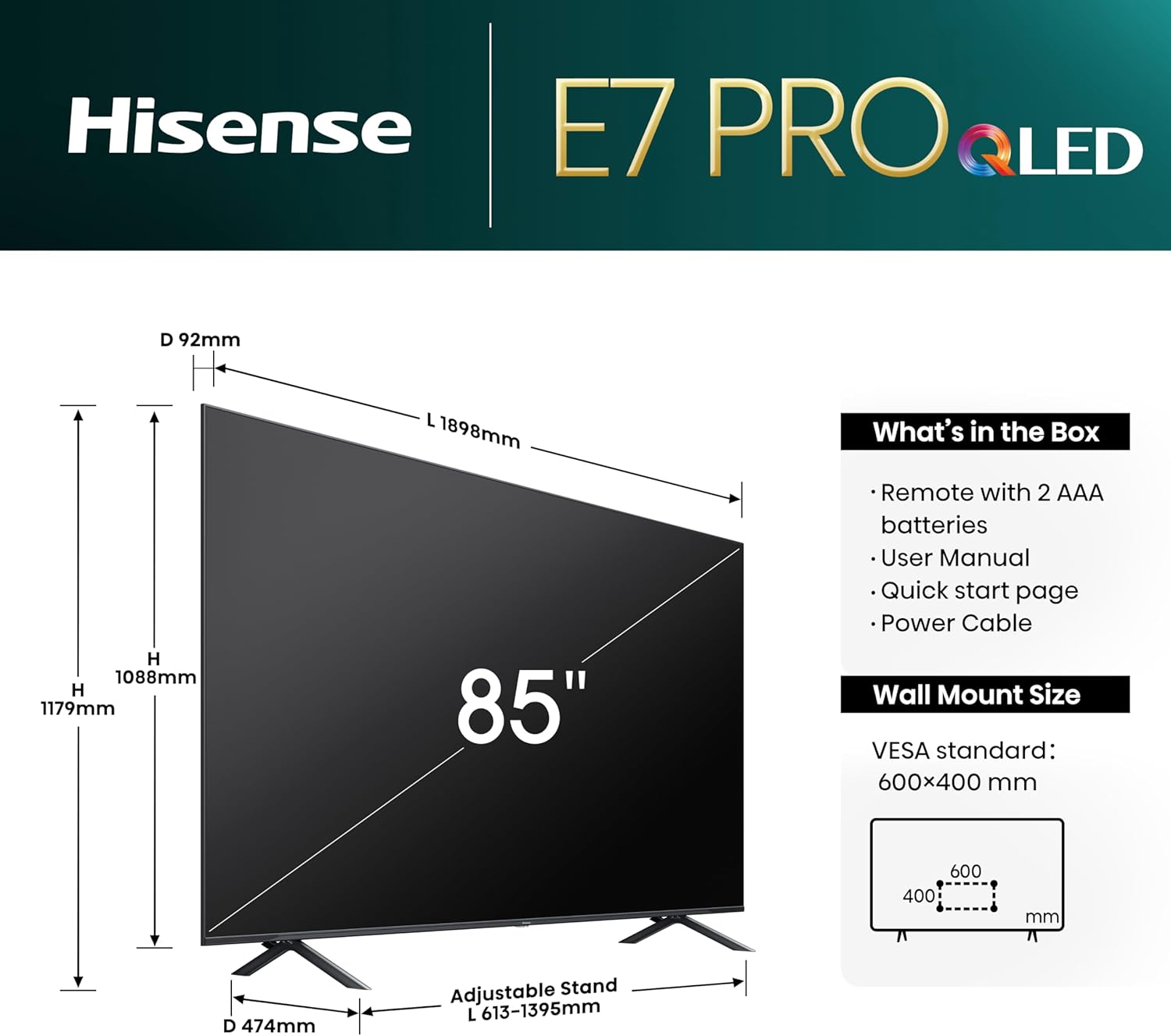 Hisense 85E7NQ Pro телевизор 215 см (85 инча), 4K UHD, QLED, Smart TV, Total HDR, Dolby Vision IQ Atmos, 144Hz (VRR), HDMI 2.1, Game Mode PRO, троен тунер, вградена Alexa, тъмносив, [2024]