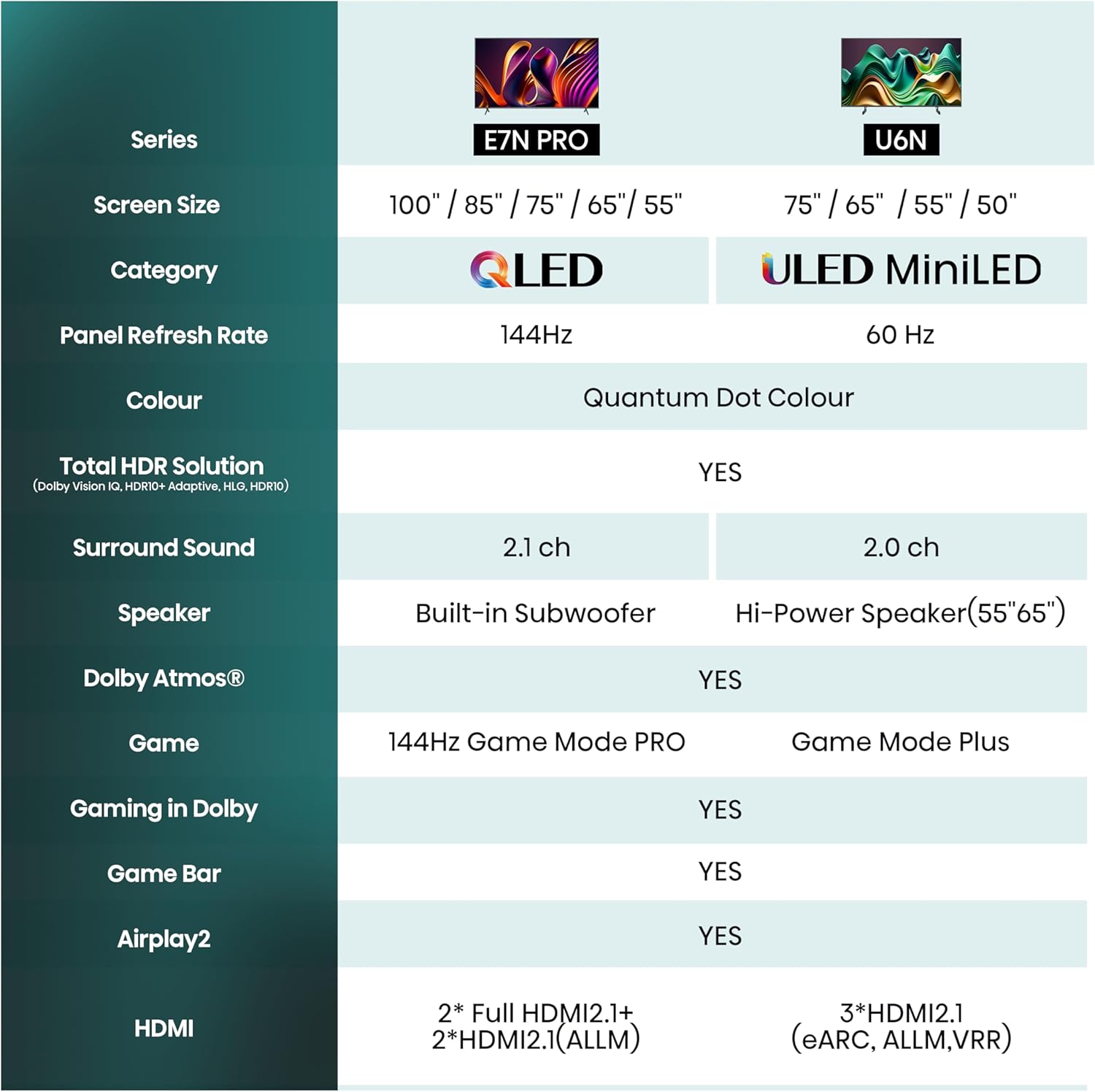 • AI 4K Upscaler: С AI 4K Upscaler на Hisense можете да възпроизвеждате цялото си любимо съдържание с изключително качество. Тази интелигентна функция не само възпроизвежда любимите ви класики и домашни видеоклипове, но и съвременни телевизионни предавания, филми и дори стрийминг съдържание в зашеметяващо 4K качество. Всеки пиксел е подобрен, за да съответства на производителността на вашия телевизор.