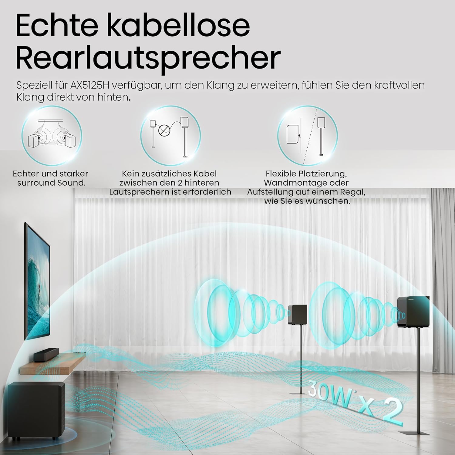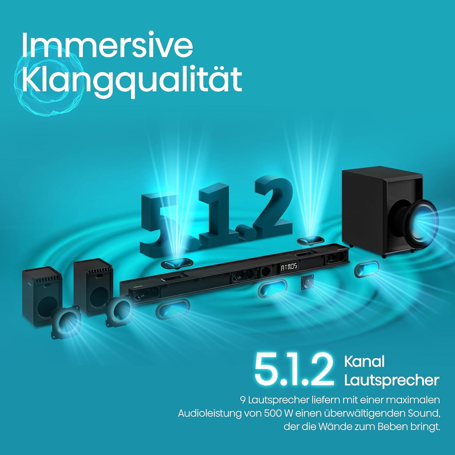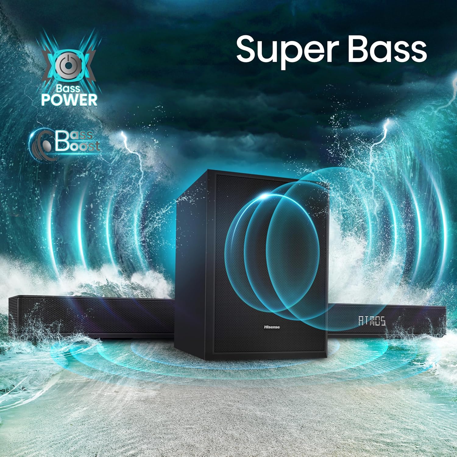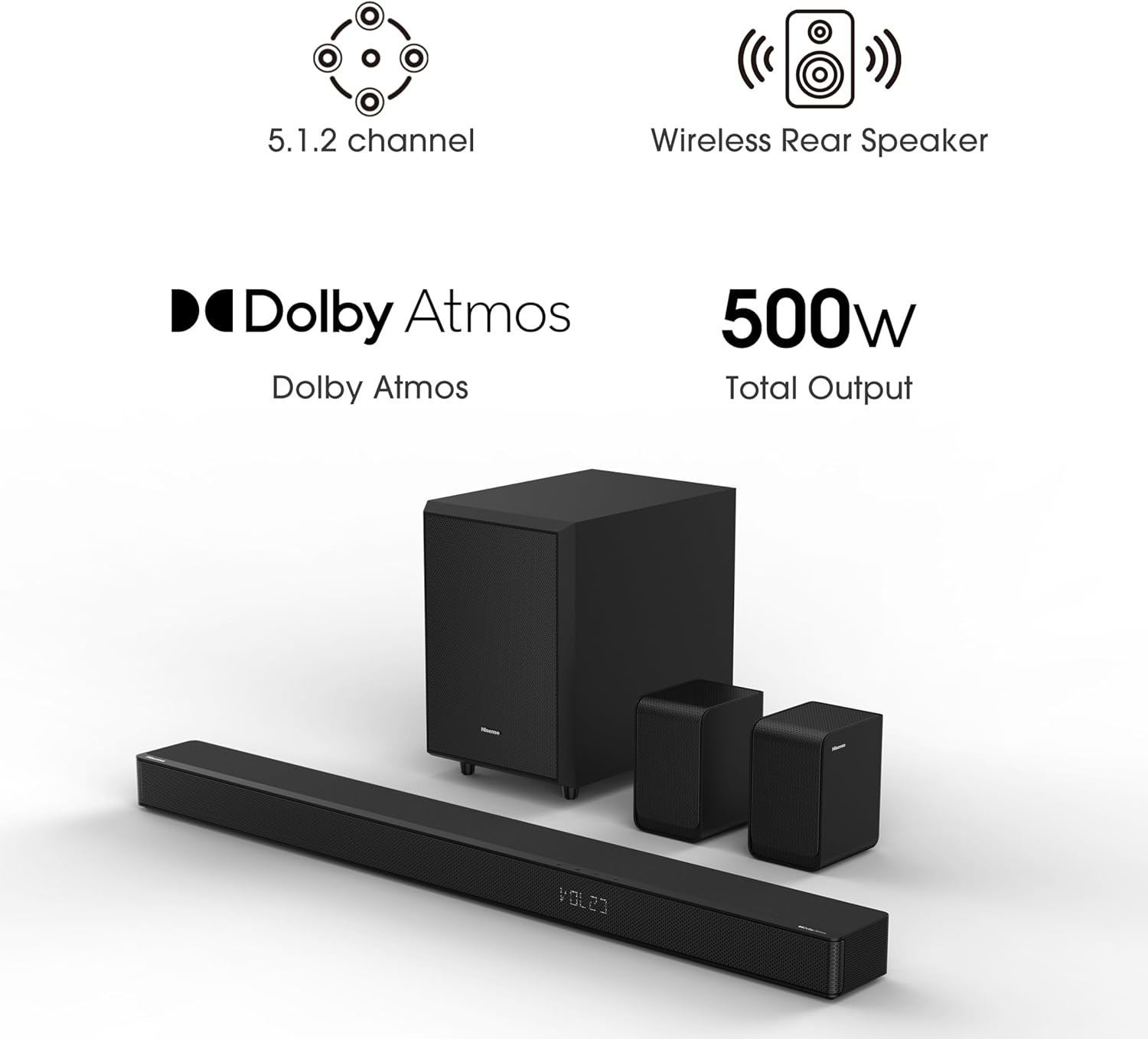 Hisense AX5125H 5.1.2 саундбар с безжичен субуфер и задни високоговорители, 500W, Dolby Digital Plus, Dolby Atmos, Bluetooth, HDMI eARC/оптичен/AUX/USB, черен (2024)