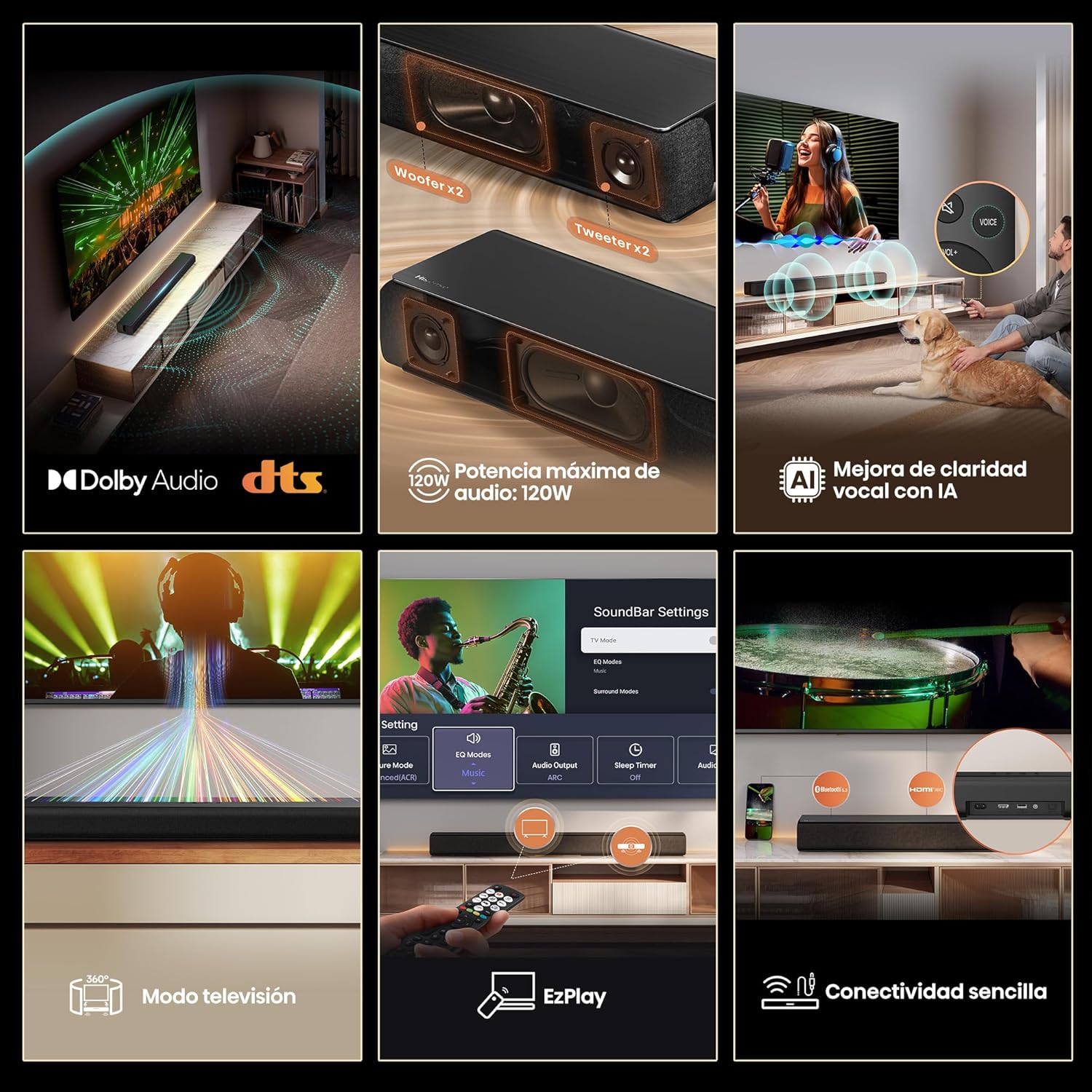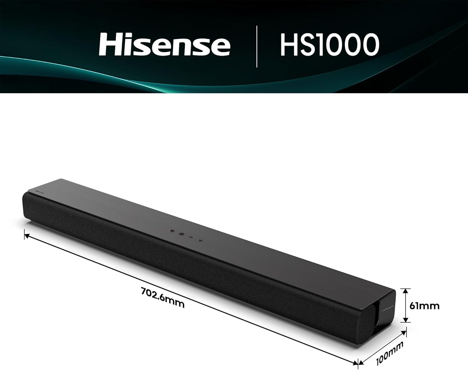 Hisense HS1000, 2.0-канален саундбар, максимална аудио мощност 120 W, Dolby Audio, DTS Virtual:X, подобрен глас, TV режим, EzPlay