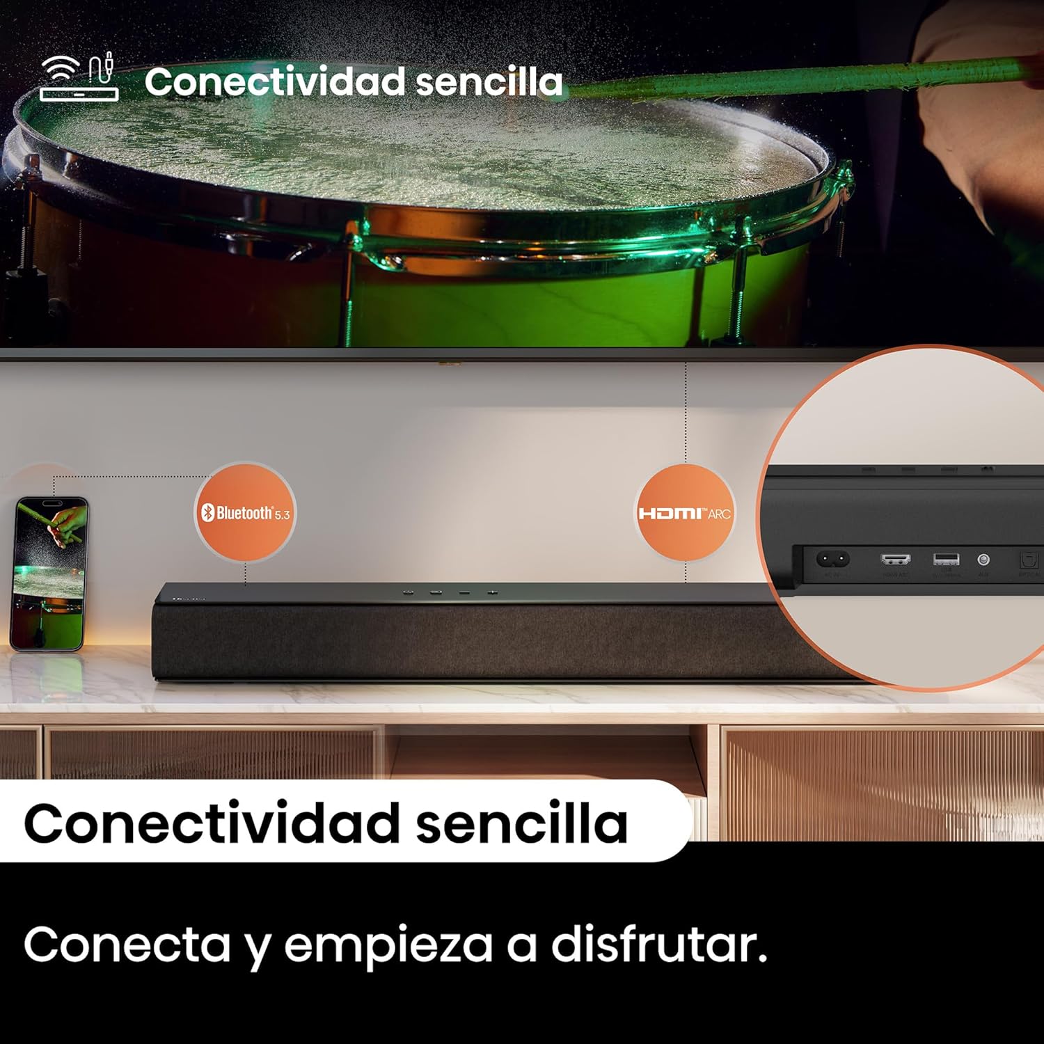 • Обща мощност 240 W: идеално подобрение на звука на вашия телевизор с 2.1 канала в компактен дизайн. Включва стерео високоговорители и субуфер, интегрирани в саундбара.