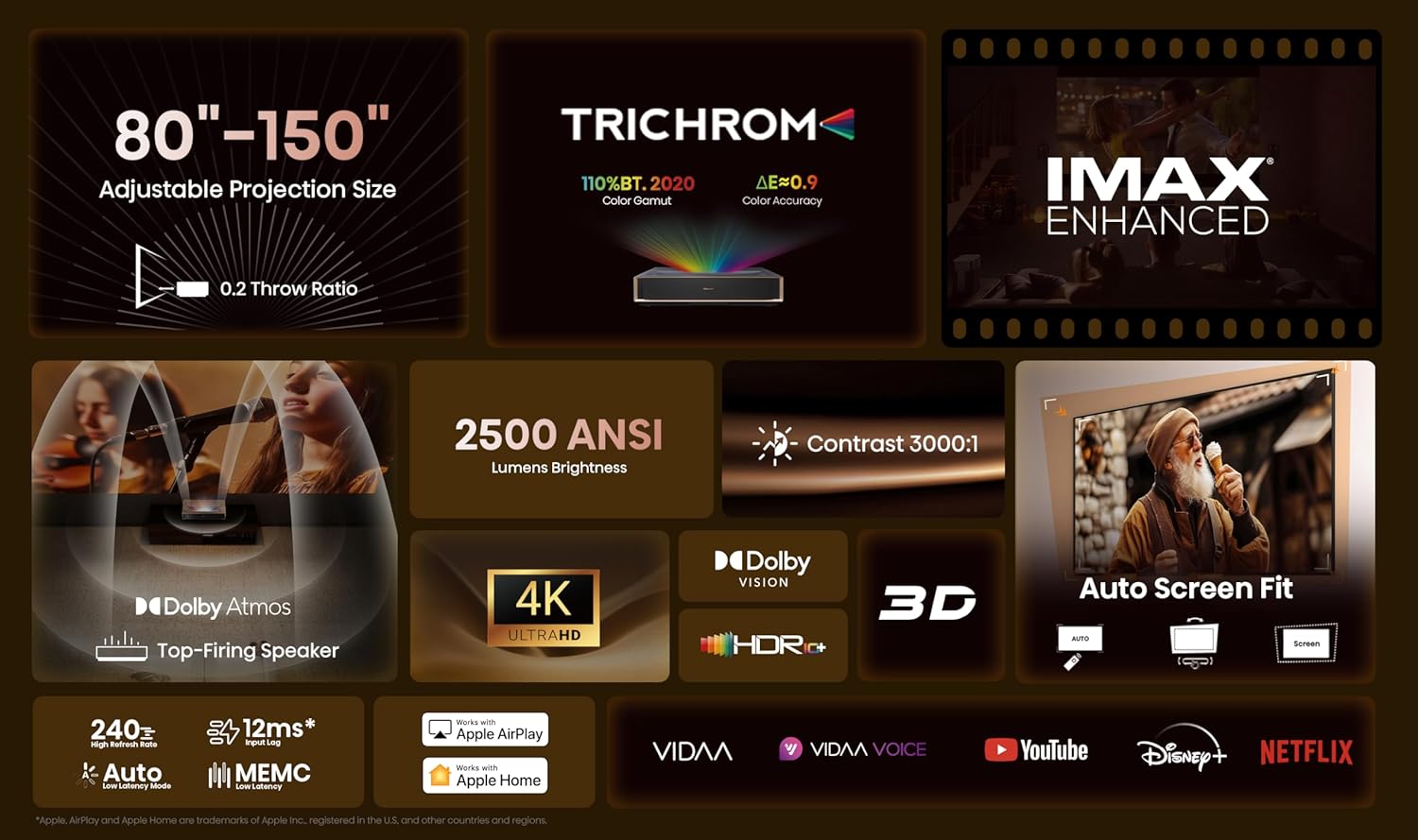 • 4K резолюция и трихромен лазер: Ултрафините детайли се показват с резолюция над 8 милиона пиксела. С уникалната технология Trichroma Laser, основните RGB цветове се генерират с помощта на отделни лазери, постигайки изключително цветопредаване от 107% BT2020.