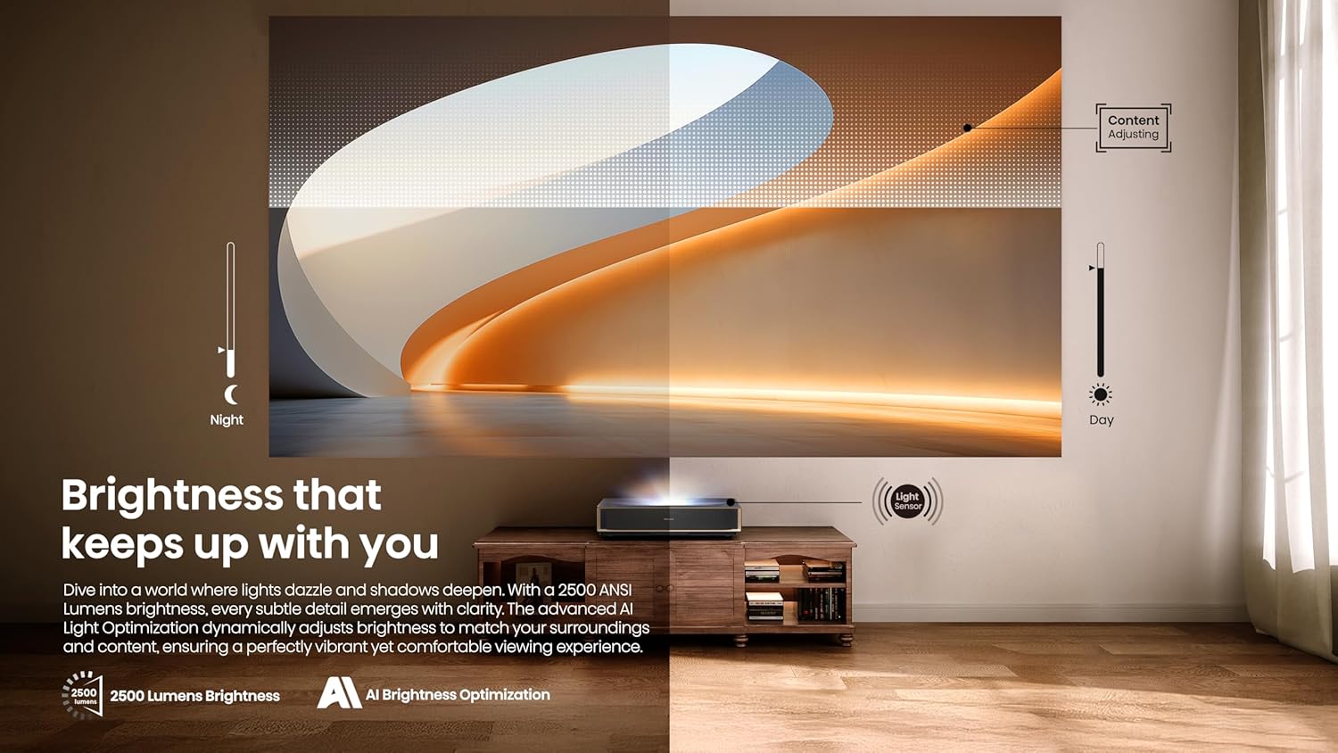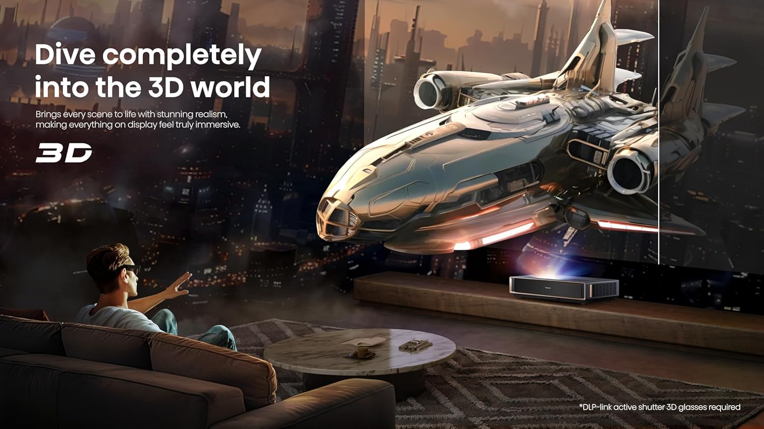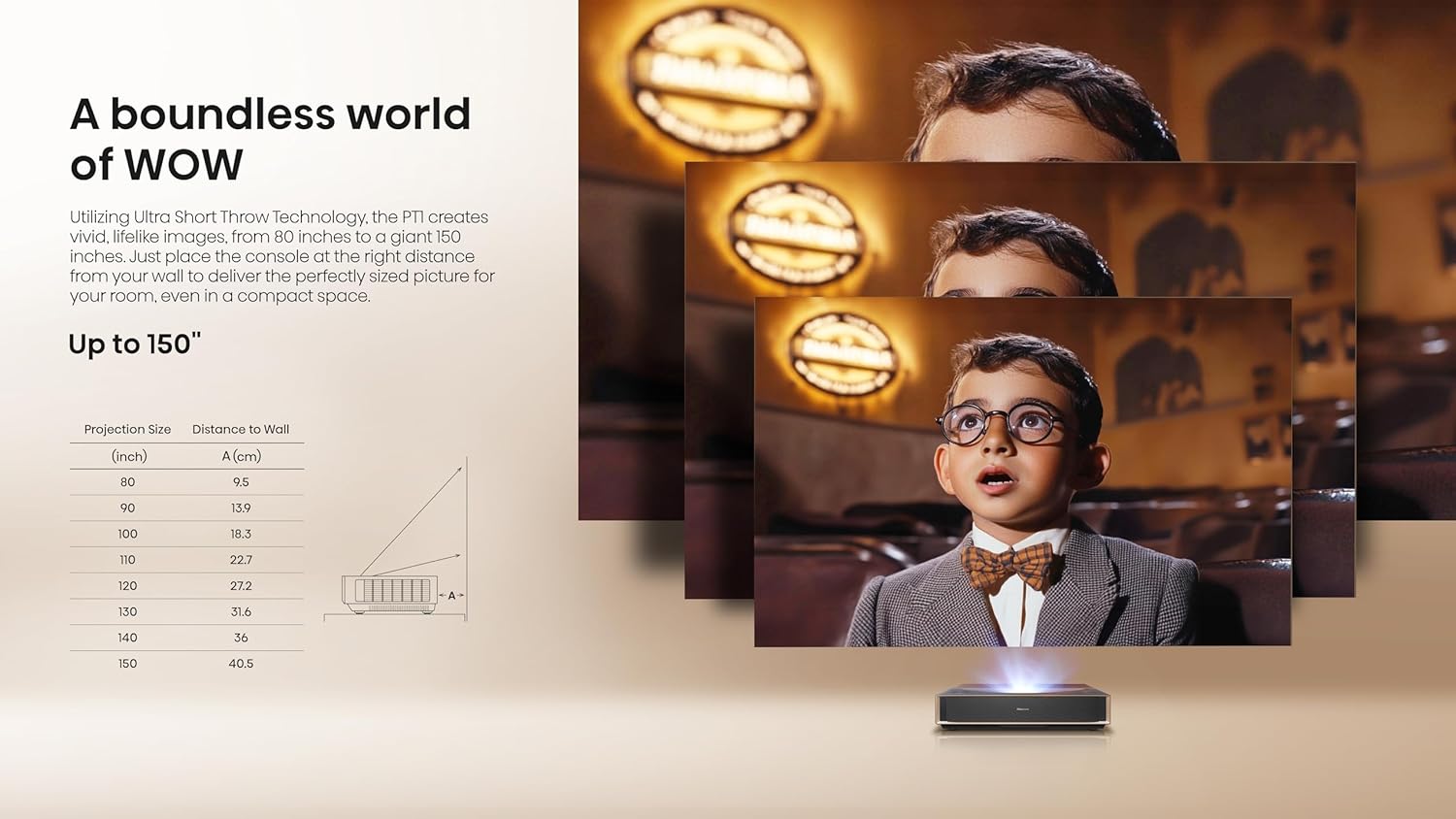 Hisense Laser Cinema PT1, размер на проекцията 80 - 150 инча, LPU технология, 4K, IMAX подобрена, Dolby Vision, Atmos, HDR10+, яркост 2500 лумена, ултра къс проекционен проектор, 3D, честота на опресняване 240Hz, VIDAA, без