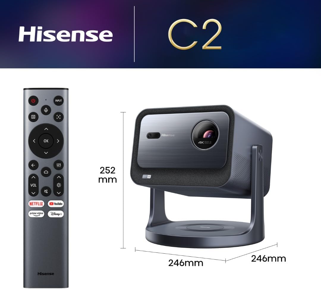 Hisense лазерен мини проектор C2, размер на проекцията 65"-300", 4K, чист трицветен лазер, яркост 2000 лумена, естествен контраст 1700:1, цифрово увеличение, Dolby Vision, звук от JBL, 3D, 240Hz, дизайн с гимбал