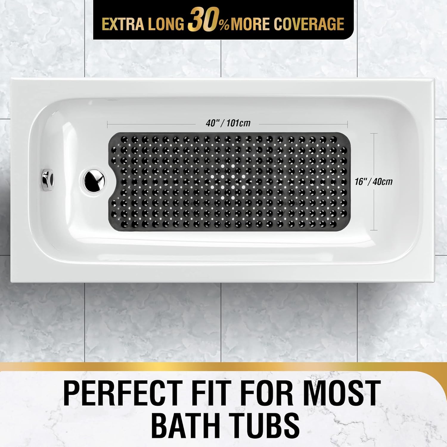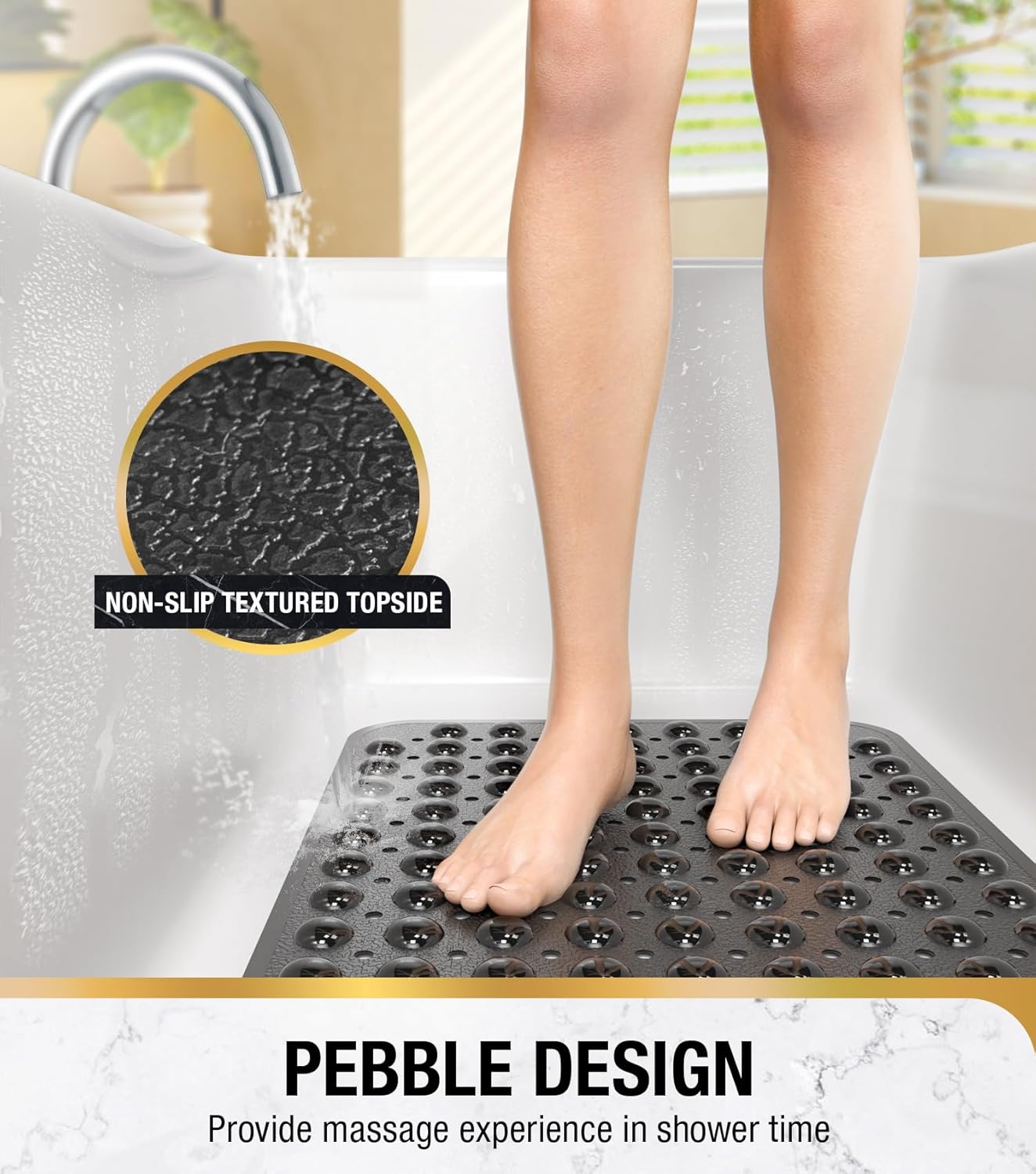 • Неплъзгаща се постелка с ултрасилно задържане: Нашата неплъзгаща се постелка за баня е снабдена с 200 здрави лепящи вендузи, които я държат здраво на място върху гладки, чисти вани и душове. Текстурата на горната част на постелката за баня увеличава триенето, така че да не се подхлъзвате или падате във ваната.