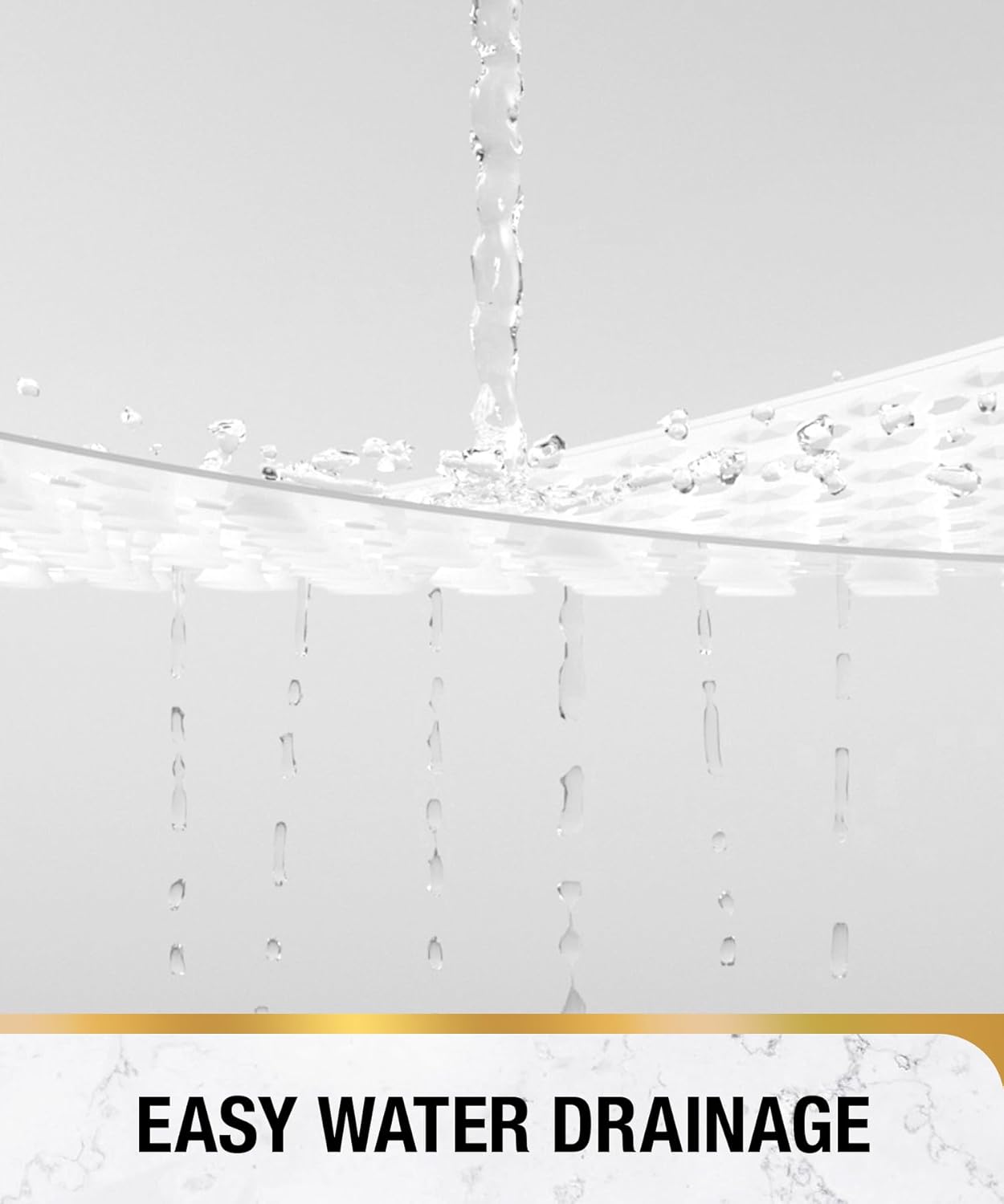 • ЕФЕКТИВНО ОТВОЖАВАНЕ 220 внимателно разположени отвора за оттичане осигуряват безпроблемна циркулация на водата и въздуха, ефективно предотвратяват натрупването на вода. Това означава, че постелката за баня изсъхва бързо и винаги остава свежа и чиста.