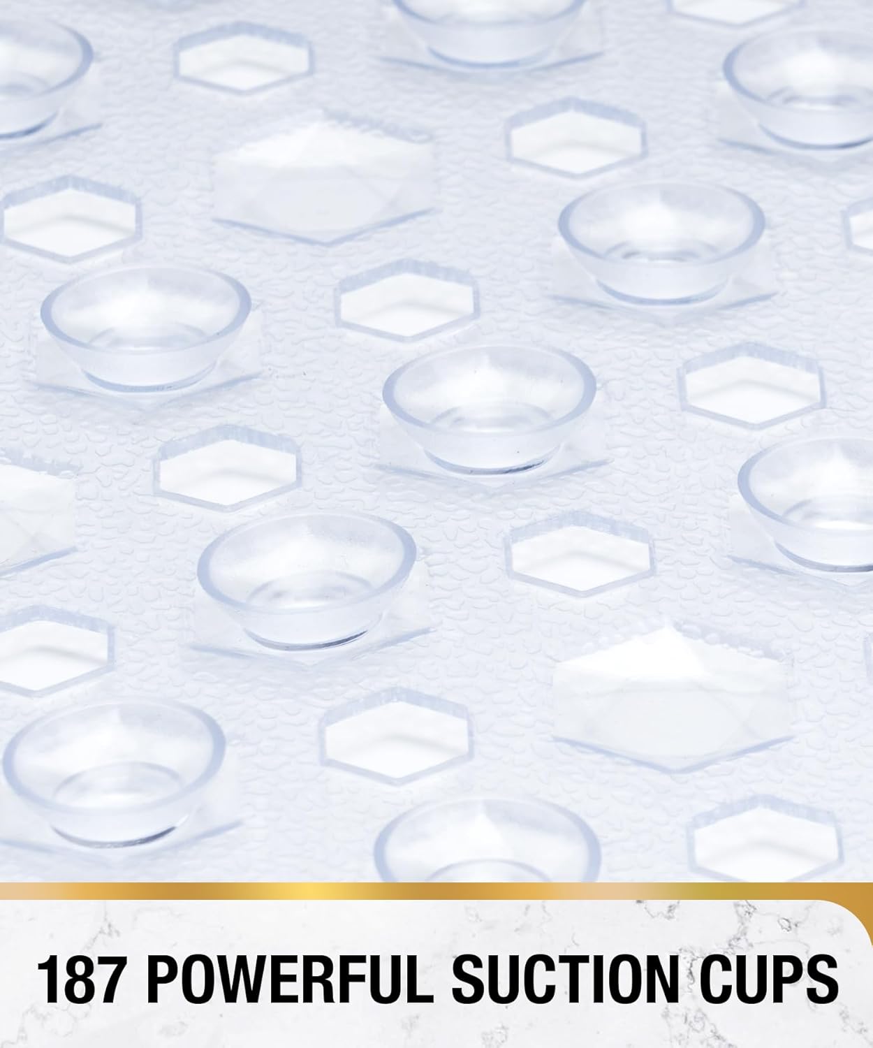 • БЕЗОПАСНОСТ И ПРОТИВОХЛЪЗГАЩА УСТОЙЧИВОСТ Тази постелка за баня има 187 здрави вендузи, които се залепват здраво за пода на ваната и душа, осигурявайки дълготрайна защита от хлъзгане. Особено подходяща е за възрастни хора, бебета и малки деца.