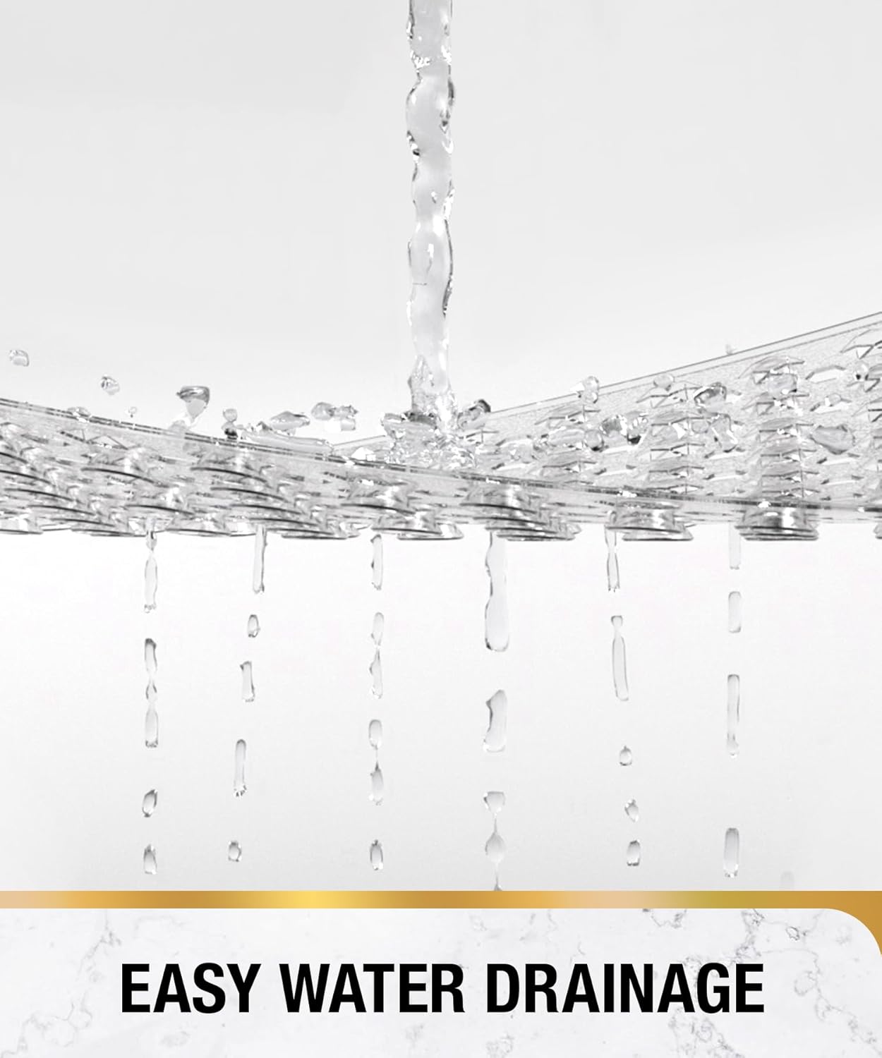 • ЕФЕКТИВНО ОТВОЖАВАНЕ 220 внимателно разположени отвора за оттичане осигуряват безпроблемна циркулация на водата и въздуха, ефективно предотвратяват натрупването на вода. Това означава, че постелката за баня изсъхва бързо и винаги остава свежа и чиста.