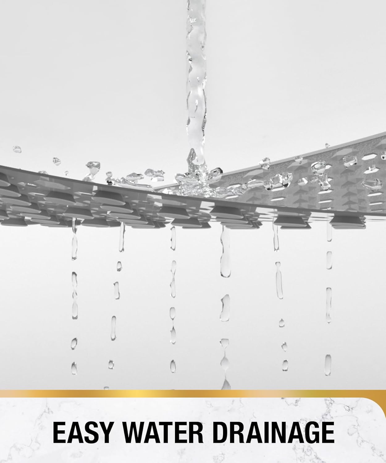 • ЕФЕКТИВНО ОТВОЖАВАНЕ 220 внимателно разположени отвора за оттичане осигуряват безпроблемна циркулация на водата и въздуха, ефективно предотвратяват натрупването на вода. Това означава, че постелката за баня изсъхва бързо и винаги остава свежа и чиста.