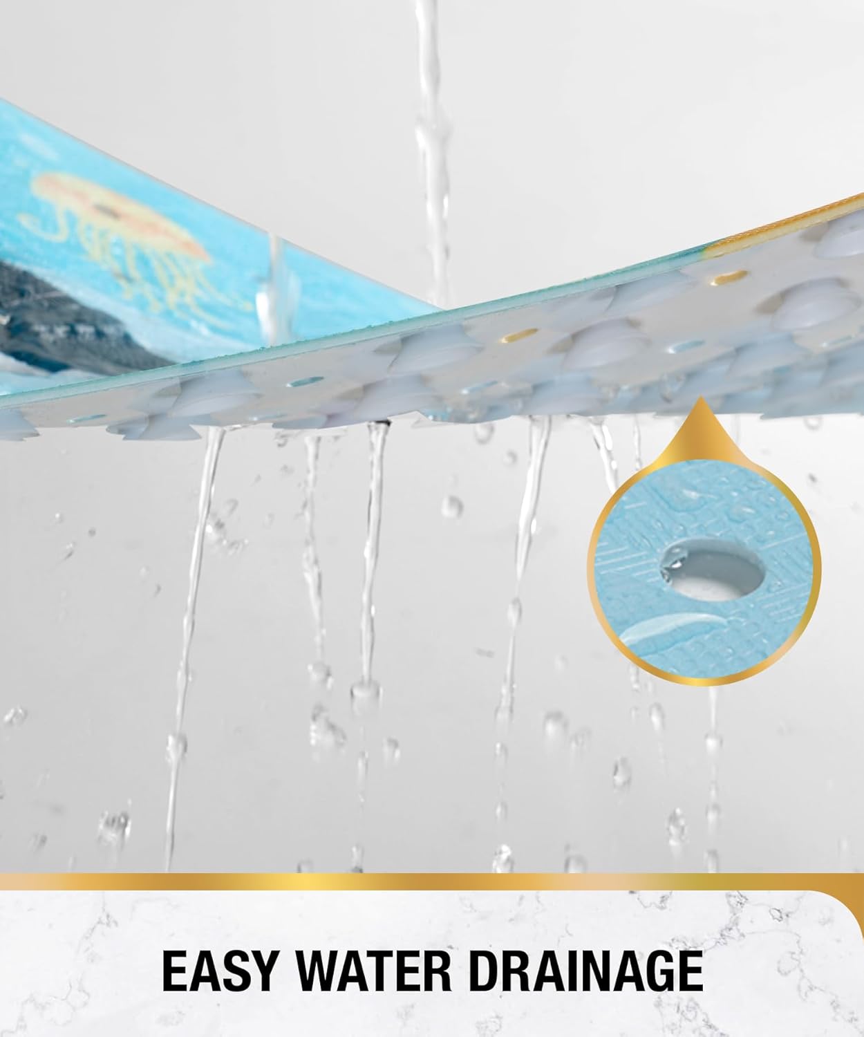 • Неплъзгаща се постелка с ултрасилно задържане: Нашата неплъзгаща се постелка за баня е снабдена с 200 здрави лепящи вендузи, които я държат здраво на място върху гладки, чисти вани и душове. Текстурата на горната част на постелката за баня увеличава триенето, така че да не се подхлъзвате или падате във ваната.
