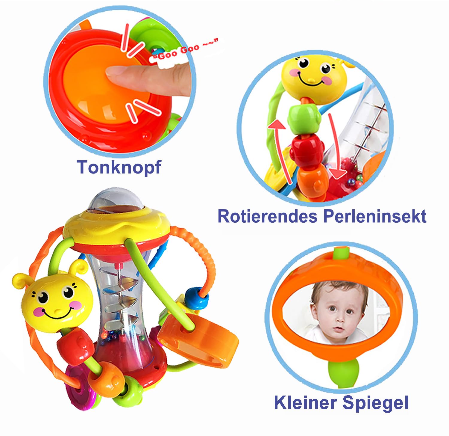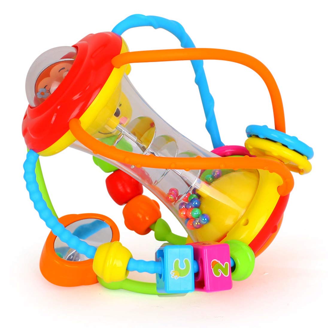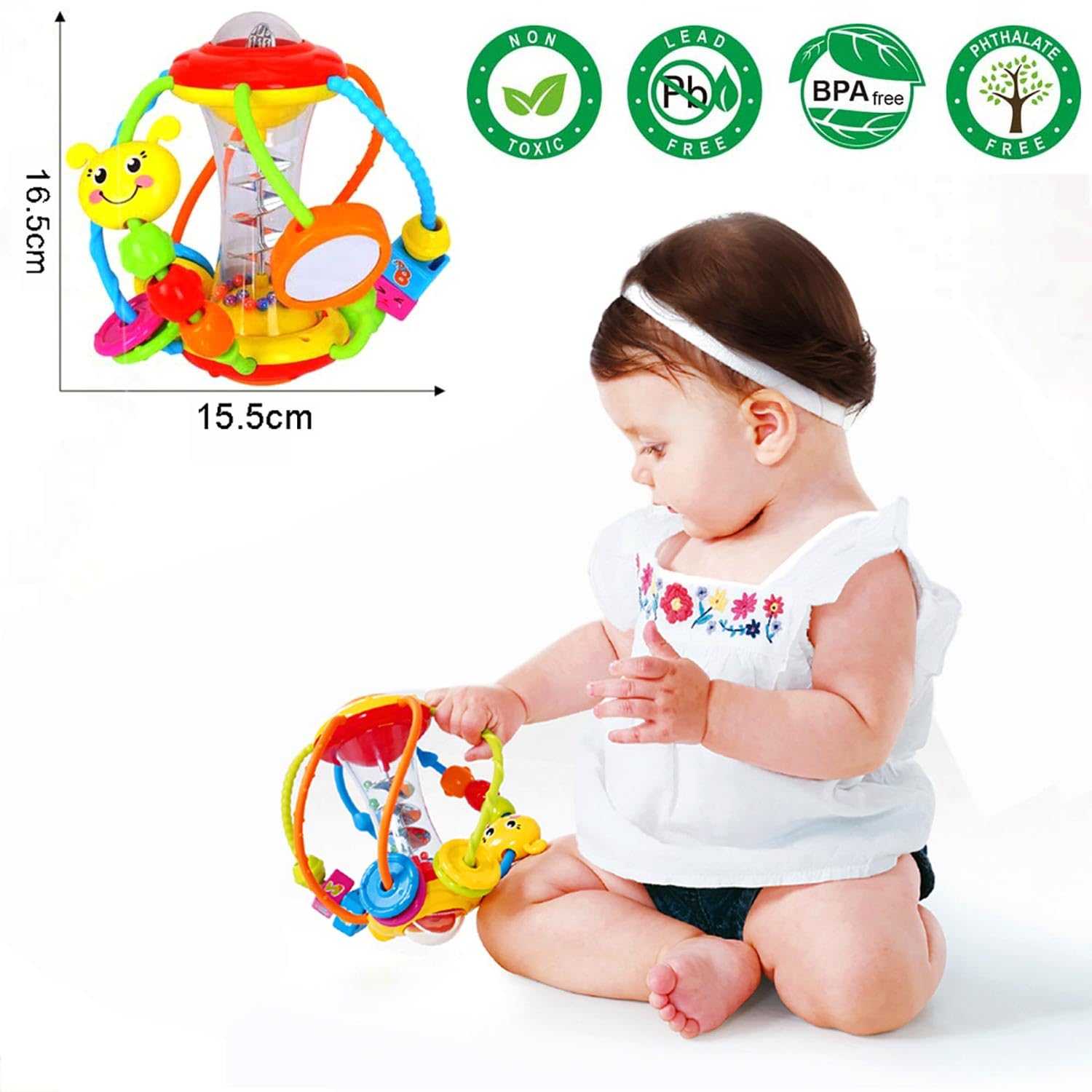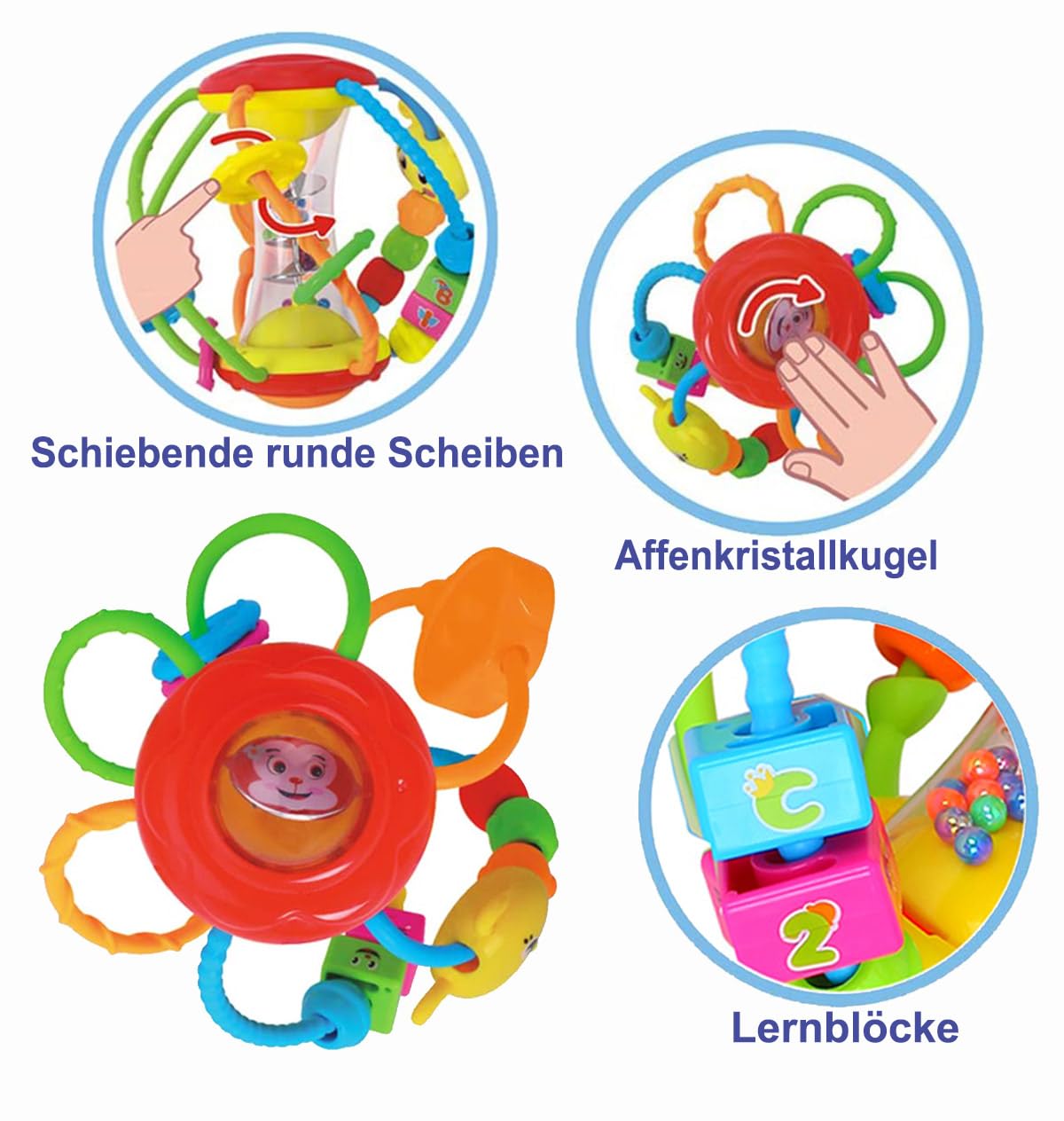 Цветна топка за игра и обучение с множество функции за игра, вградена дрънкалка, развитие на двигателните умения, сензорно трениране на зрението, слуха и докосването, подходяща от 3 месеца