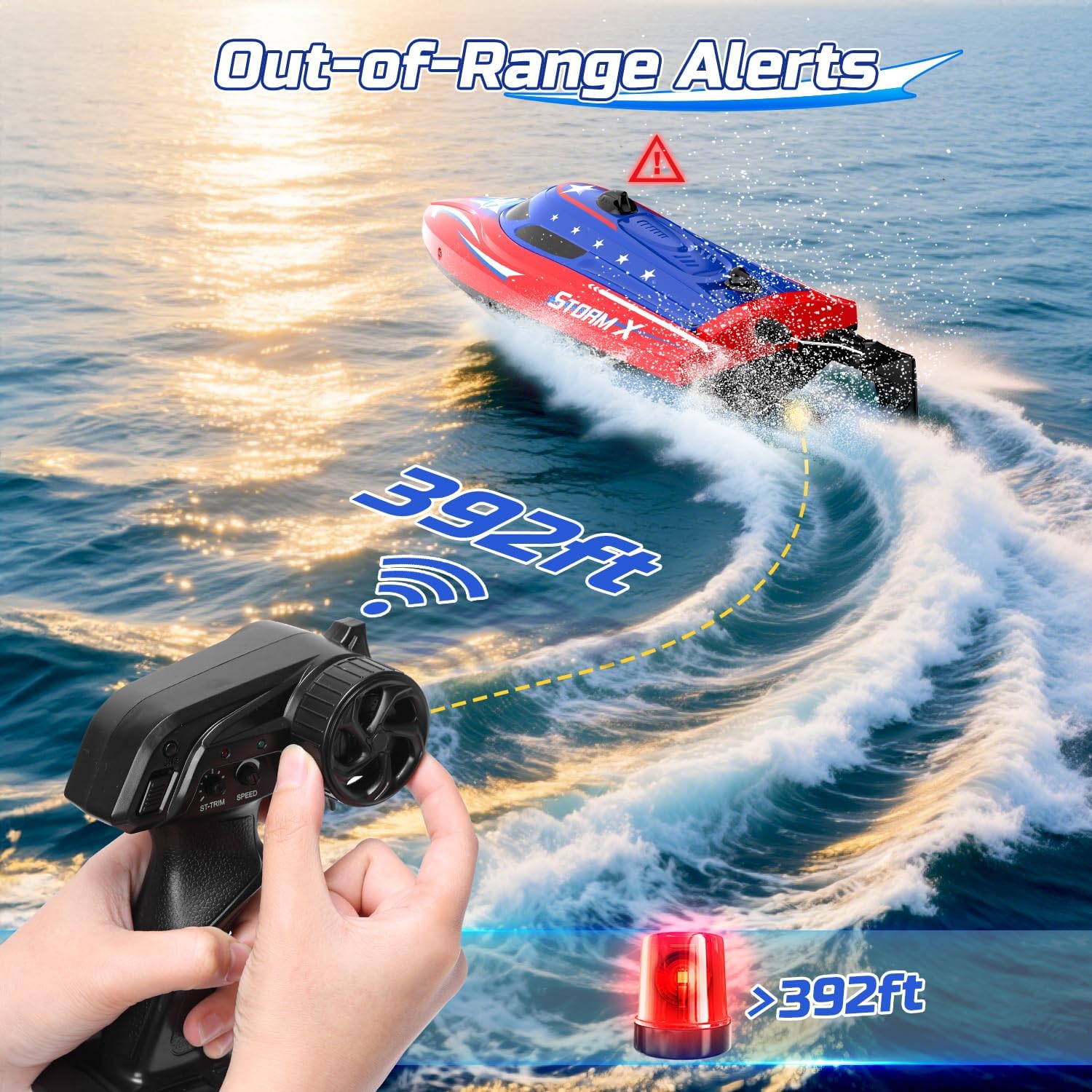 • 2.4GHz дистанционно управление с функция за голям обхват и предупреждение: Изпитайте прецизен контрол с обхват до 120 метра. Ако лодката е извън обхват, системата автоматично ви предупреждава. Няколко лодки могат да се движат безпроблемно едновременно - идеално за състезания със семейството и приятелите.