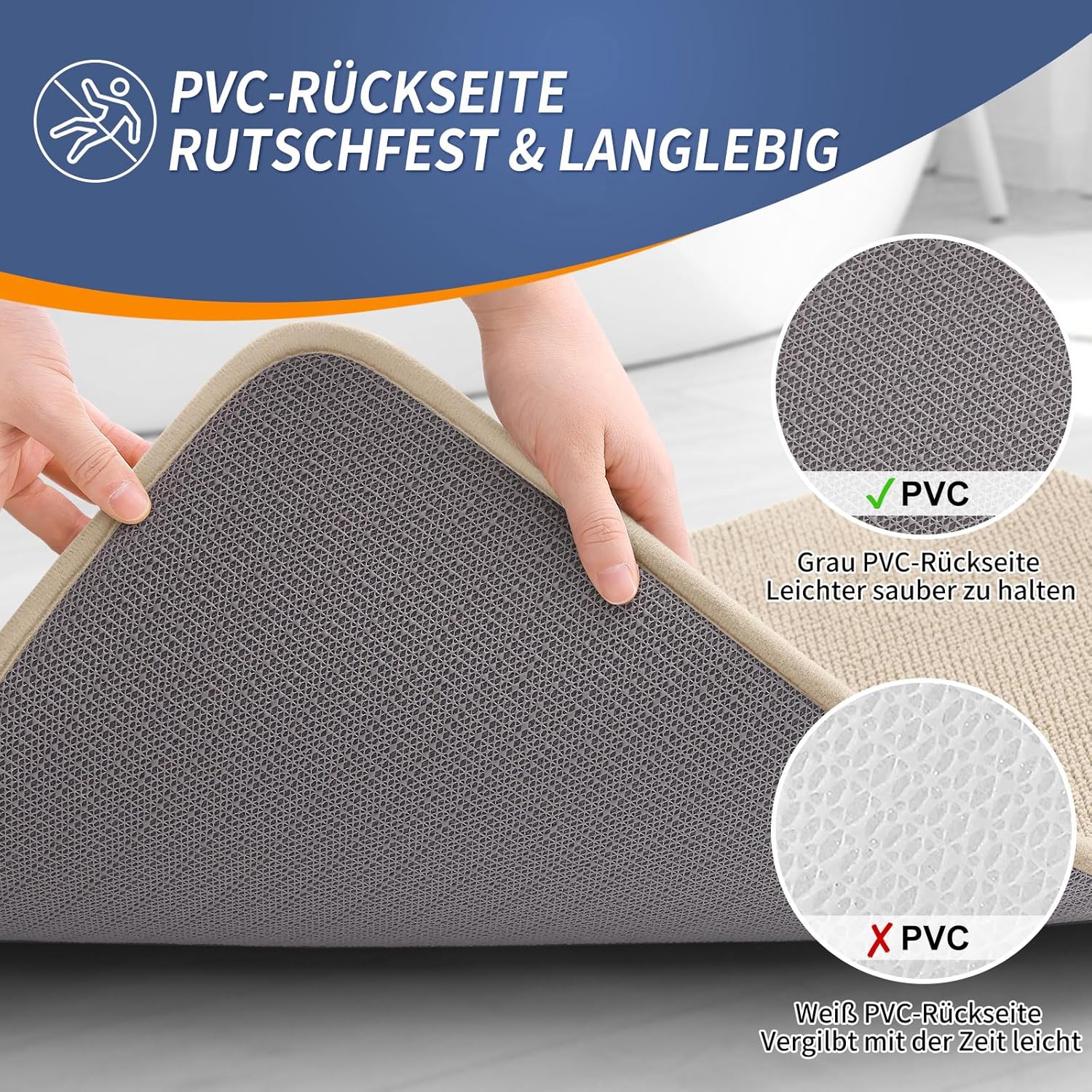 • НЕДХЛЪЗГАЩО ДЪНО Постелката за баня Homaxy има здраво и издръжливо PVC дъно, което остава на мястото си, когато стоите върху нея. За оптимална устойчивост на хлъзгане, противохлъзгащата постелка за баня трябва да се поставя само върху чиста, суха и равна повърхност.