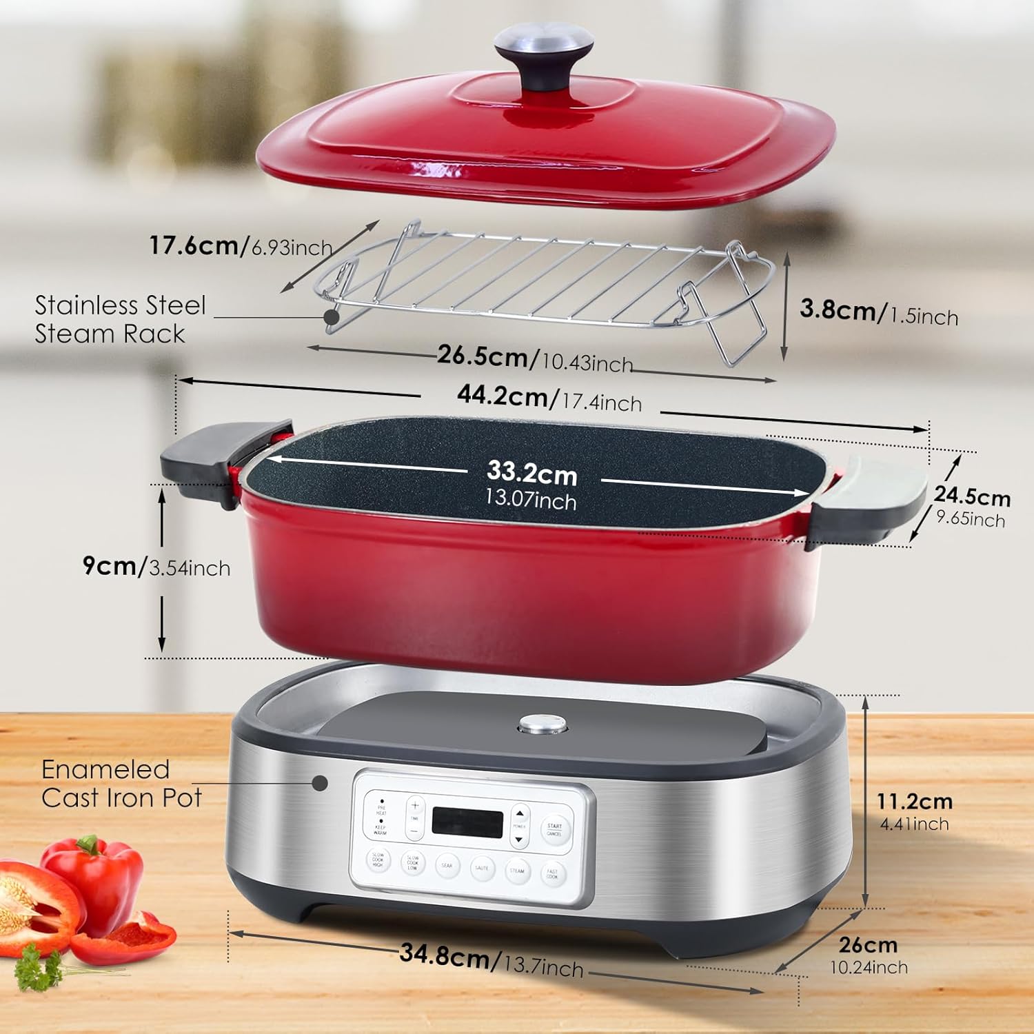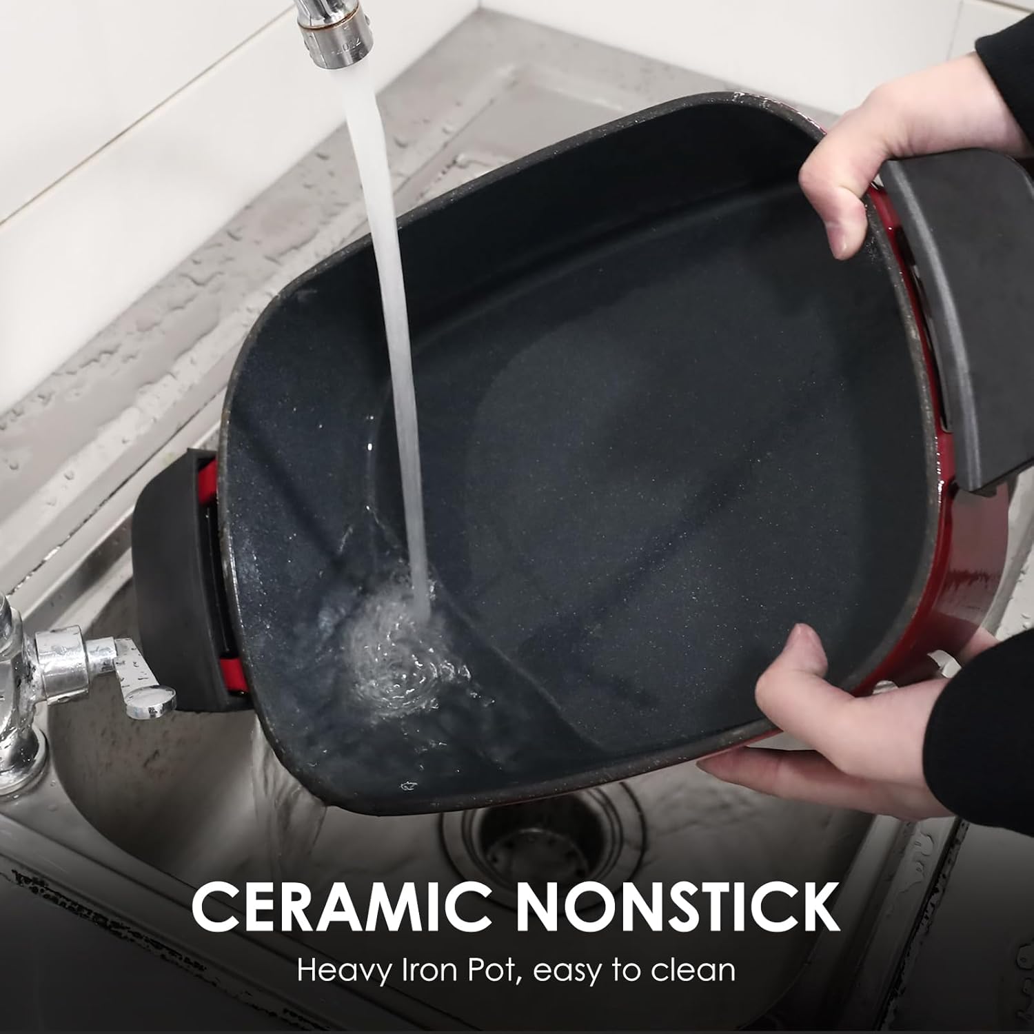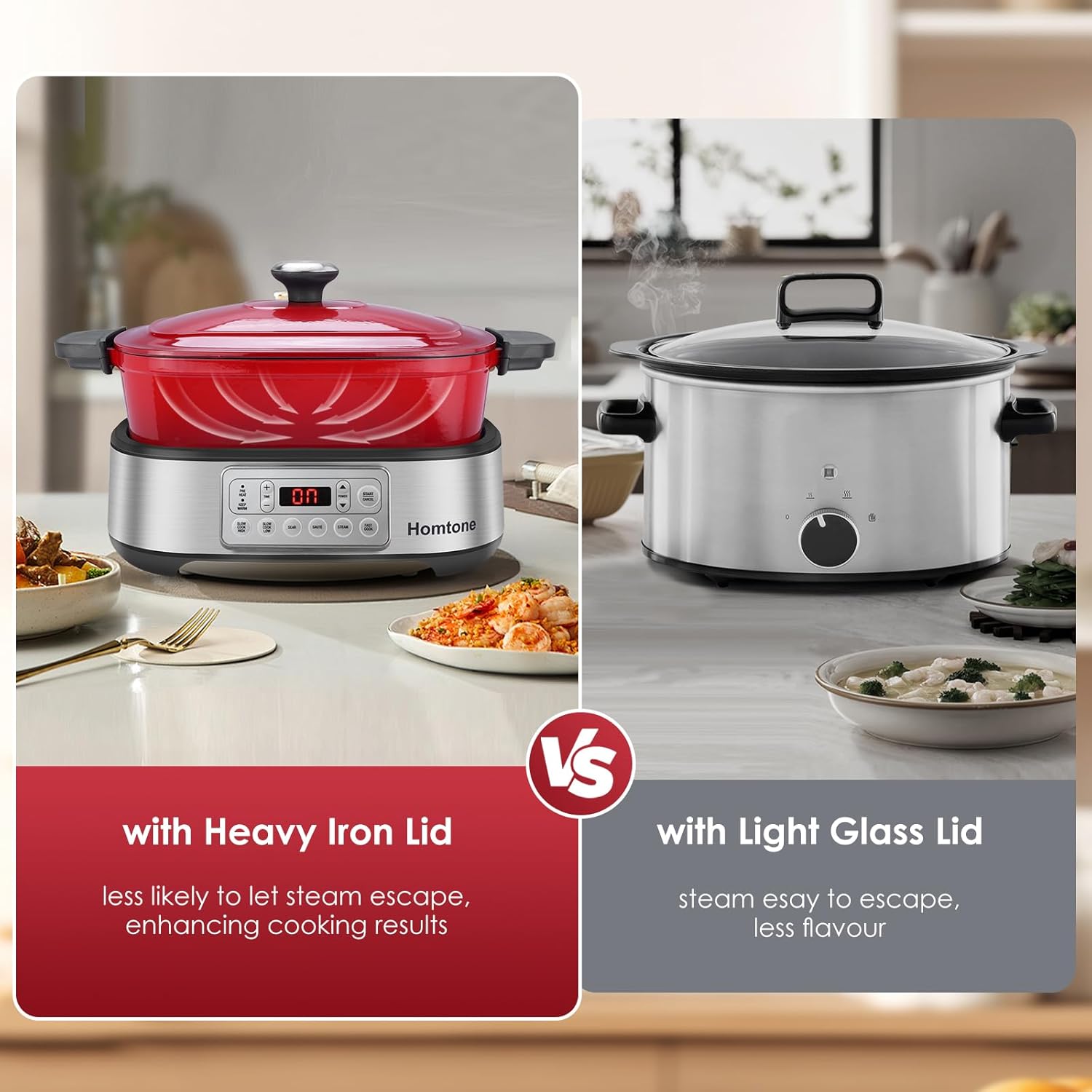 Чугунът осигурява равномерно нагряване и подобрява задържането на топлината, подходящ за бавно готвене.
