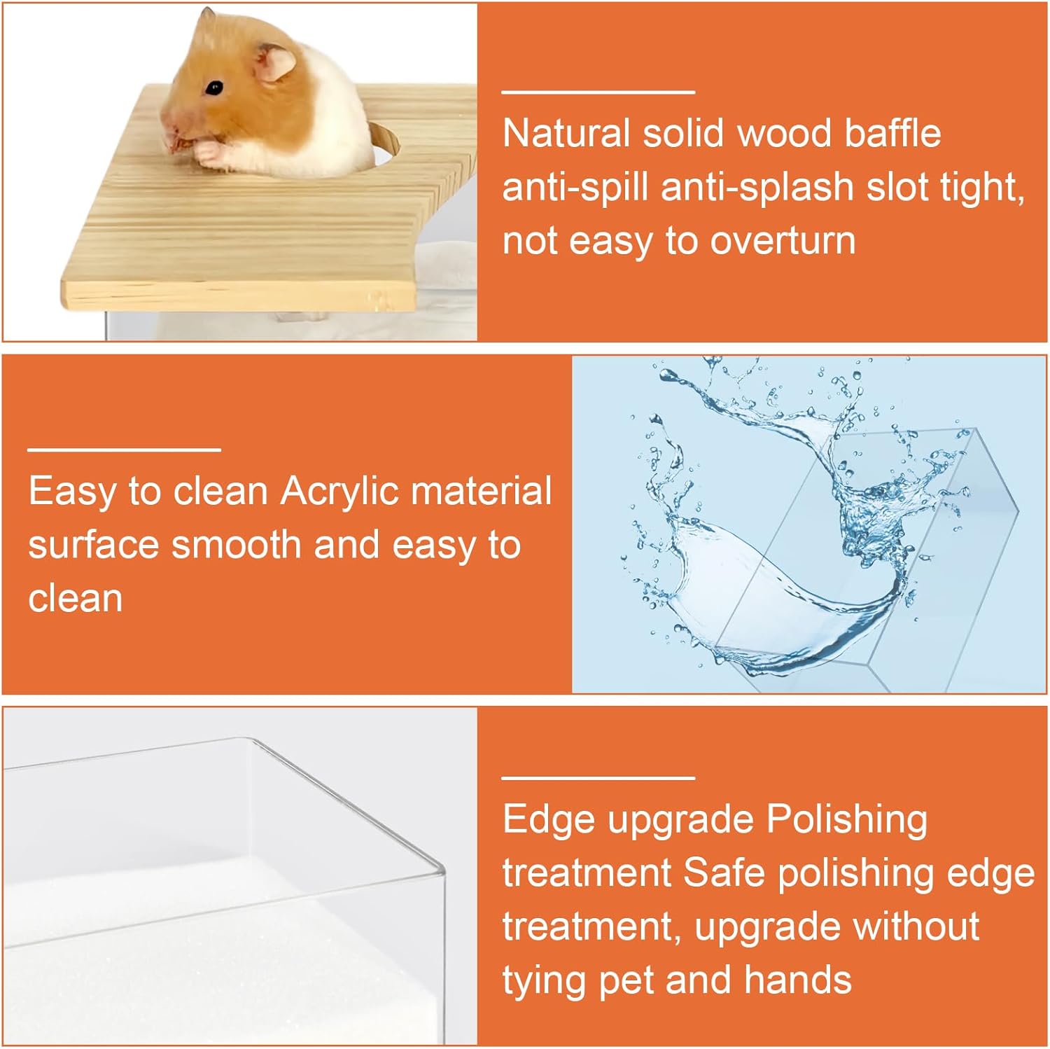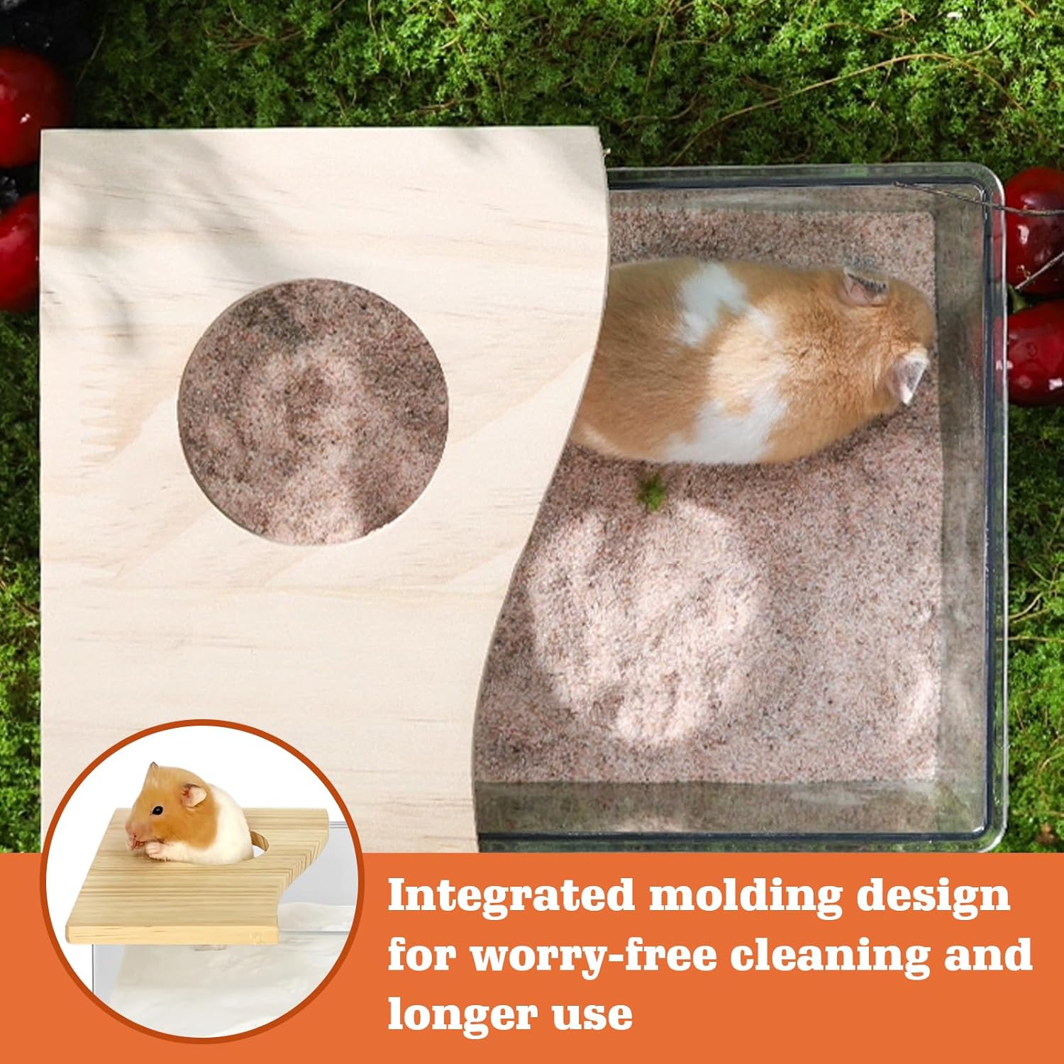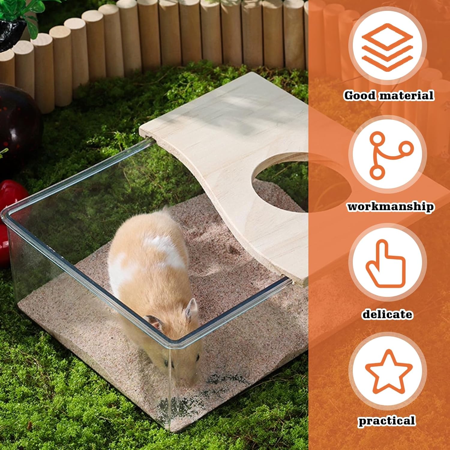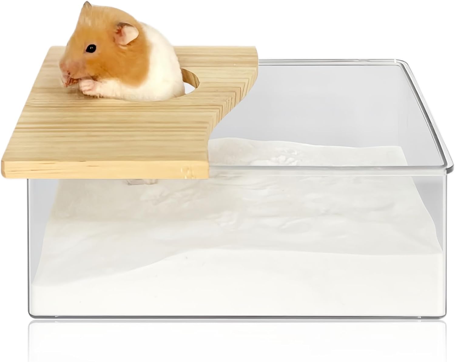 1. ВИСОКОКАЧЕСТВЕНИ МАТЕРИАЛИ Изработена от издръжлив акрил и масивна дървесина, тази пясъчна вана за хамстери създава безопасна и издръжлива среда за хамстери, като чинчили, златни мечки или джербили.