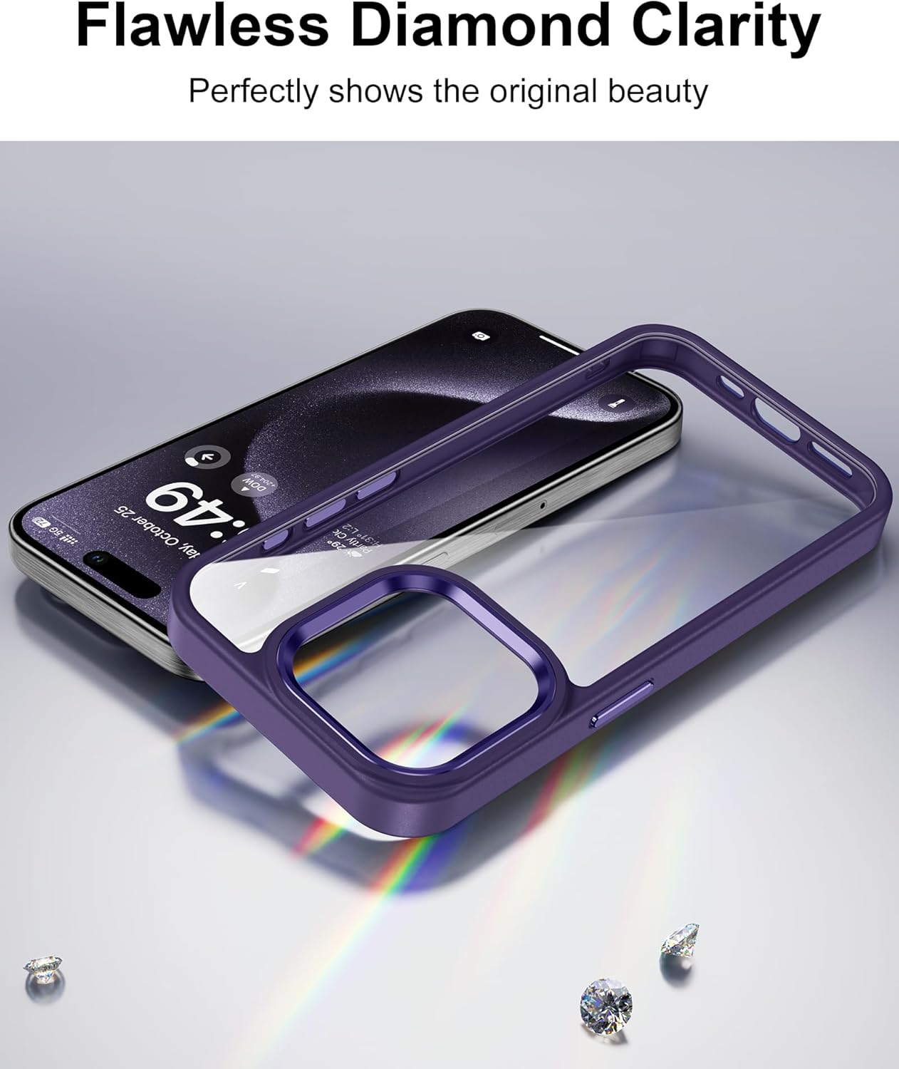 HOOMIL Кристално прозрачен калъф за iPhone 15 Pro, [Анти жълт] [Военен удароустойчив] Калъф за мобилен телефон, прозрачен, твърд, защитен гръб - тъмно лилав