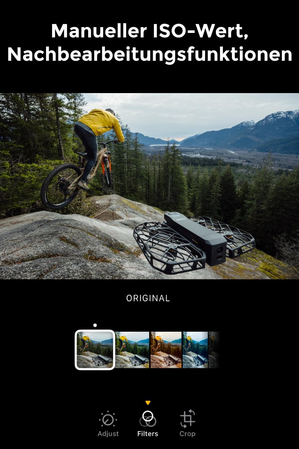 • Летете навсякъде, по всяко време: Иновативният мини дрон OmniTerrain позволява полети над всякакви терени, включително сняг, вода и скали. Просто го вземете със себе си на всяко приключение и заснемете целия пейзаж. С над 10 режима на полет, като например Hover, Zoom Out, Follow и Dolly Track, можете да създавате записи според вашите желания.