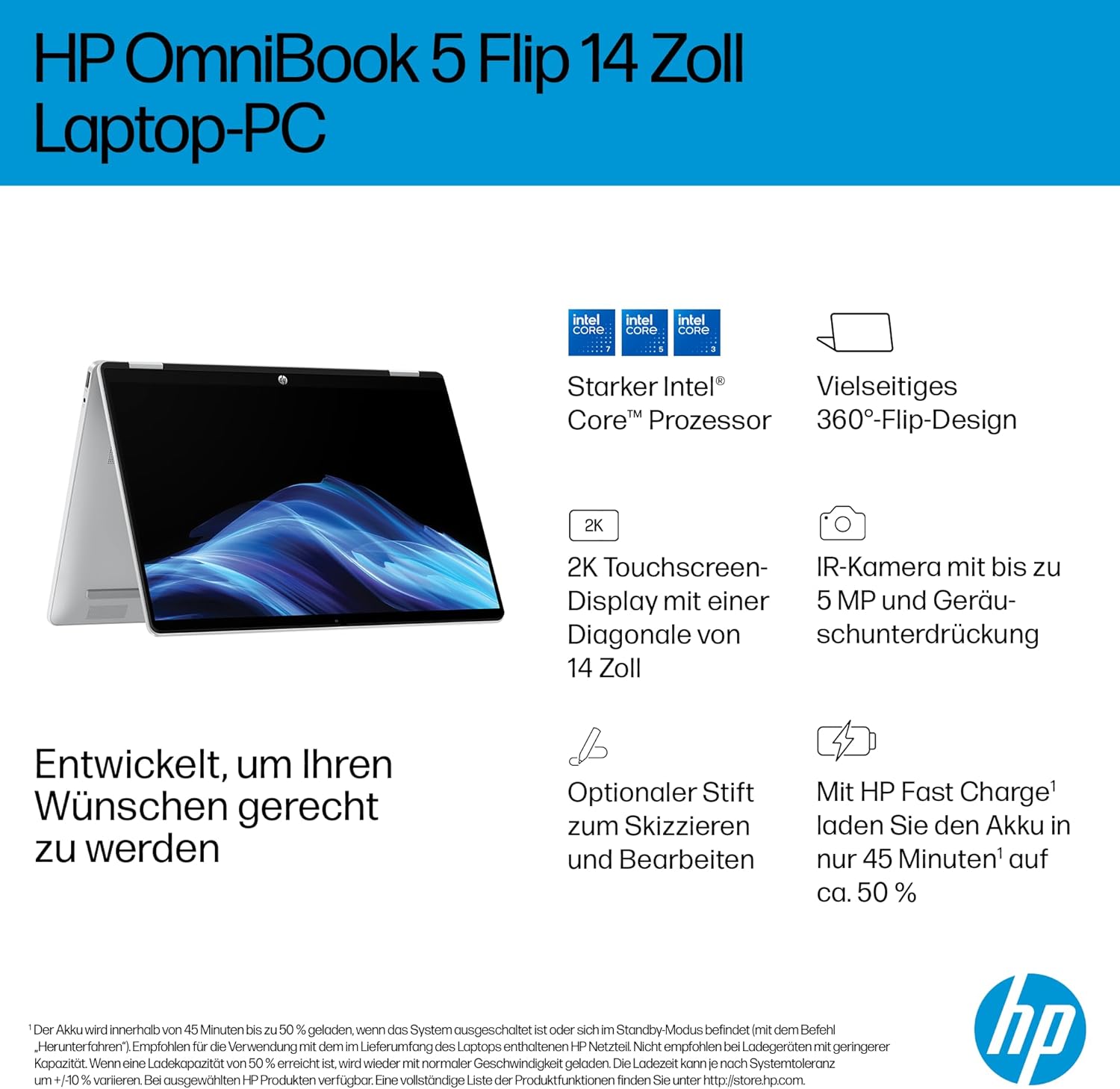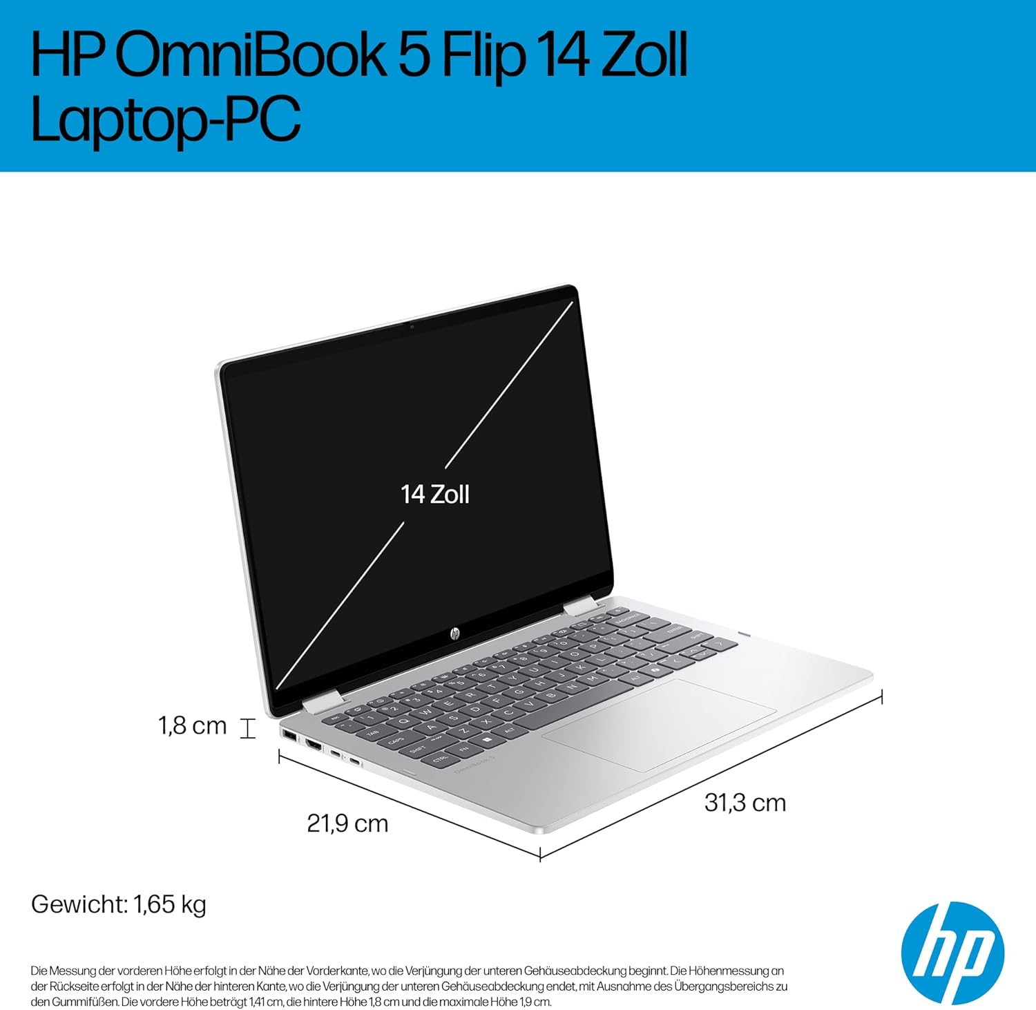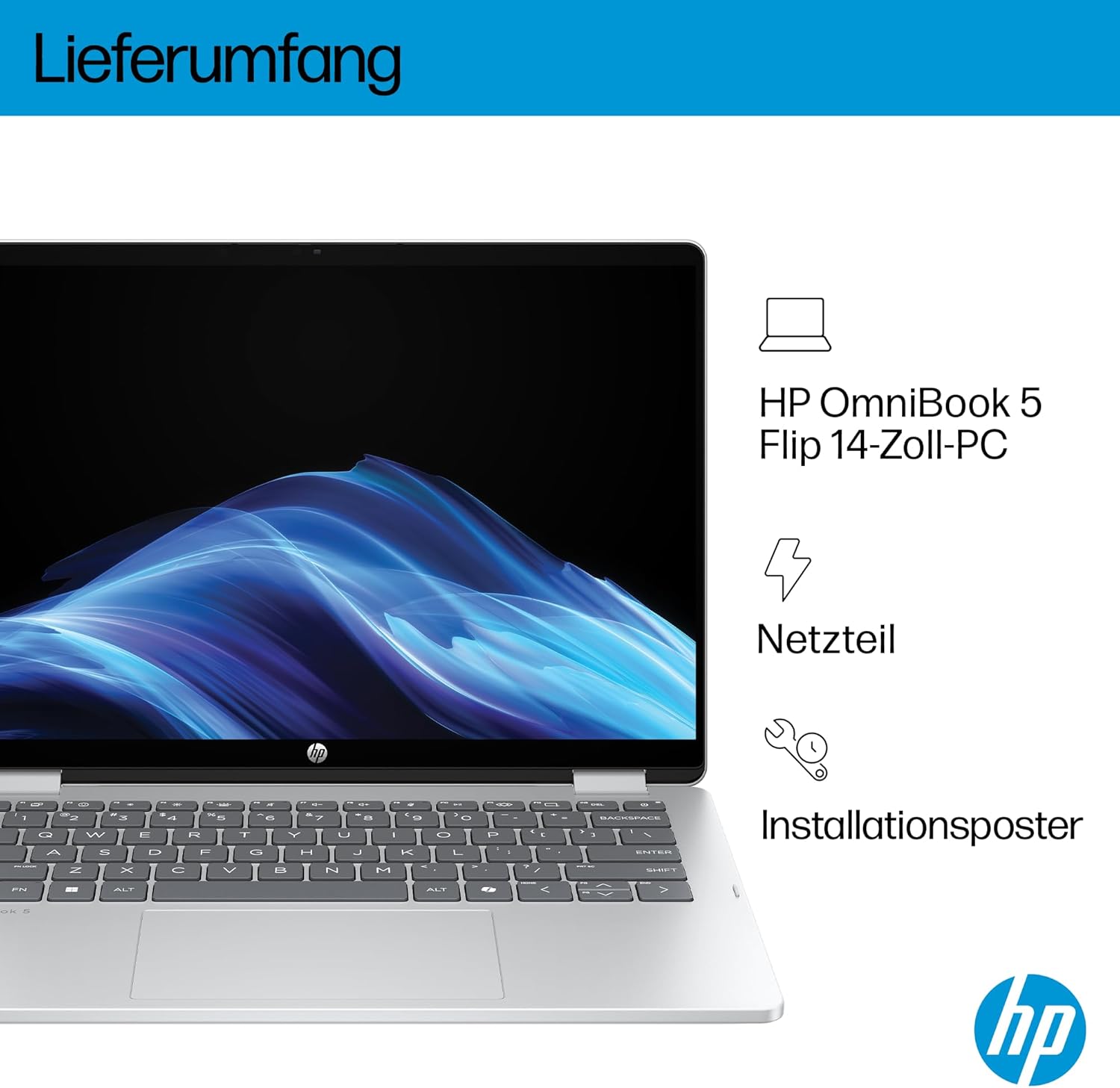 HP OmniBook 5 Flip 14-fp0254ng 2 в 1 конвертируем лаптоп, 14-инчов 2K сензорен екран (1920 x 1200), Intel Core i5-1334U, 16GB RAM, 512GB SSD, QWERTZ, Windows 11 Home, сребрист