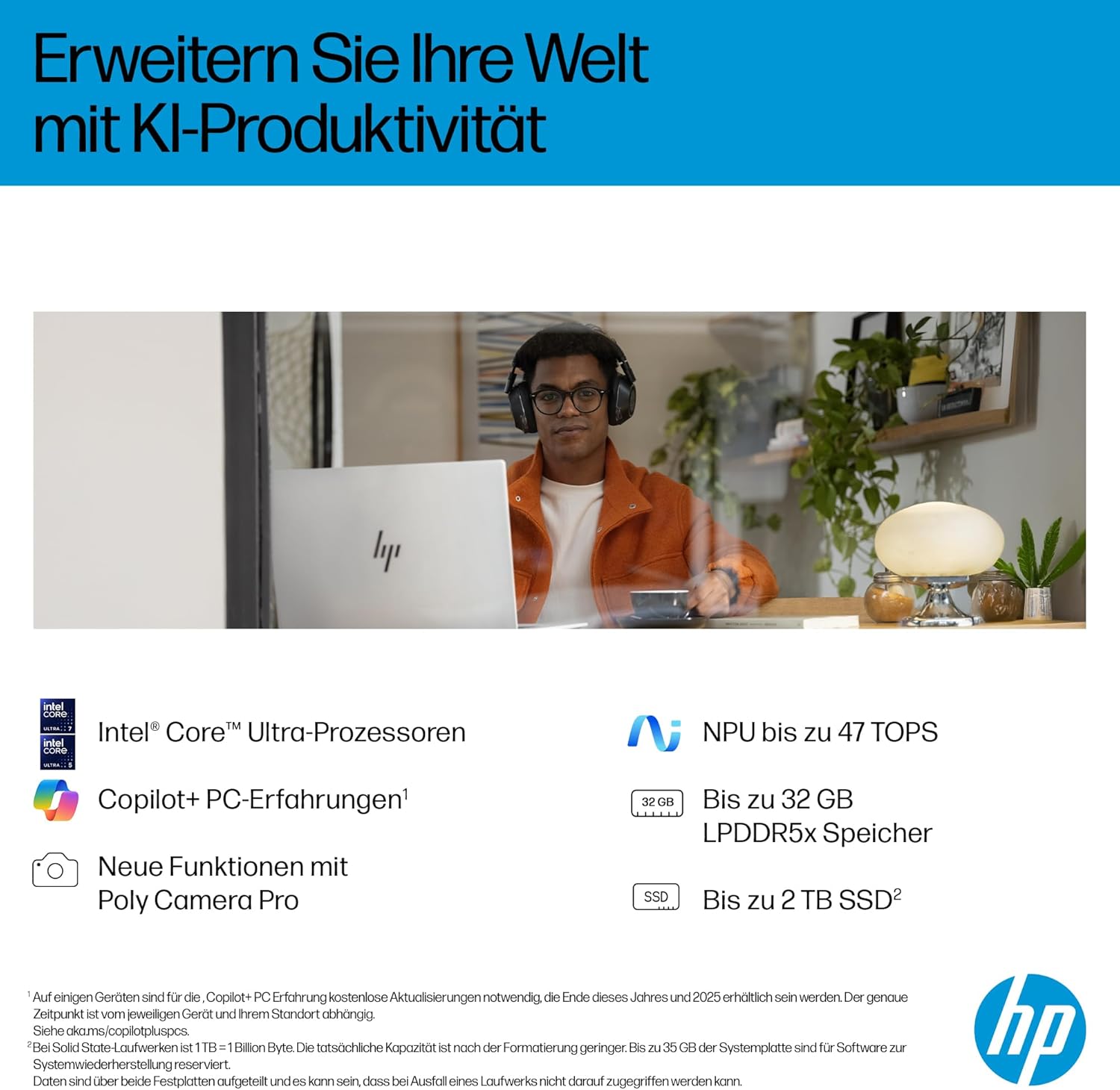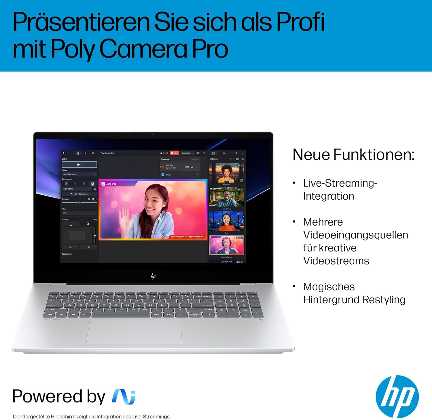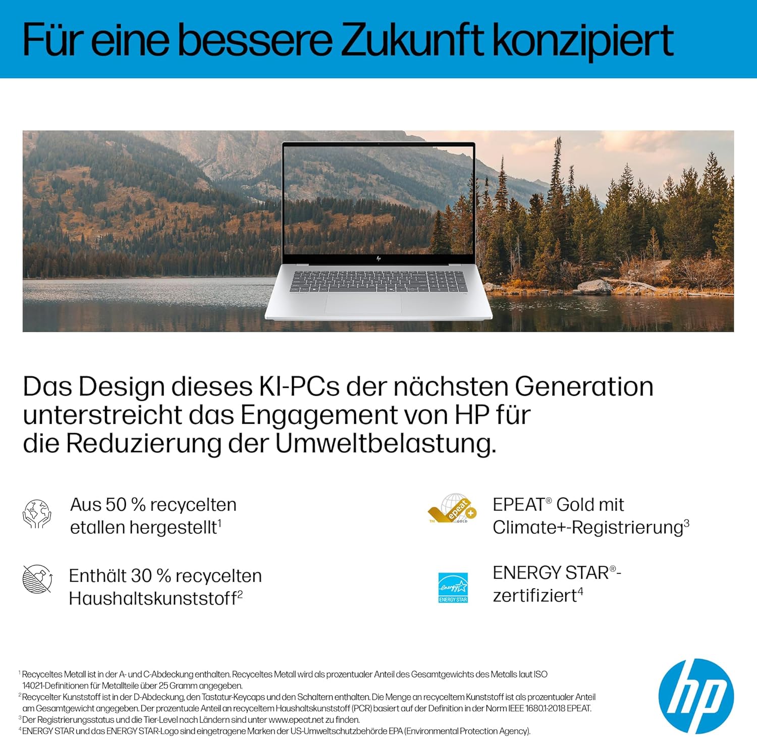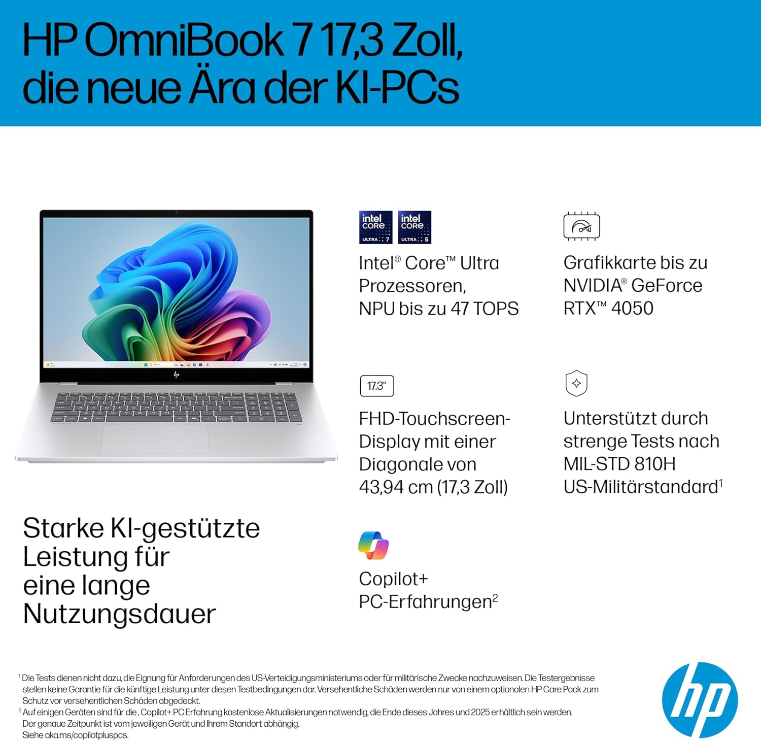 HP OmniBook 7 от следващо поколение AI компютър, Copilot+ компютър, 17,3-инчов FHD сензорен дисплей, Intel Core Ultra 7 258V (47-инчов), 32GB LPDDR5x RAM, 1TB PCIe Gen4 SSD, Intel Arc 140 V GPU, QWERTZ клавиатура, Windows 11, сребрист