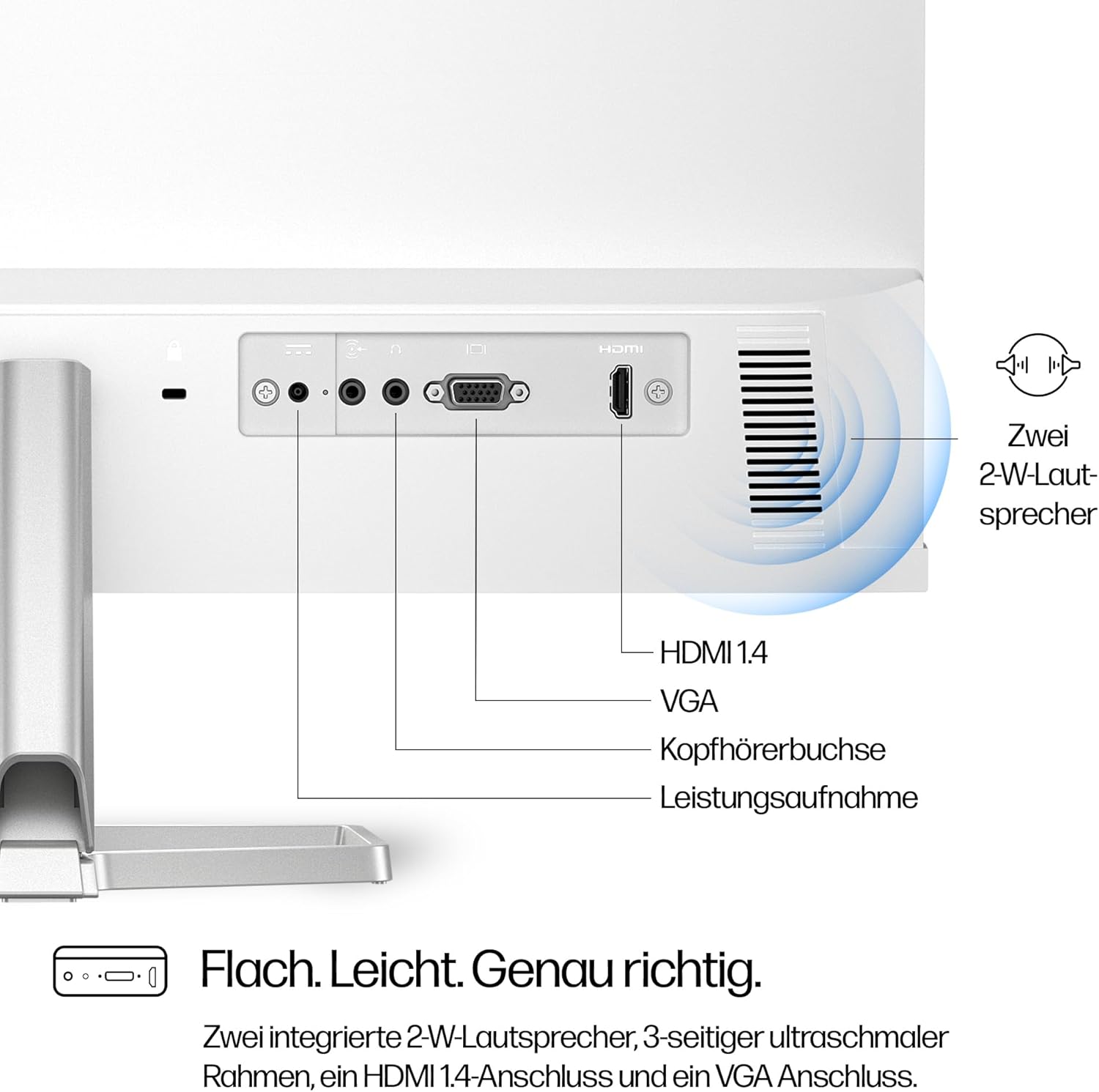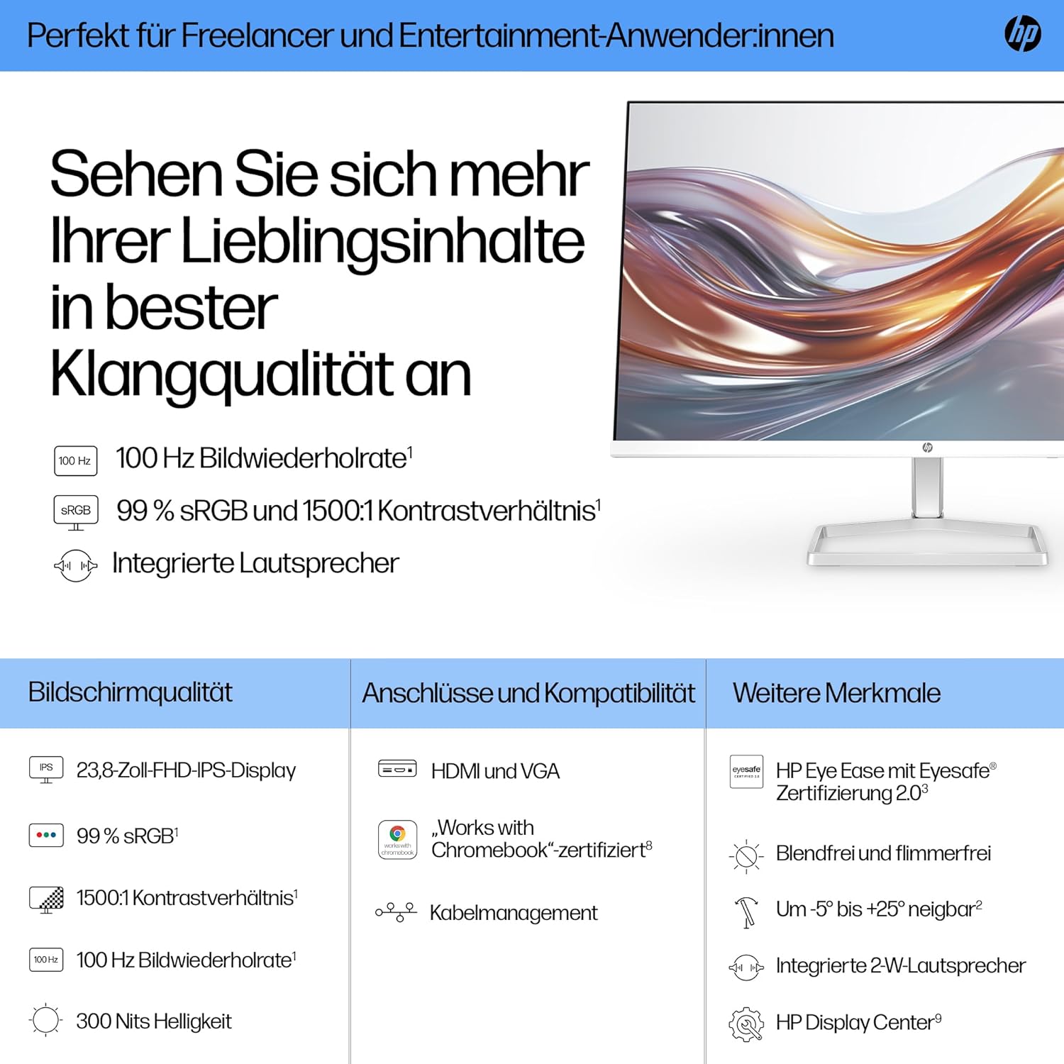 HP серия 5 524sa FHD IPS монитор с високоговорители | 60,5 см (23,8 инча) | 100Hz | 16:9 | 1500:1 контраст | 99% sRGB | HDMI 1.4 | VGA | Антирефлексно покритие | Наклон -5°+25° | Устойчиво произведен | Бял