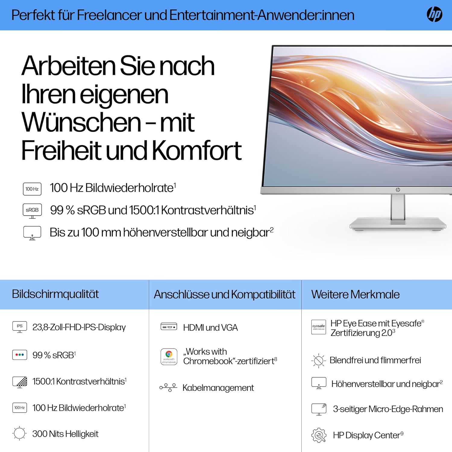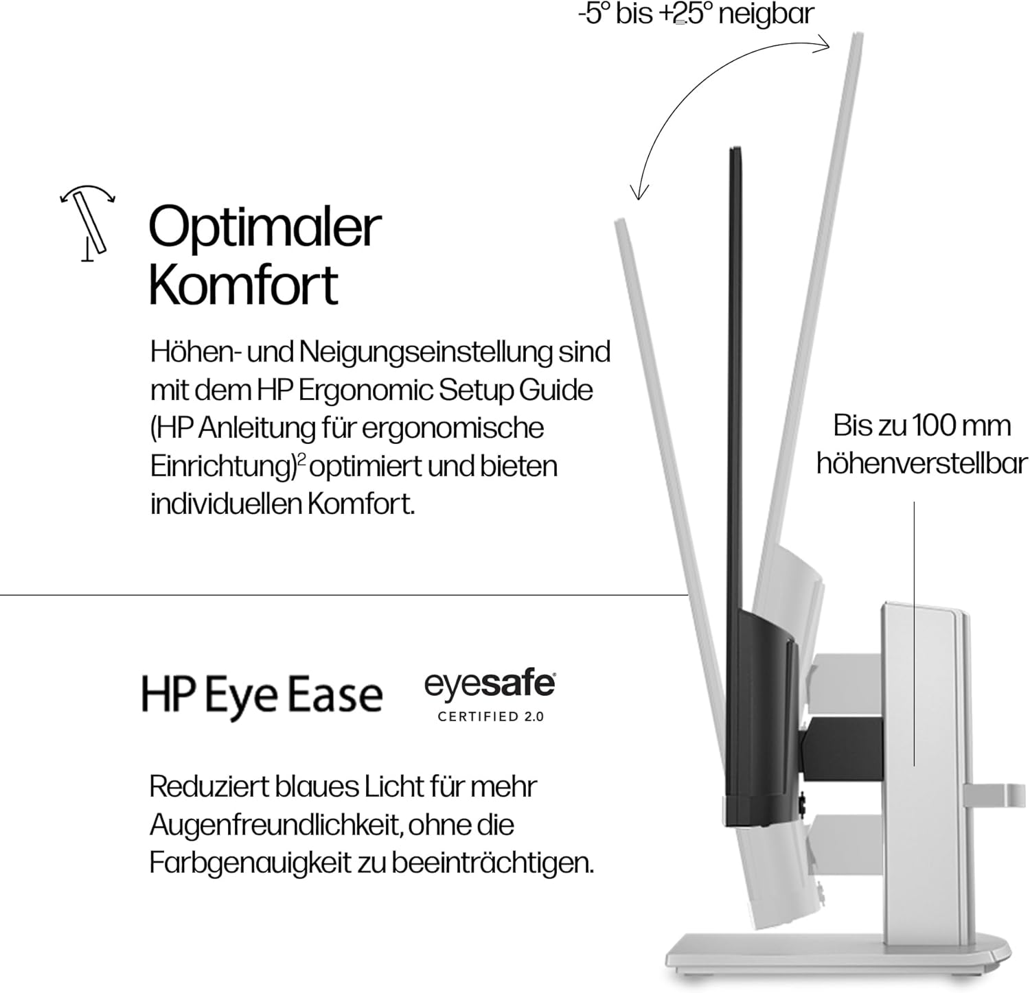 • Технология, щадяща очите: HP Eye Ease със сертификат Eyesafe намалява синята светлина, без да прави компромис с точността на цветовете, осигурявайки комфорт при продължителна работа или игра.