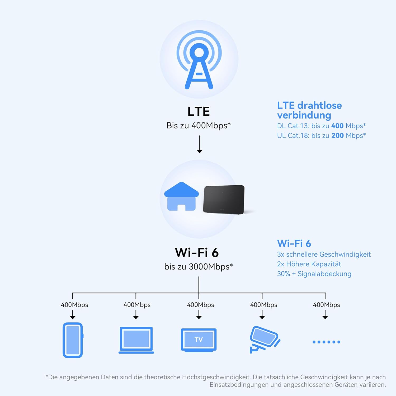 • [Plug and Play]: Просто поставете 4G SIM картата. С HUAWEI 4G CPE 5 устройствата могат да се насладят на невероятна 4G скорост. Не е необходима конфигурация и отключва мрежите на всички оператори.