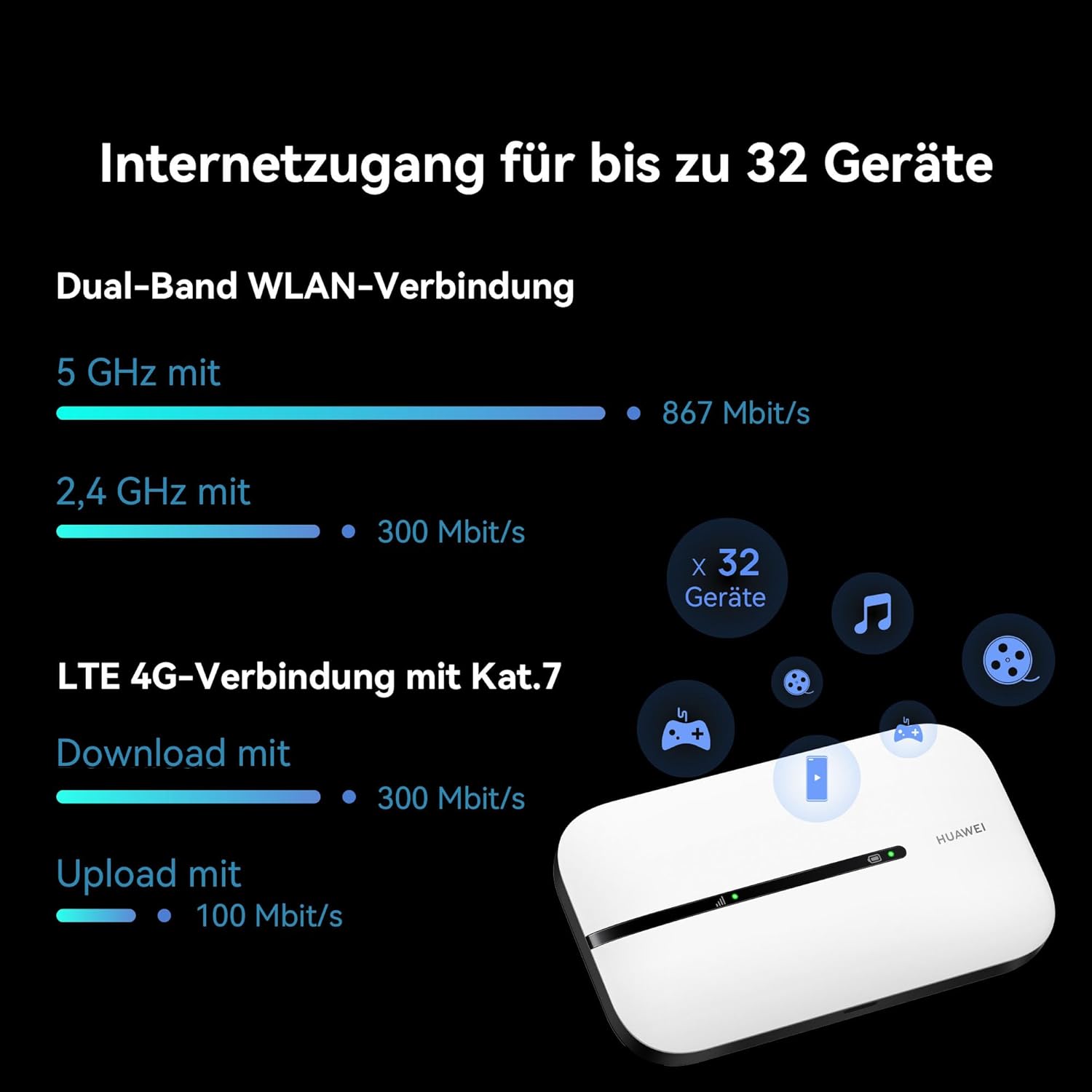 HUAWEI 4G Мобилен WiFi 3s (Тип C), Рутер, Преносима мобилна точка за достъп, Мобилен рутер Cat 7 със SIM карта, LTE с 300 Mbps сваляне, Съвместим с всички SIM карти, 30 месеца гаранция