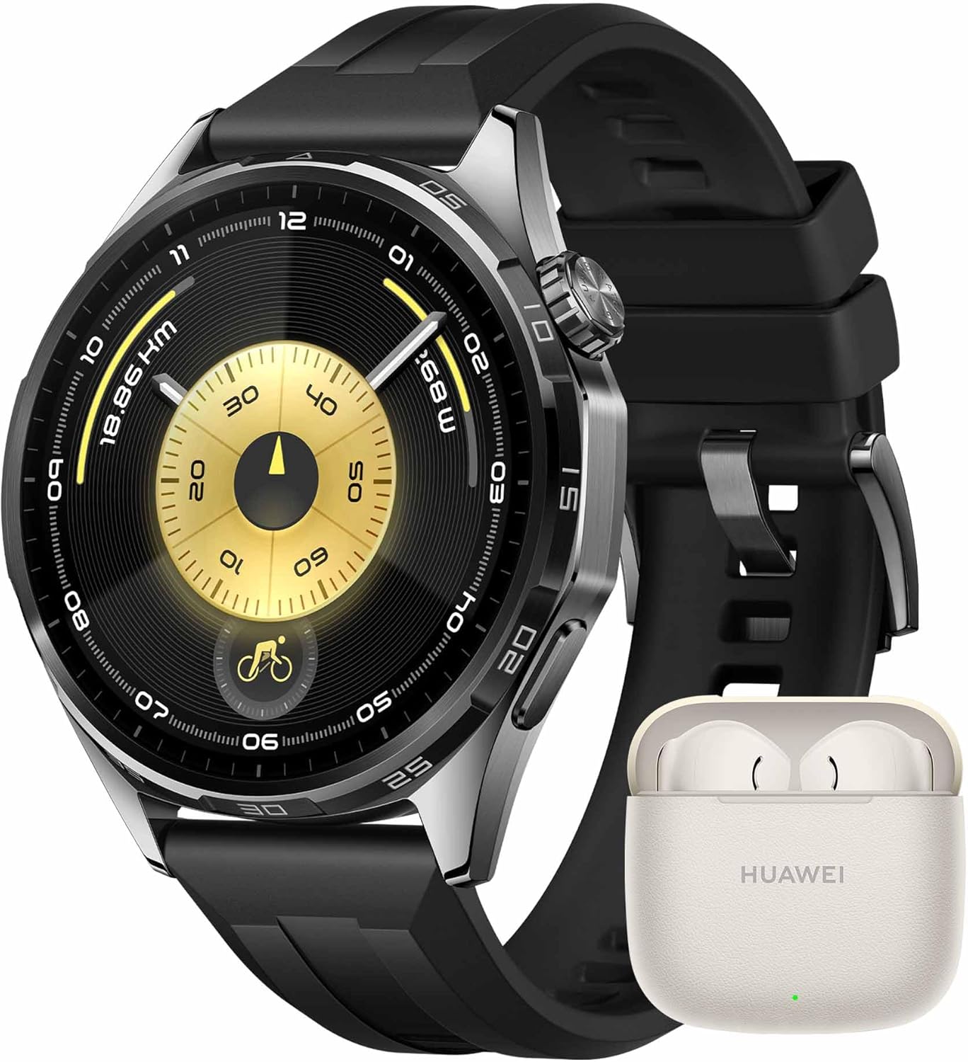 HUAWEI Watch GT 6 Smartwatch + FreeBuds SE 3 Бежов, GPS, AMOLED дисплей, Батерия до 21 дни, Колоездене, Съвместим с Android и iOS, Мониторинг на здравето, Емоционално благополучие, Черен, 46 мм