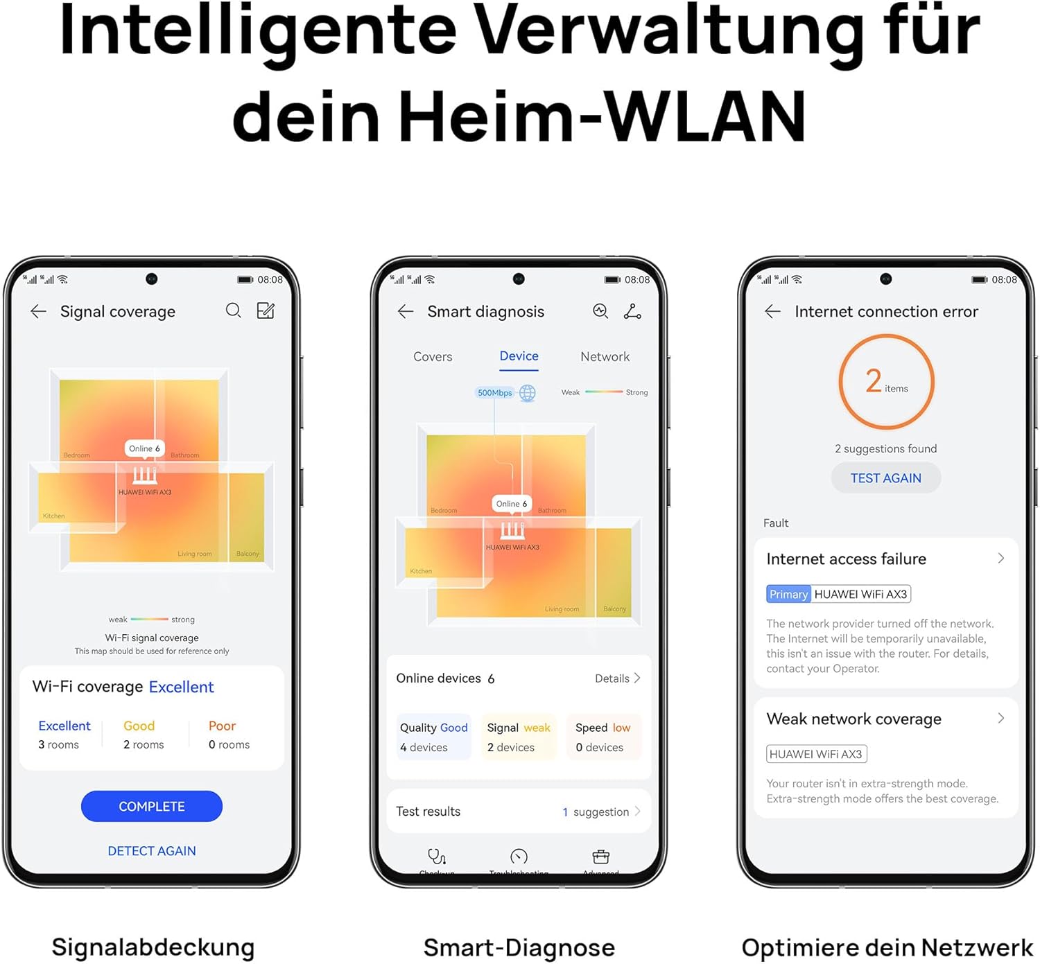 • Визуализирана WiFi диагностика: Използвайте приложението Huawei AI Life, за да създадете топлинна карта с едно щракване и да видите мрежовото покритие в реално време. То също така поддържа откриване и диагностициране на мрежови грешки в повече от 80 сценария.