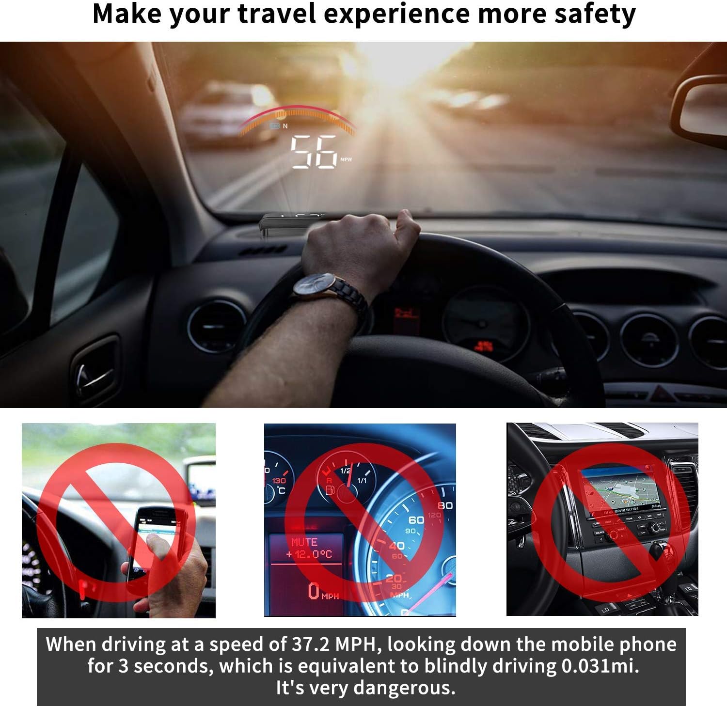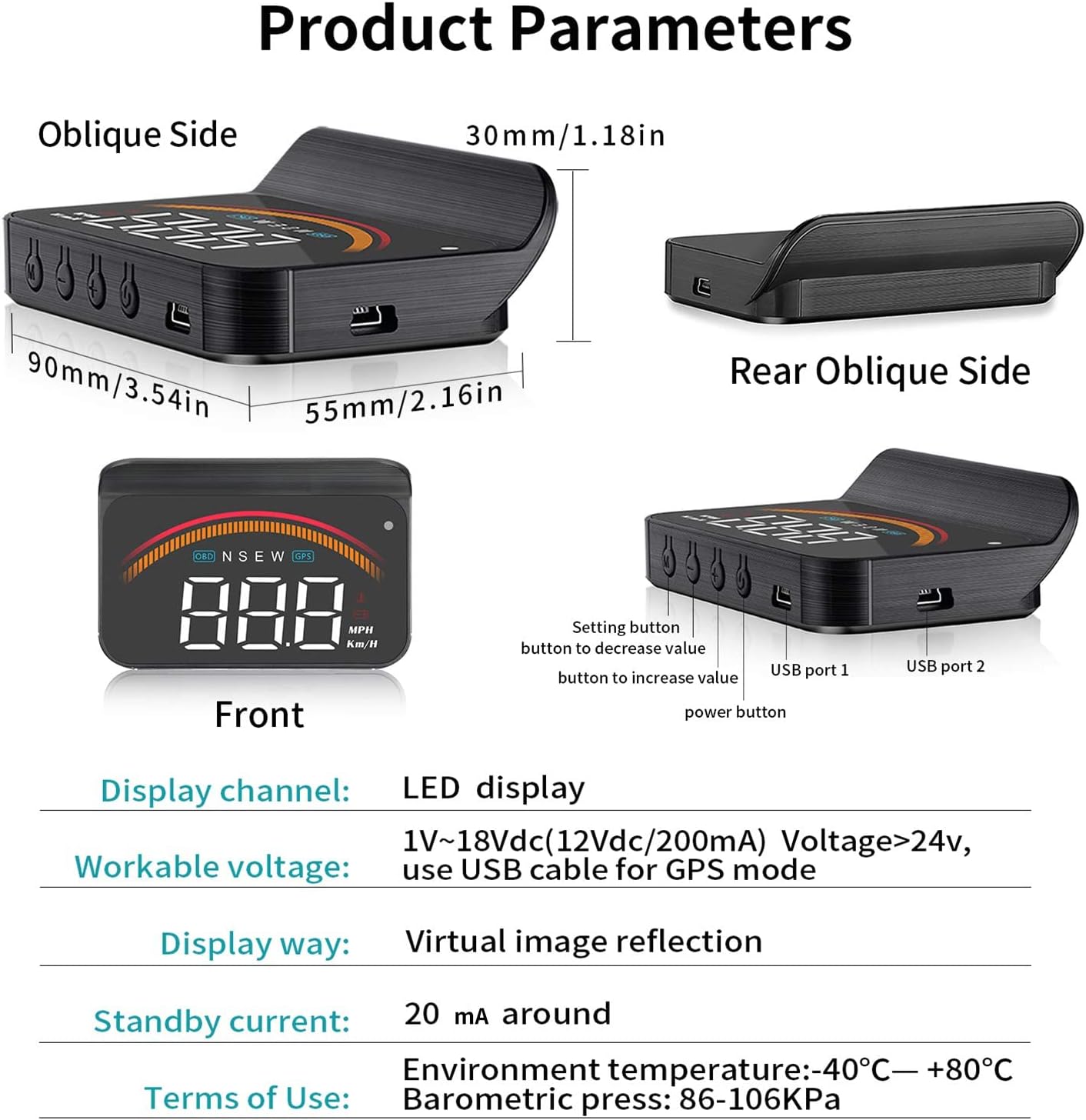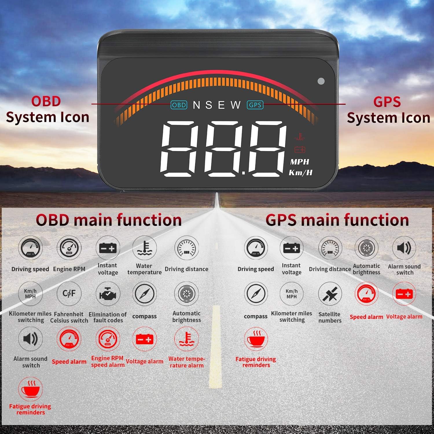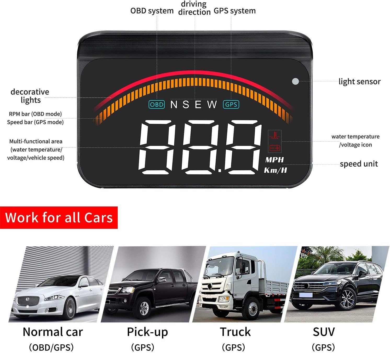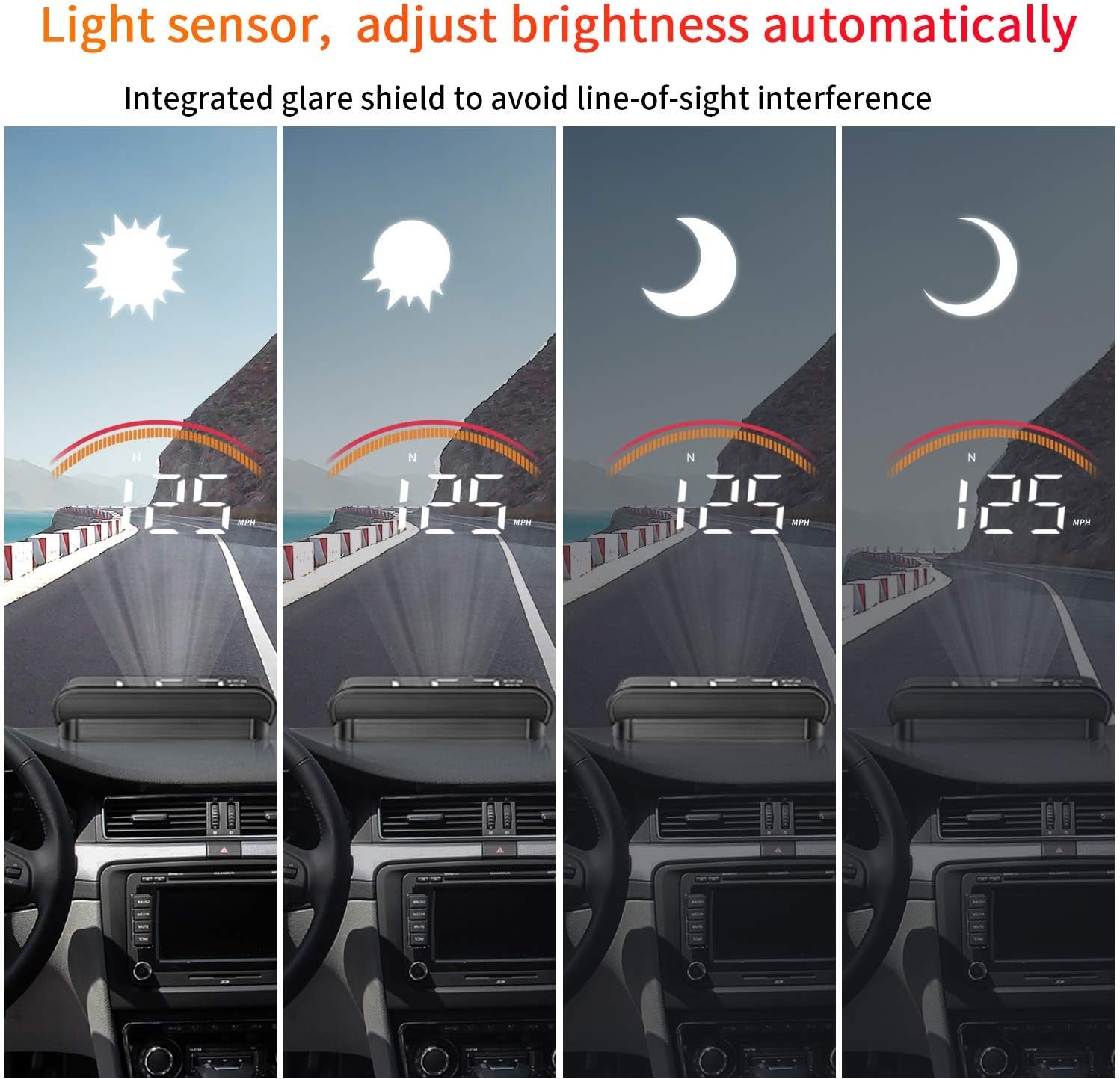 • 【3,5-инчов LED дисплей】 Автомобилният HUD дисплей проектира информация върху предното стъкло, което улеснява четенето по време на шофиране. Големи, ясни изображения, капак над екрана и сензор за светлина позволяват на екрана автоматично да регулира яркостта си според околните условия. Всички тези функции допринасят за по-безопасно и лесно шофиране.