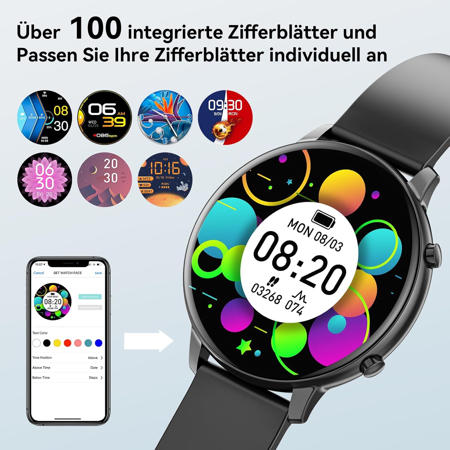 • 1,39-инчов сензорен екран с висока резолюция: Смарт часовникът разполага с голям 1,39-инчов сензорен екран, който осигурява превъзходно HD качество на изображението, технология на пълен сензорен екран, естетика и лек формат, с избор от повече от 100 циферблата и поддръжка на персонализирани циферблати.